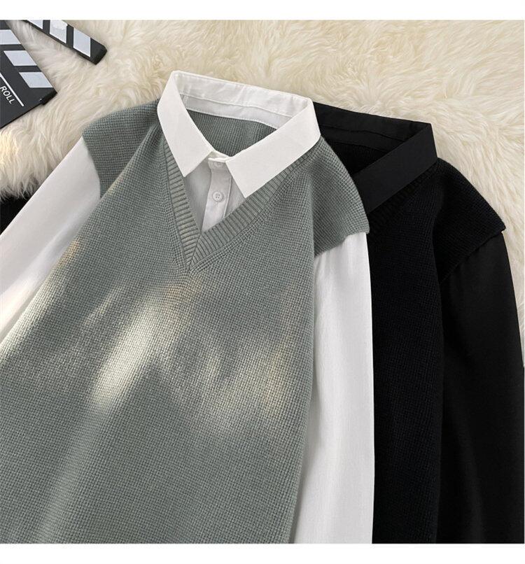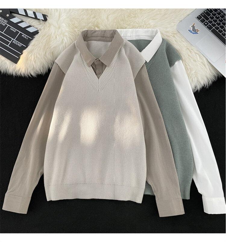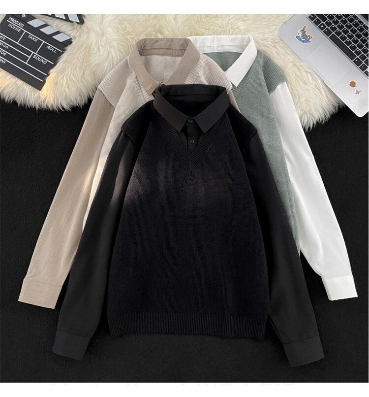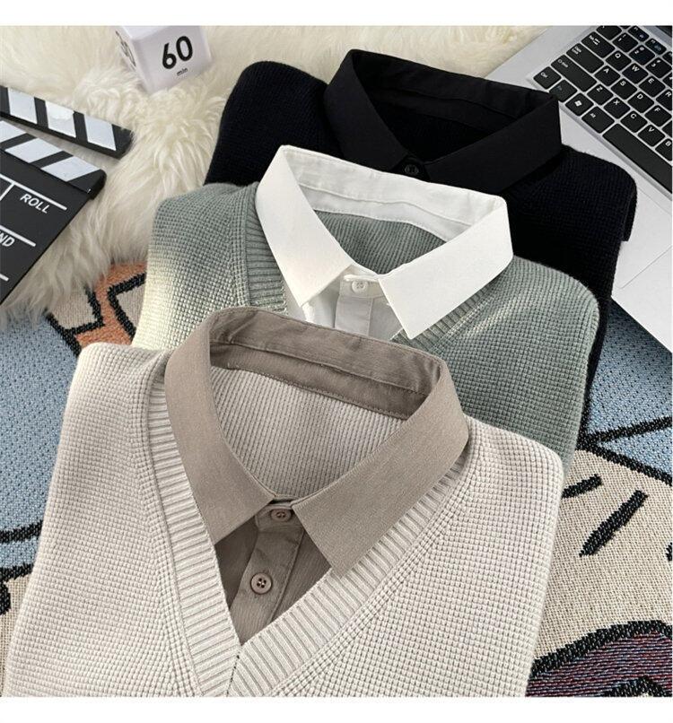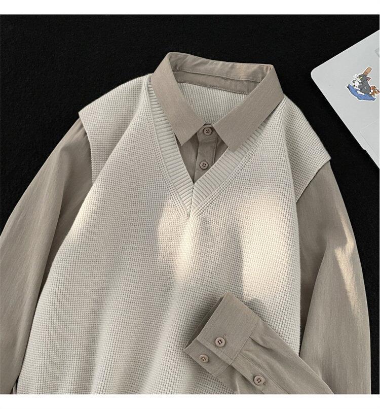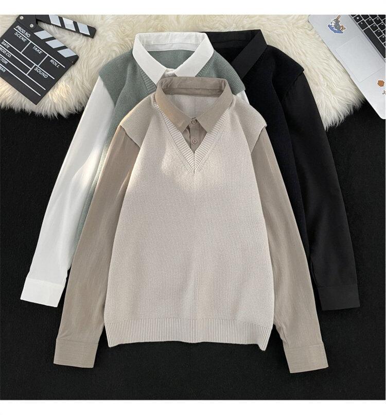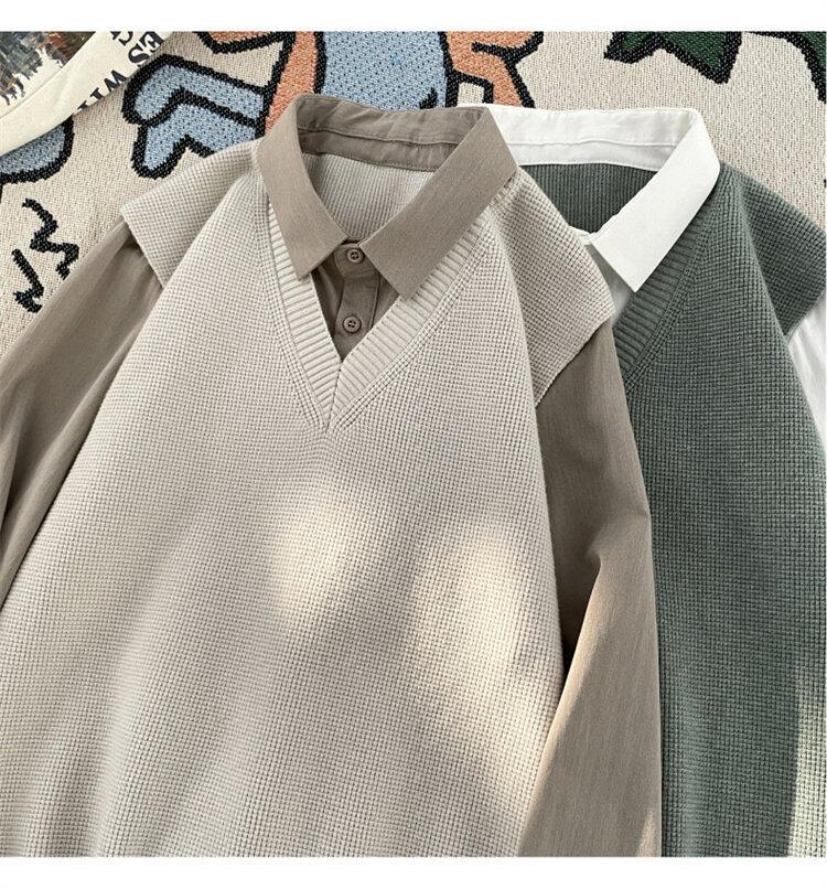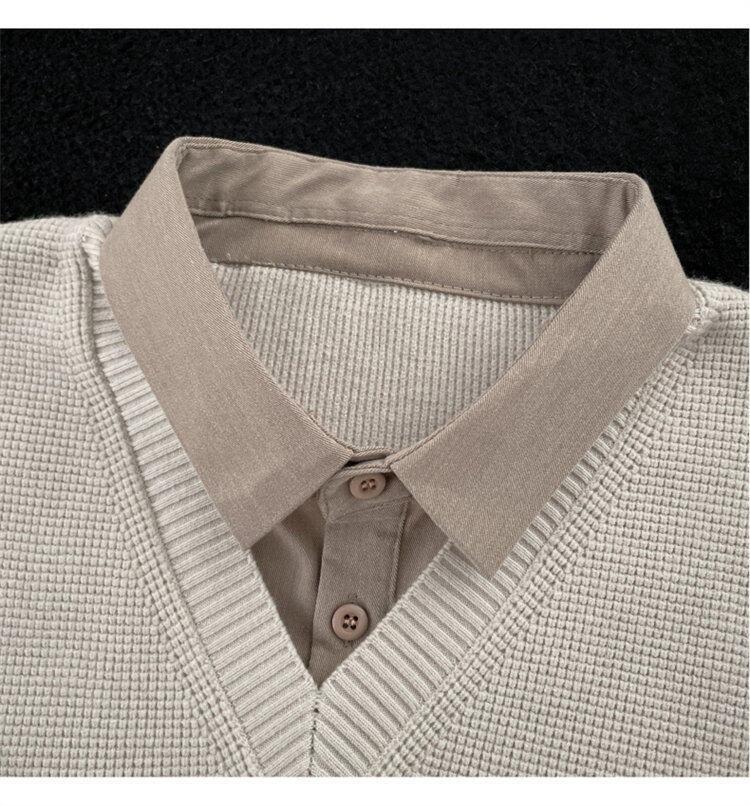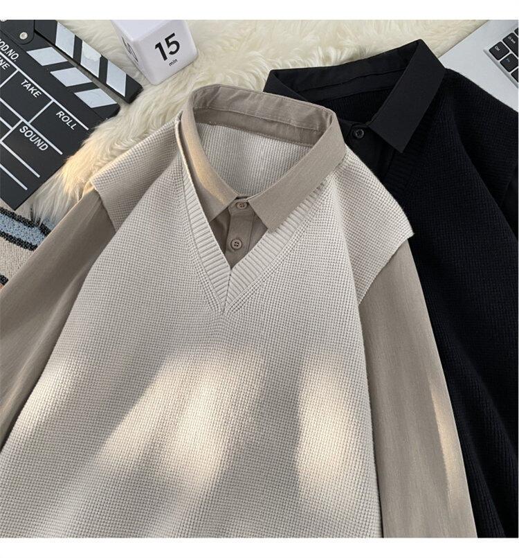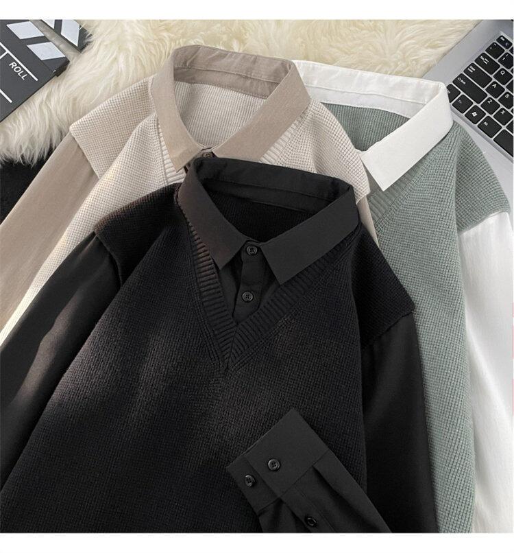 Suéter de camisa de manga larga de dos piezas falso para hombre, otoño e invierno, nuevo estilo perezoso, suéter de punto de moda que combina con todo.