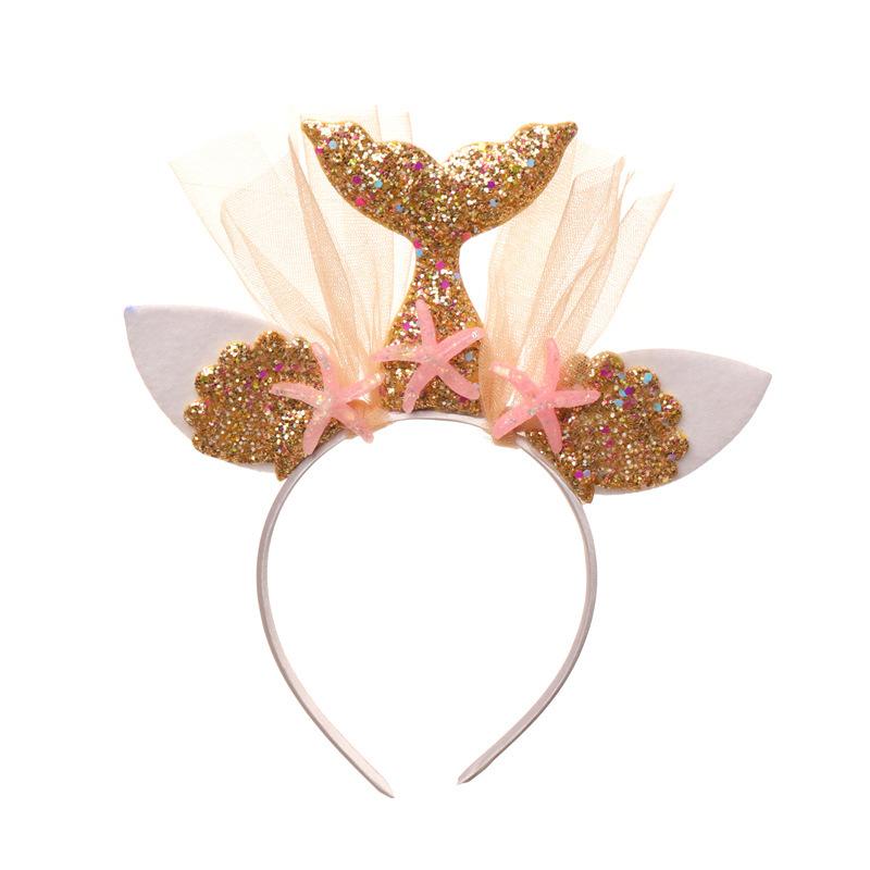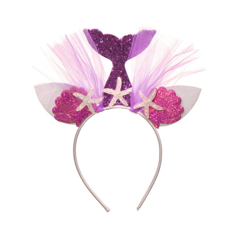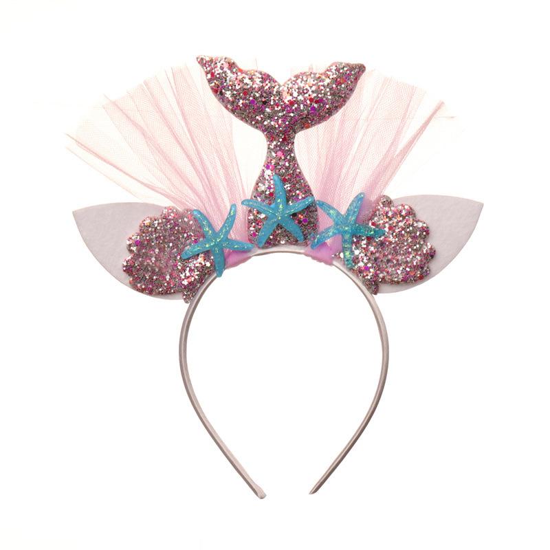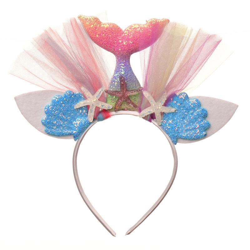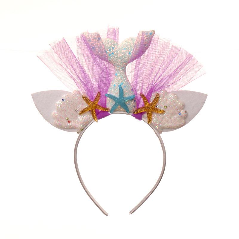 Diadema de malla con cola de sirena colorida para niños, tocado para fiestas navideñas, tocado de sirena con estrella de mar, horquilla de princesa