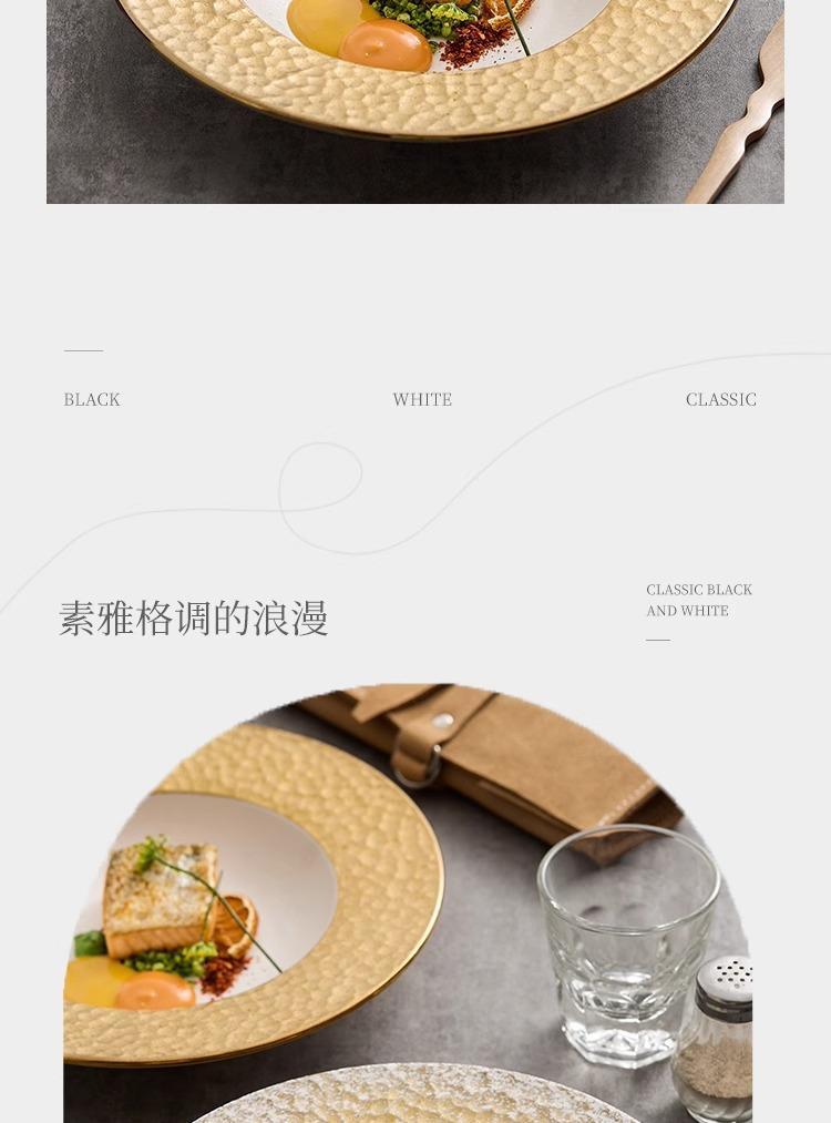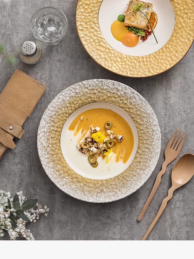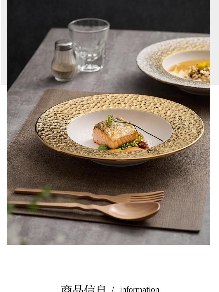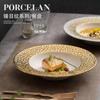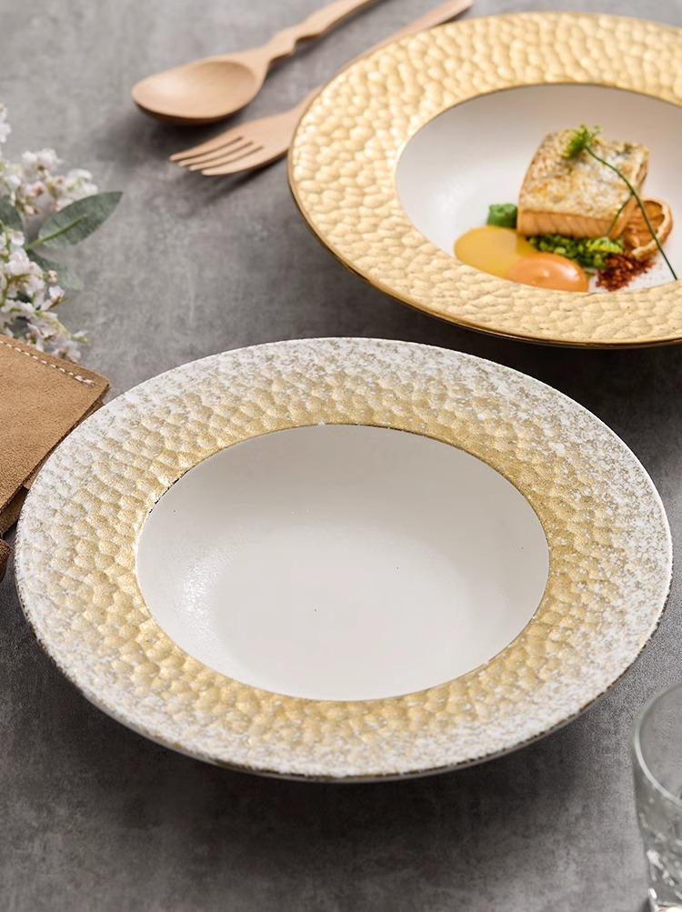 Plato de cerámica creativo para cena, vajilla de hotel, venta al por mayor, restaurante, plato de sopa occidental dorado, plato de ensalada premium 2024