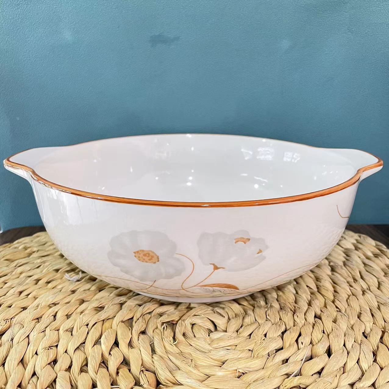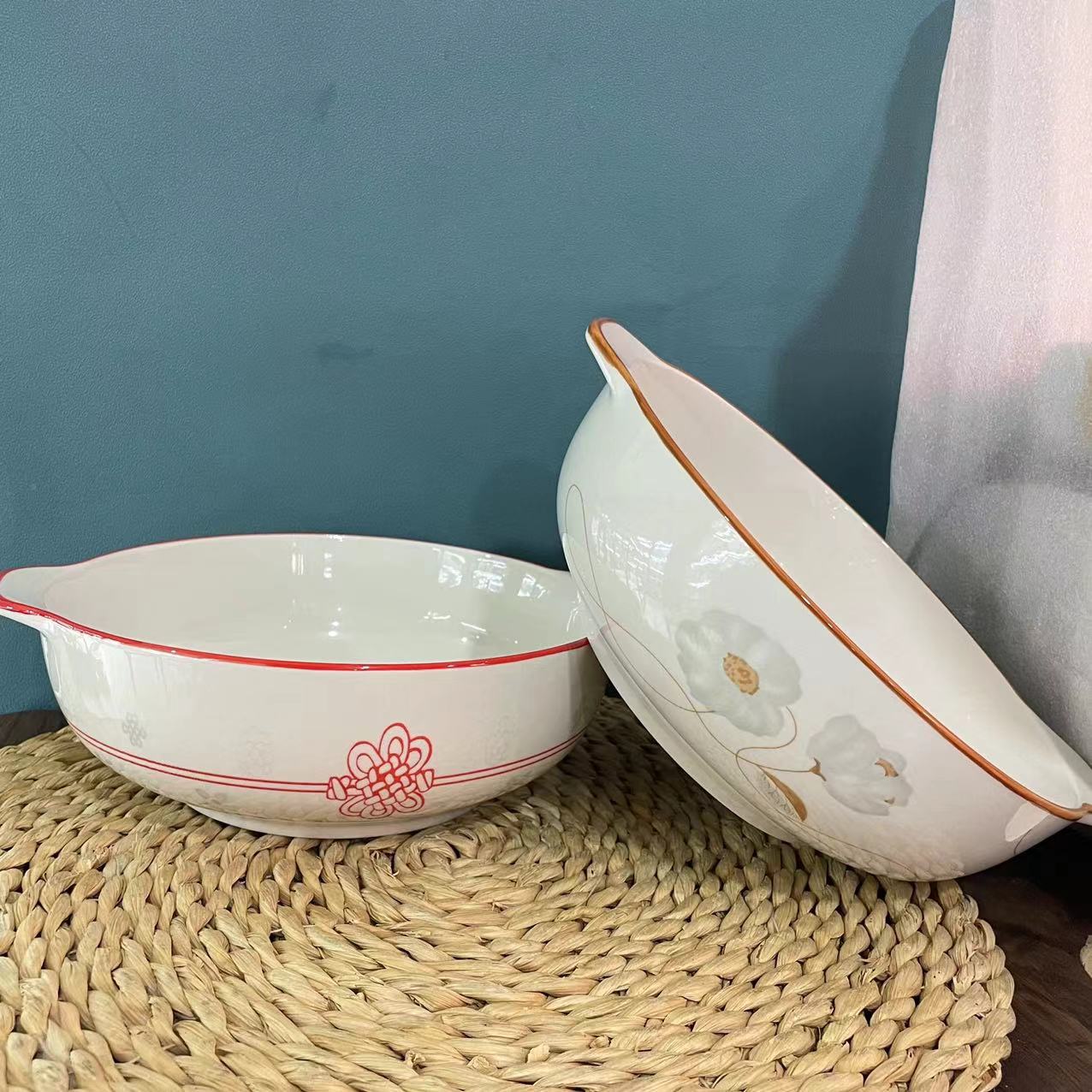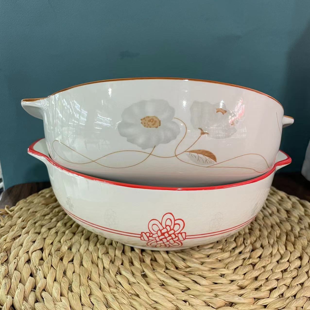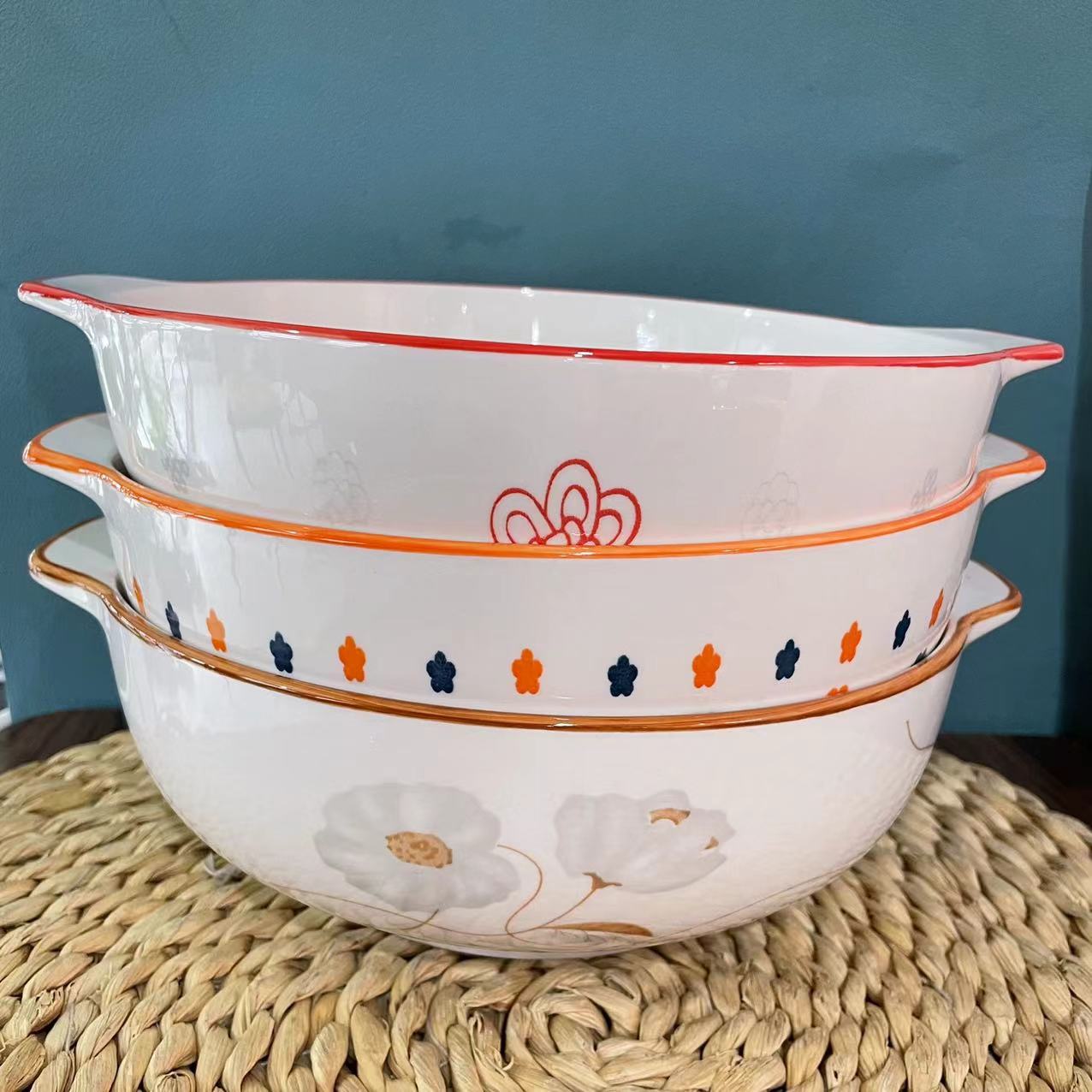 Tazón de sopa de cerámica binaural de 10,25 pulgadas, tazón grande para el hogar con impresión bajo esmaltado, tazón de sopa de cerámica para microondas