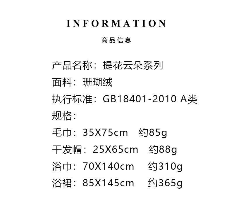 [bath towel 70*140cm]], [bath skirt 85*145cm]], [towel 35*75cm]], [hair hat 25*65cm]]