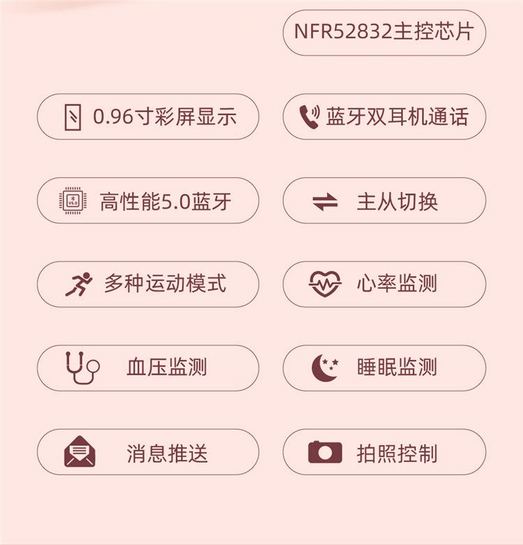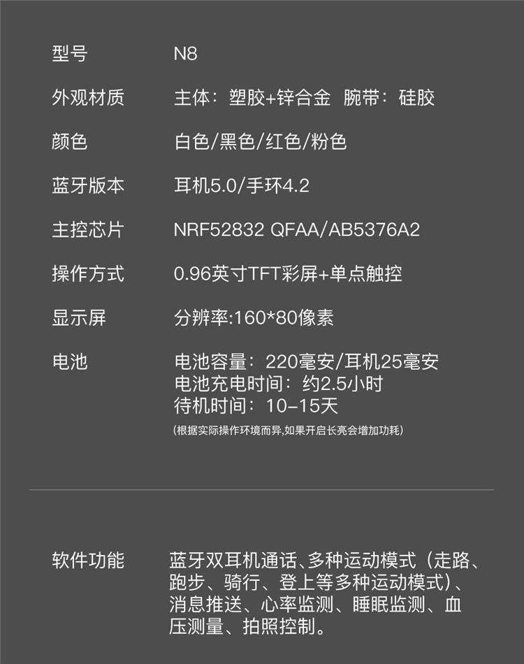 | Función principal | Llamadas con audífonos Bluetooth duales, múltiples modos deportivos, envío de mensajes, monitoreo de frecuencia cardíaca, monitoreo del sueño, medición de presión arterial, clima, 0.96 pulgadas. | |||