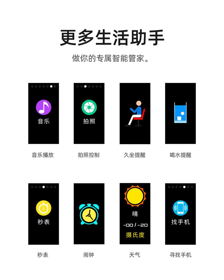 | Selección de carátula, envío de mensajes, alarma diaria, control de fotos, recordatorio de sedentarismo, encontrar teléfono, encontrar pulsera | ||||