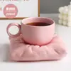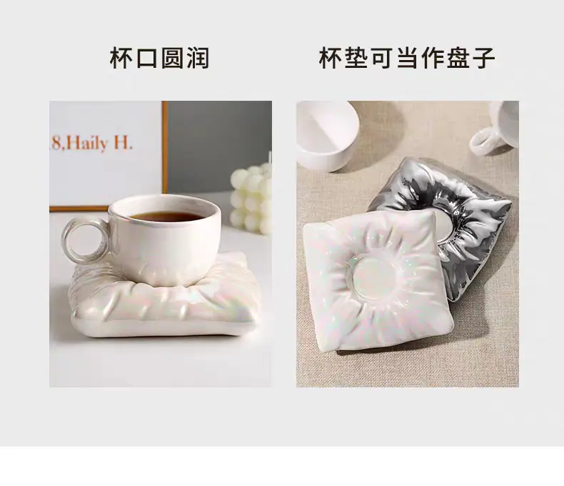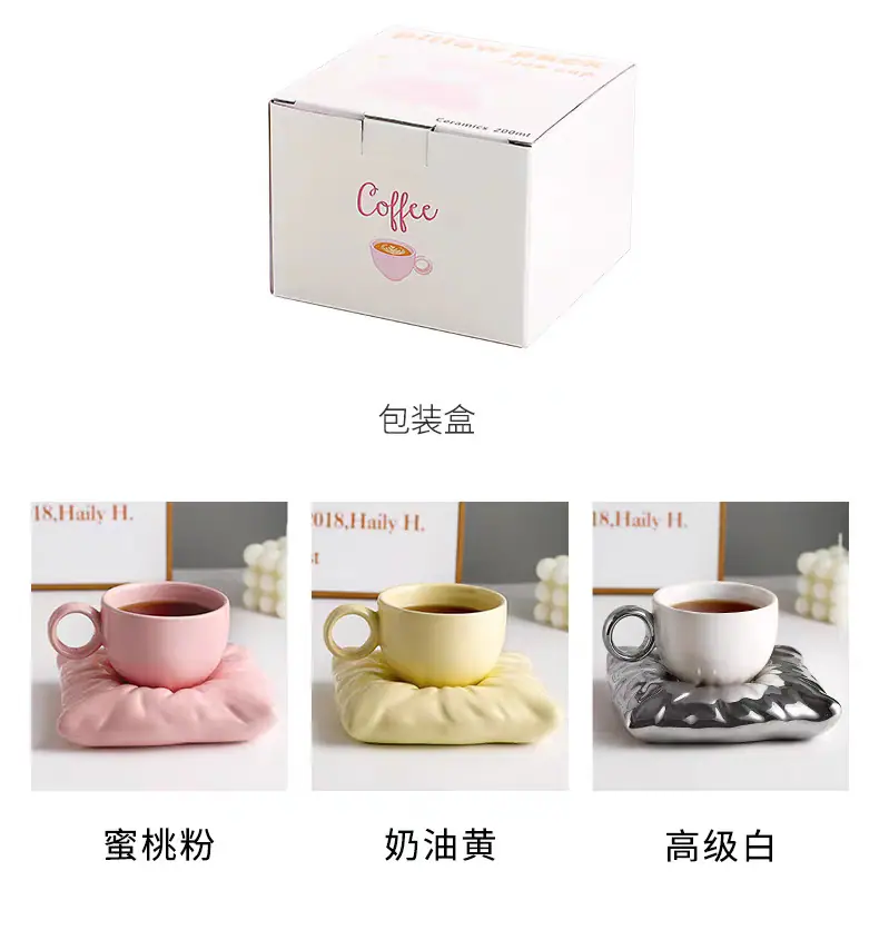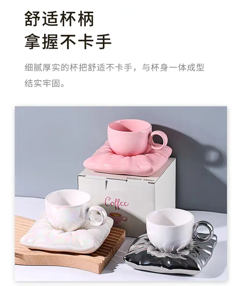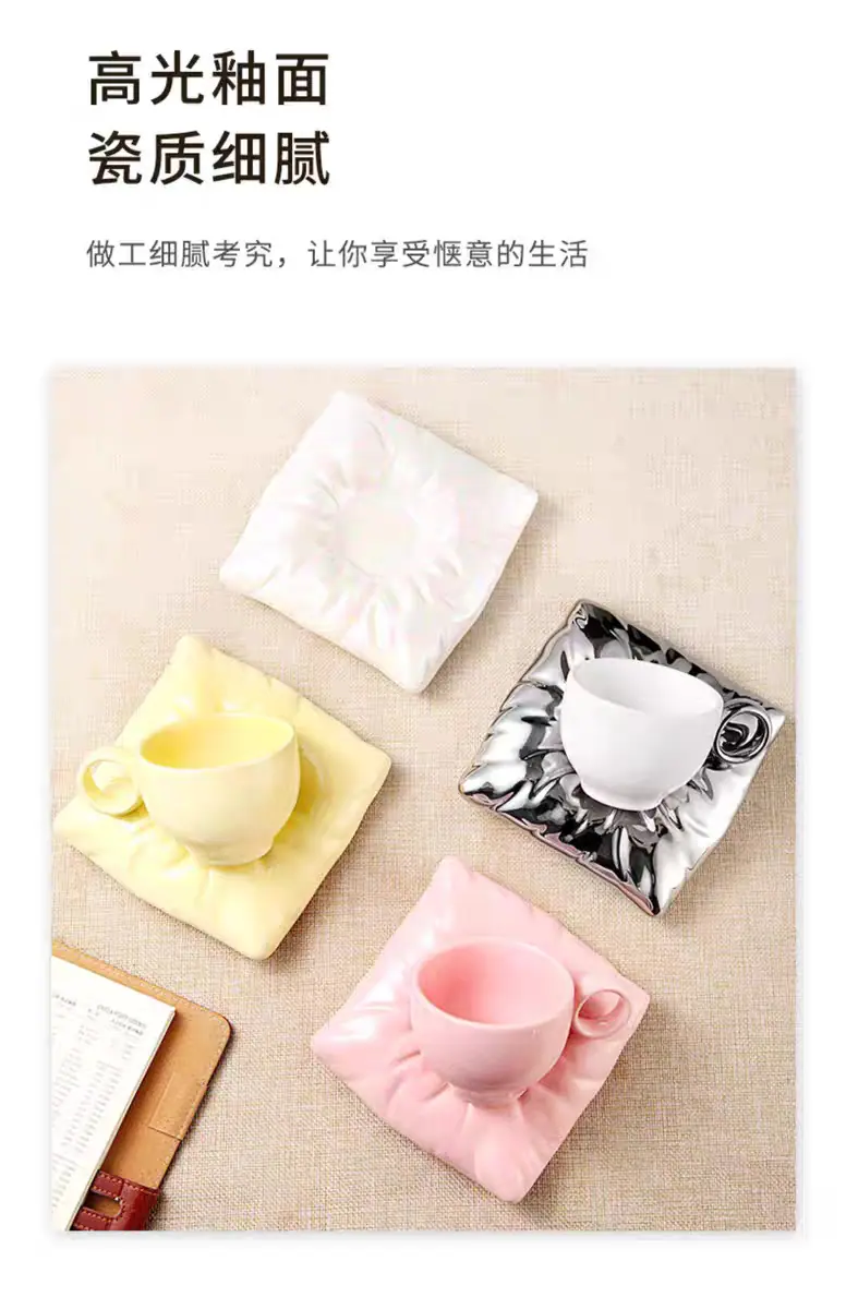 Soft pillow pearl white coffee cup and saucer, Soft pillow peach pink coffee cup and saucer, Soft pillow cream...