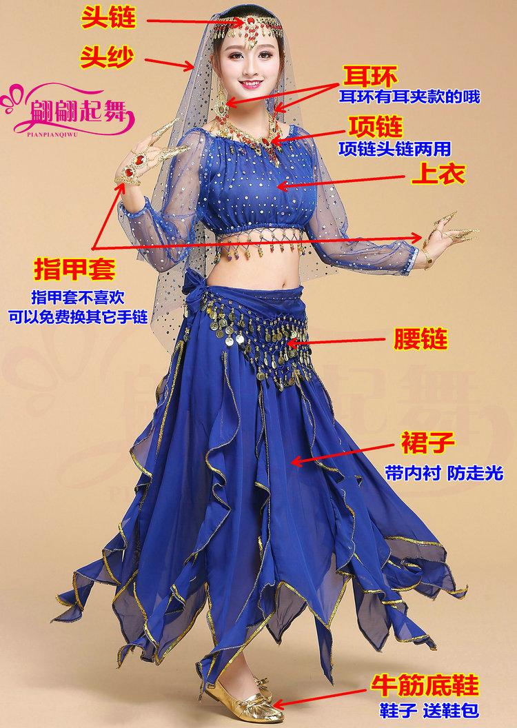 Zapatos de suela blanda de nueve piezas= top + falda + cadena para la cintura + cadena para la cabeza + velo + collar + aretes + un par de manos con cubiertas para uñas + zapatos de suela blanda