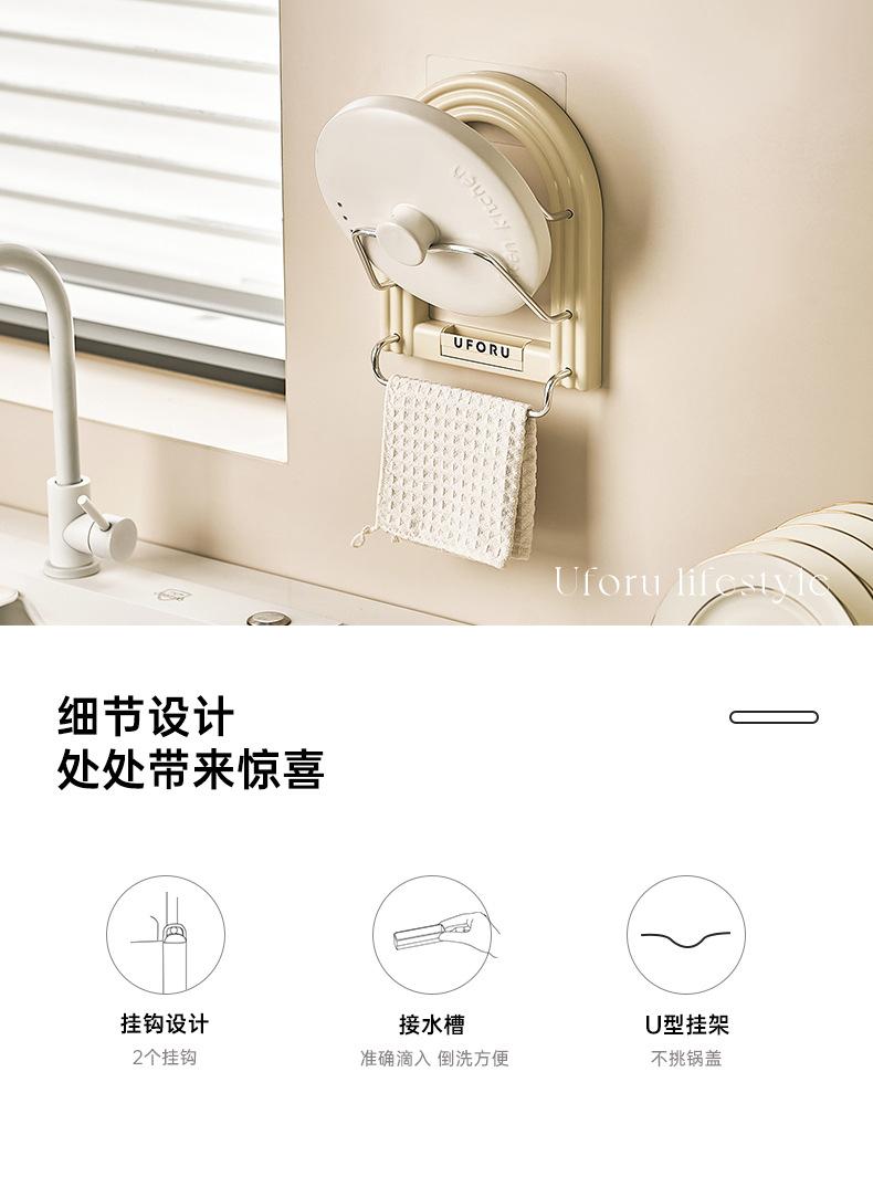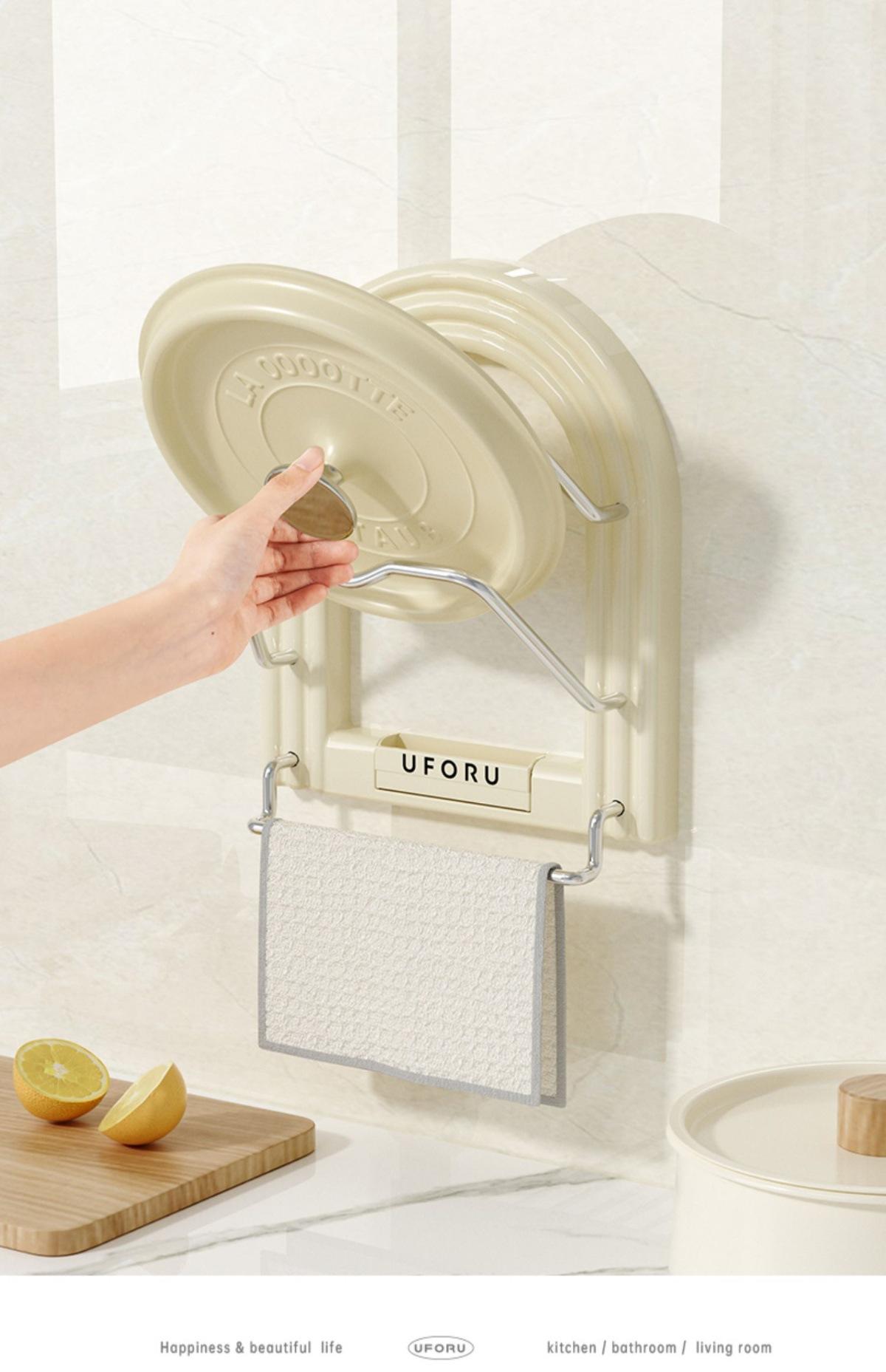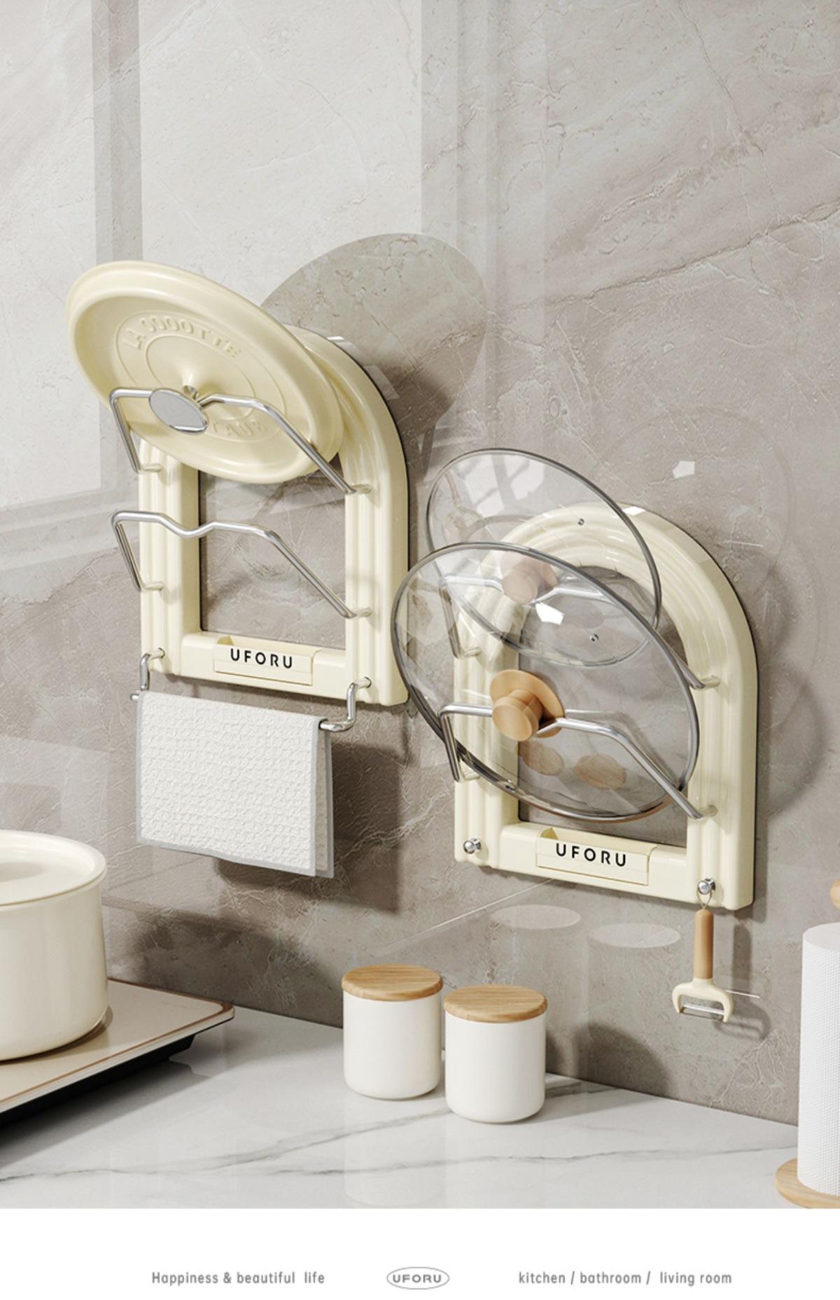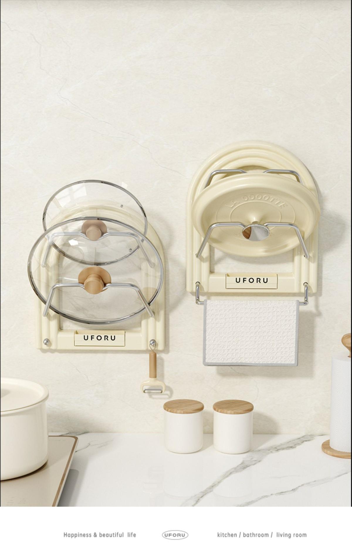 Pot lid holder - towel rack (cream white) [no punching required - free traceless sticker + screwdriver]
