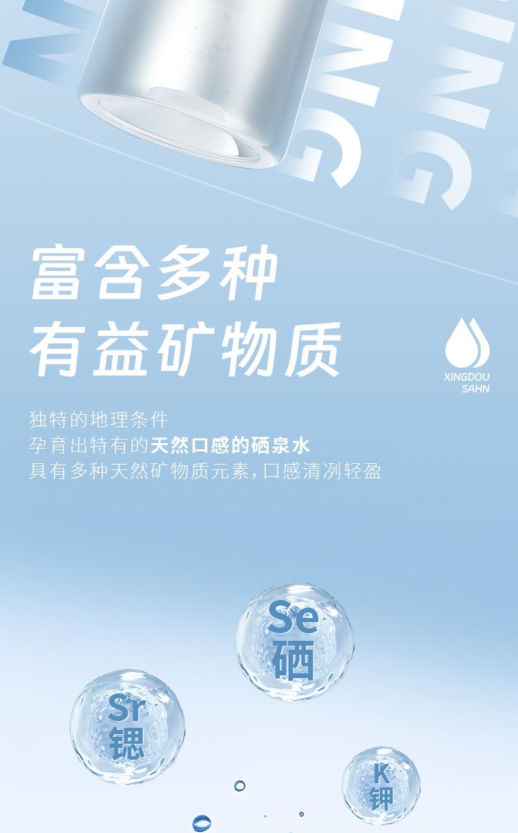 La Fuente de Agua de Manantial de la Montaña Xingdou está ubicada en la Aldea Anletun, Pueblo Shengjiaba, en la Reserva Natural de la Montaña Xingdou. Hay una fuente natural de agua de manantial de montaña llamada Qigushui. El flujo de agua es estable durante todo el año y la calidad del agua es clara y transparente. Según la prueba de la agencia de pruebas, la fuente de agua contiene selenio (0.000764mg/L), estroncio (0.265mg/L) y otros minerales necesarios para el cuerpo humano. Es baja en sodio y débilmente alcalina (valor de PH 25℃7.0-8.5). La calidad del agua es clara, el sabor es positivo y es dulce y deliciosa.