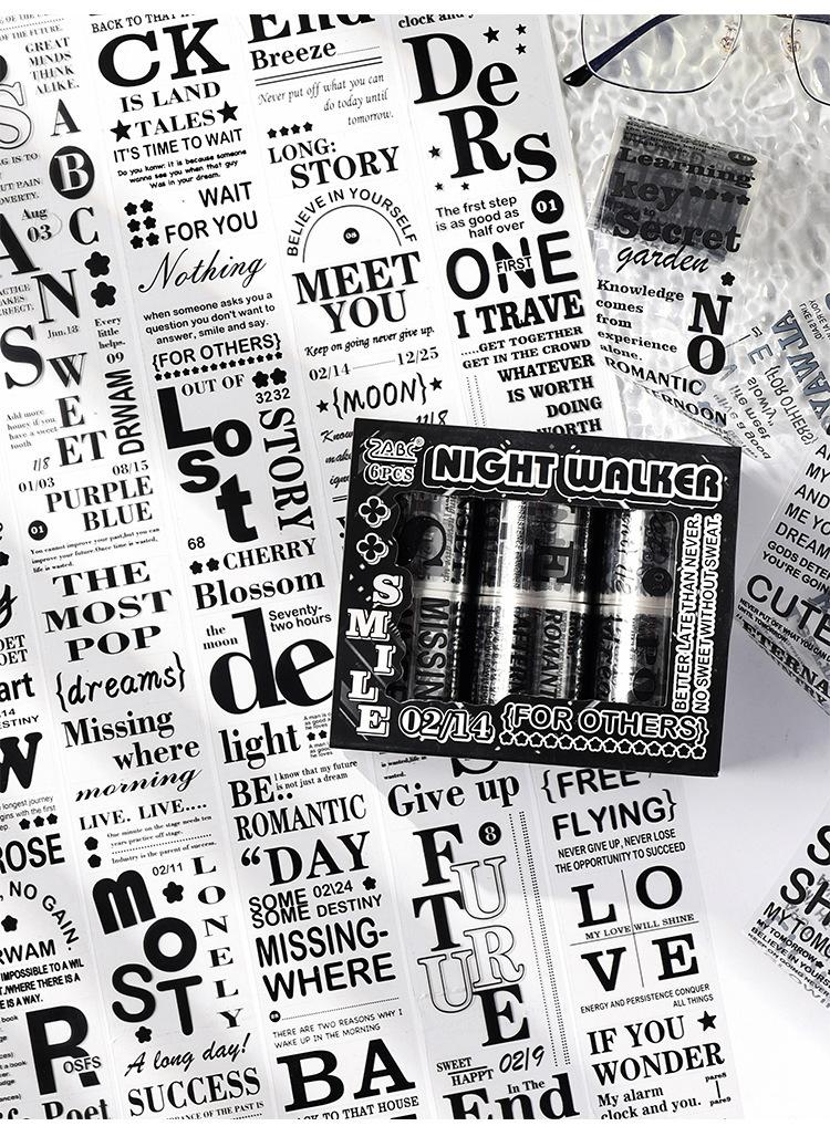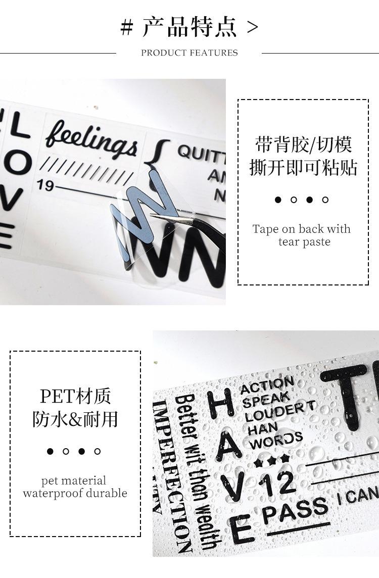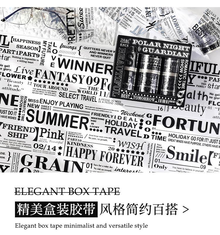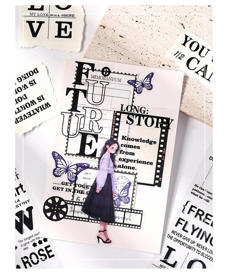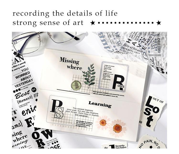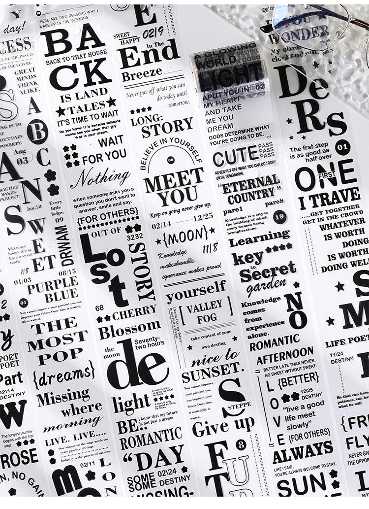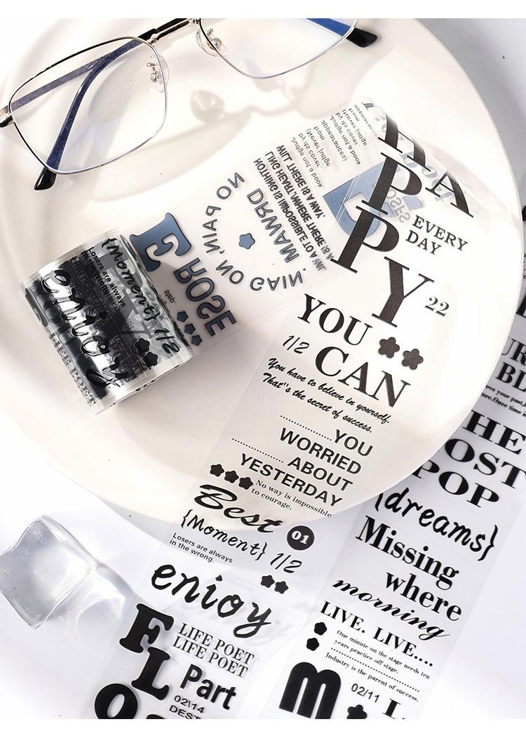 Juego de cinta adhesiva PET transparente impermeable con película de tinta inglesa, caja para manualidades, diario, pegatinas estilo retro, pegatinas especiales de aceite en inglés