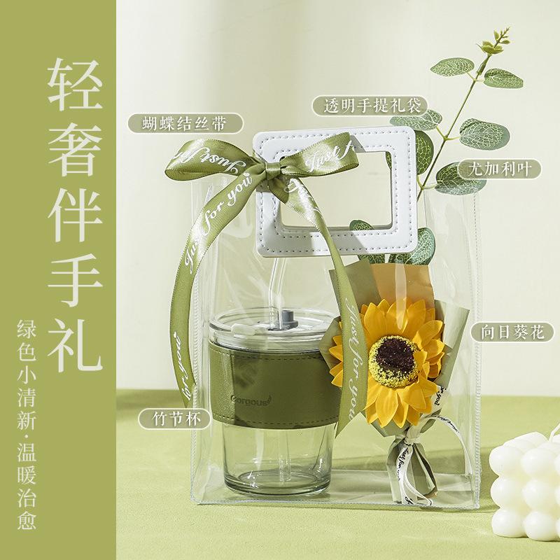 Bamboo cup + transparent straw + gift bag + sunflower flower