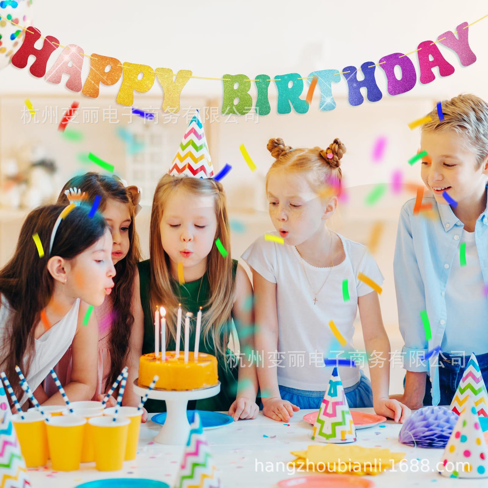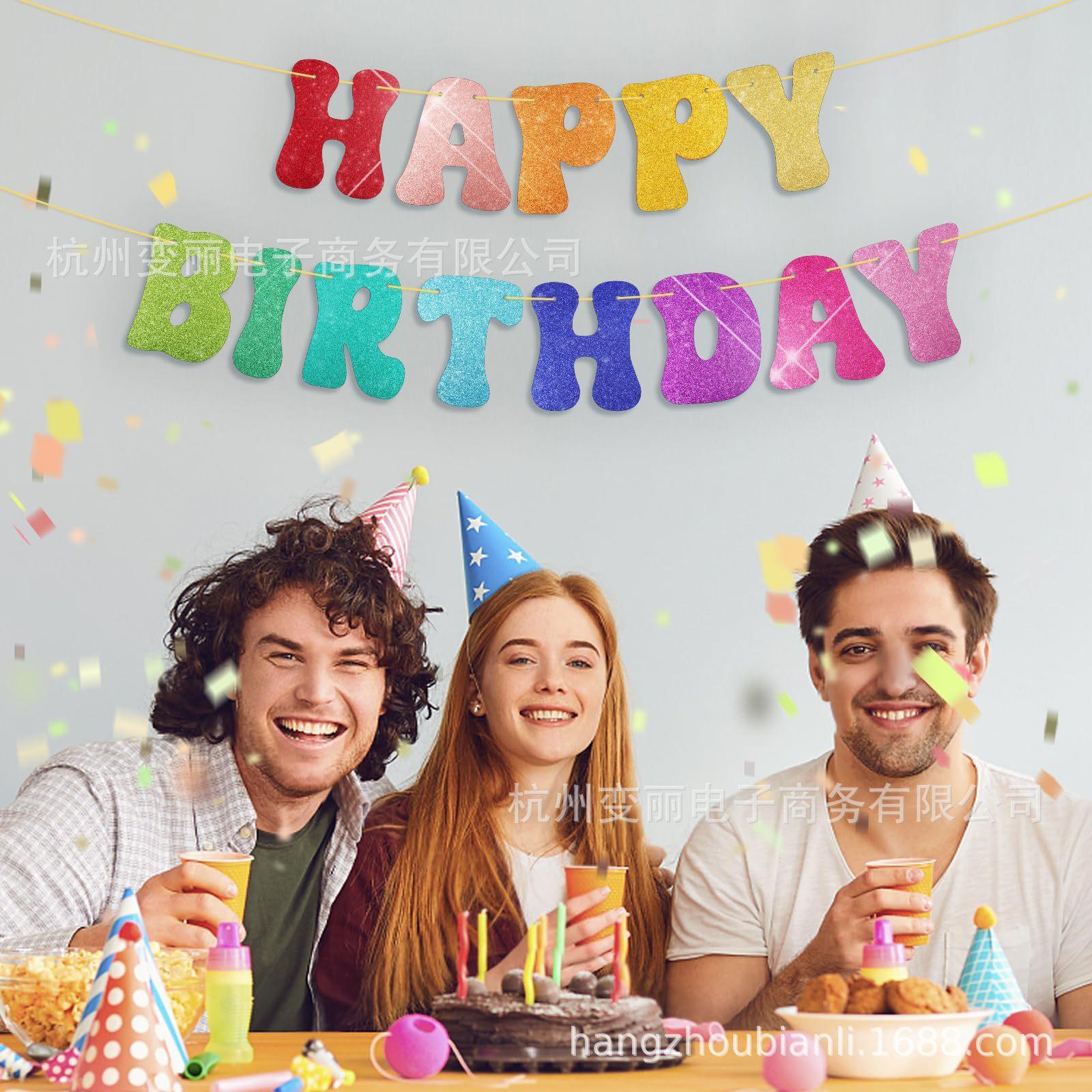 Bandera de feliz cumpleaños con purpurina, papel brillante, flores coloridas, decoración para fiesta de cumpleaños