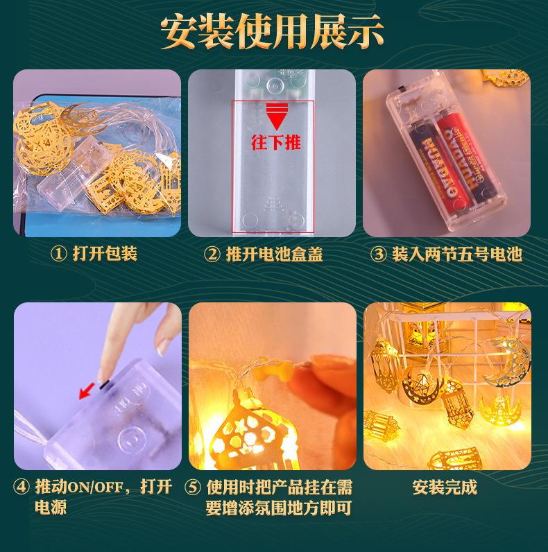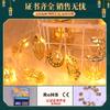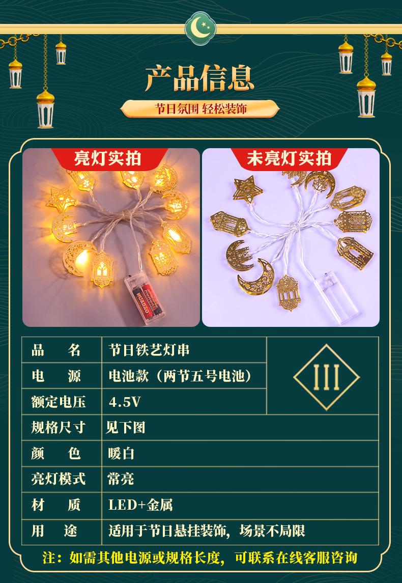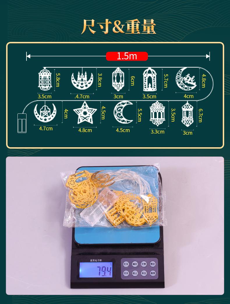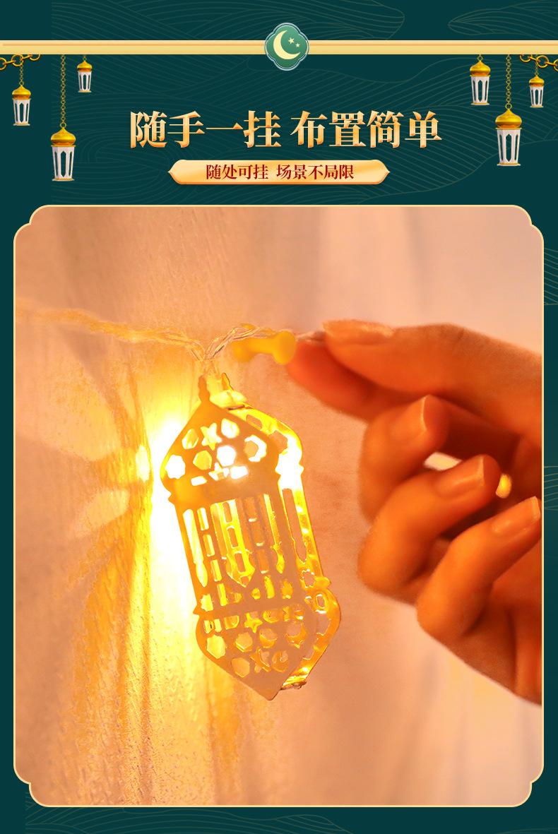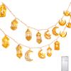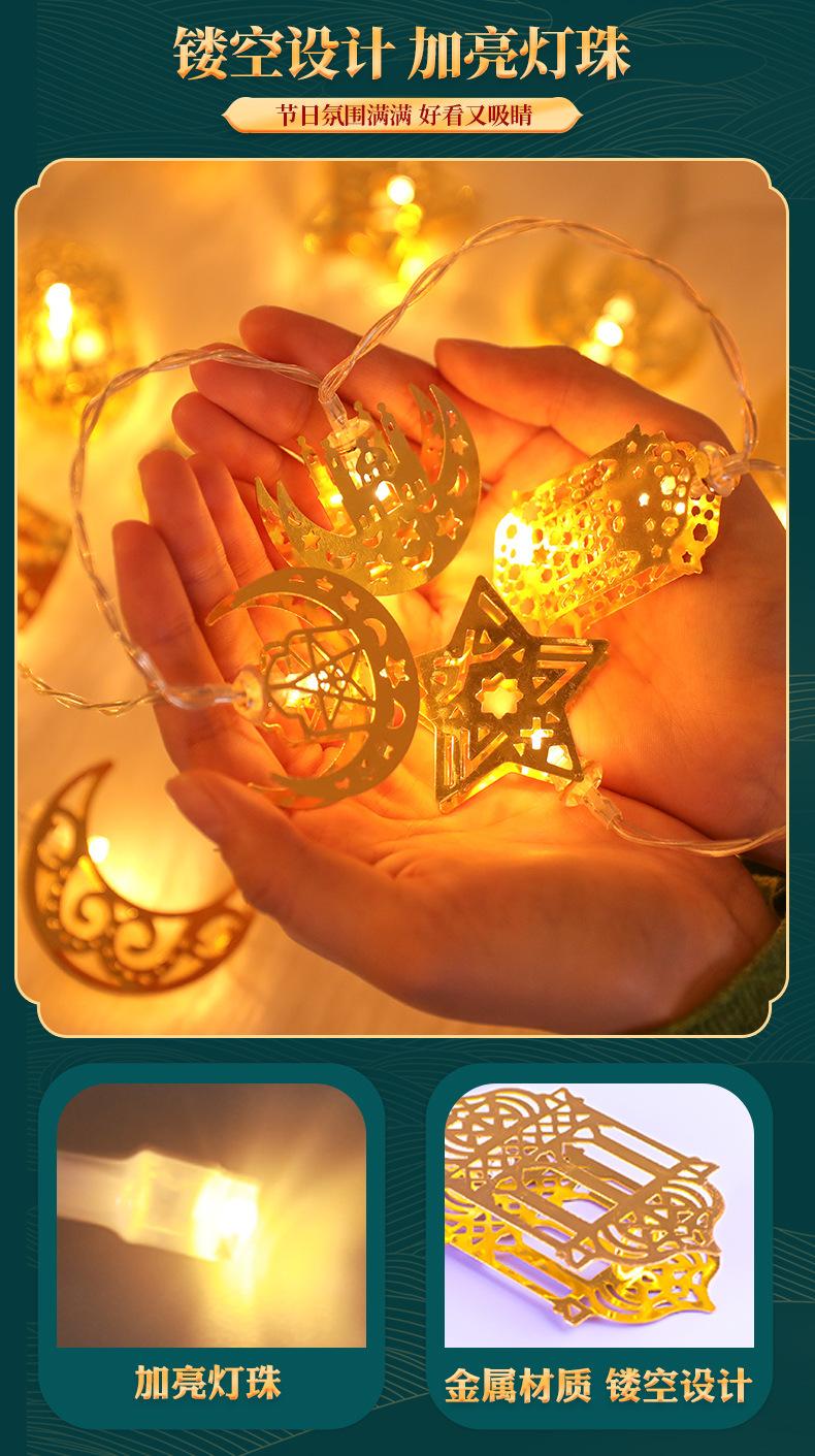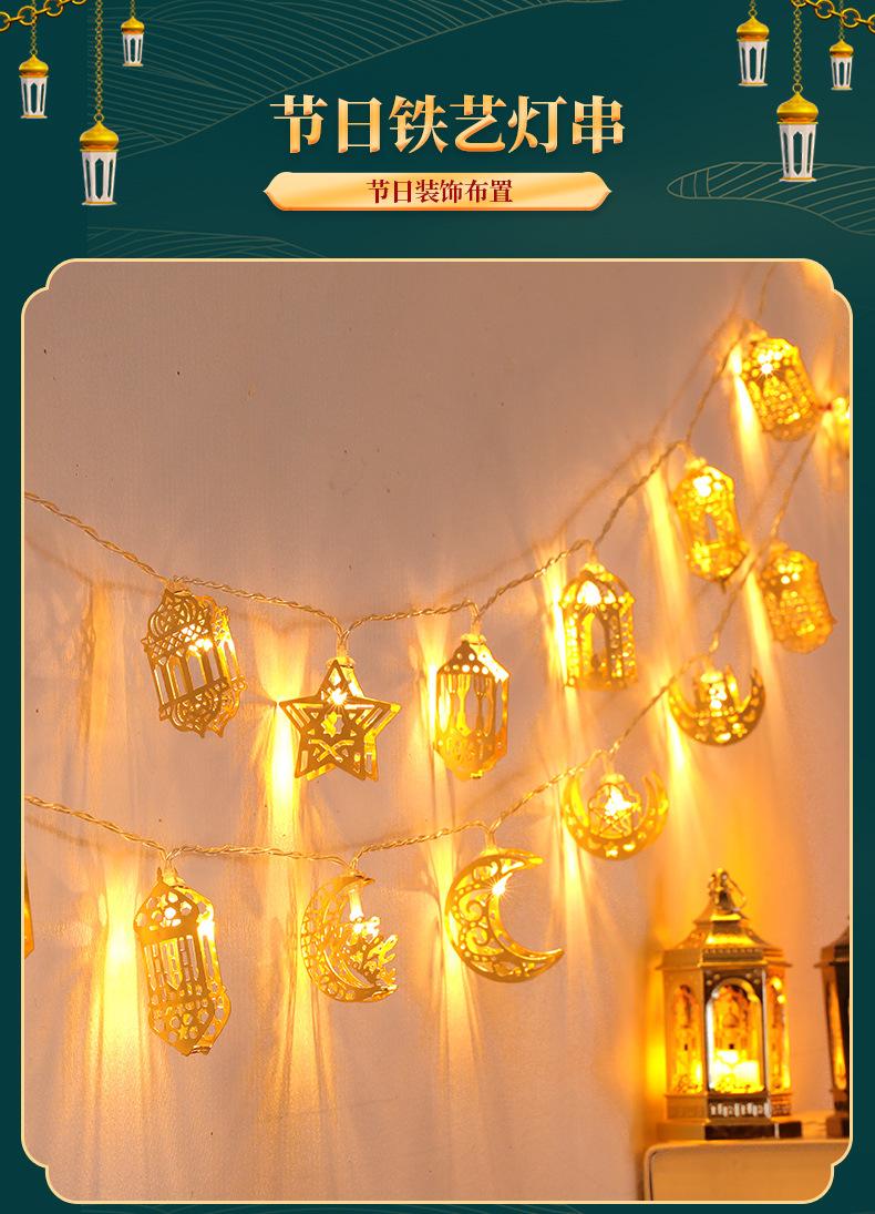 Farol decorativo transfronterizo de Oriente Medio con forma de estrella y luna, cadena de luces LED huecas de hierro, ideal para fiestas y ambientación.