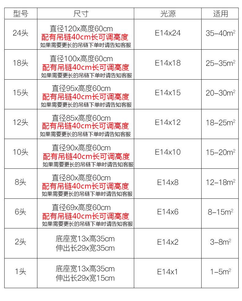 6 heads diameter 70*50cm, 8 heads diameter 80*50cm, 10 heads diameter 92*50cm, 12 heads diameter 98*50cm, 15 h...