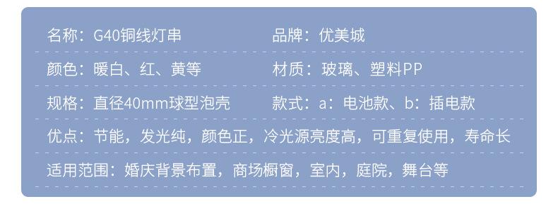 Compra Luces de Alambre de Cobre G40 Iluminación para el Hogar Impermeable Luces Decorativas LED Luces de Bolas Navideñas Bombilla LED de 3V Luces de Alambre de Cobre al por mayor en Joom.pro