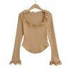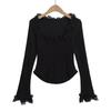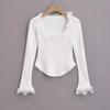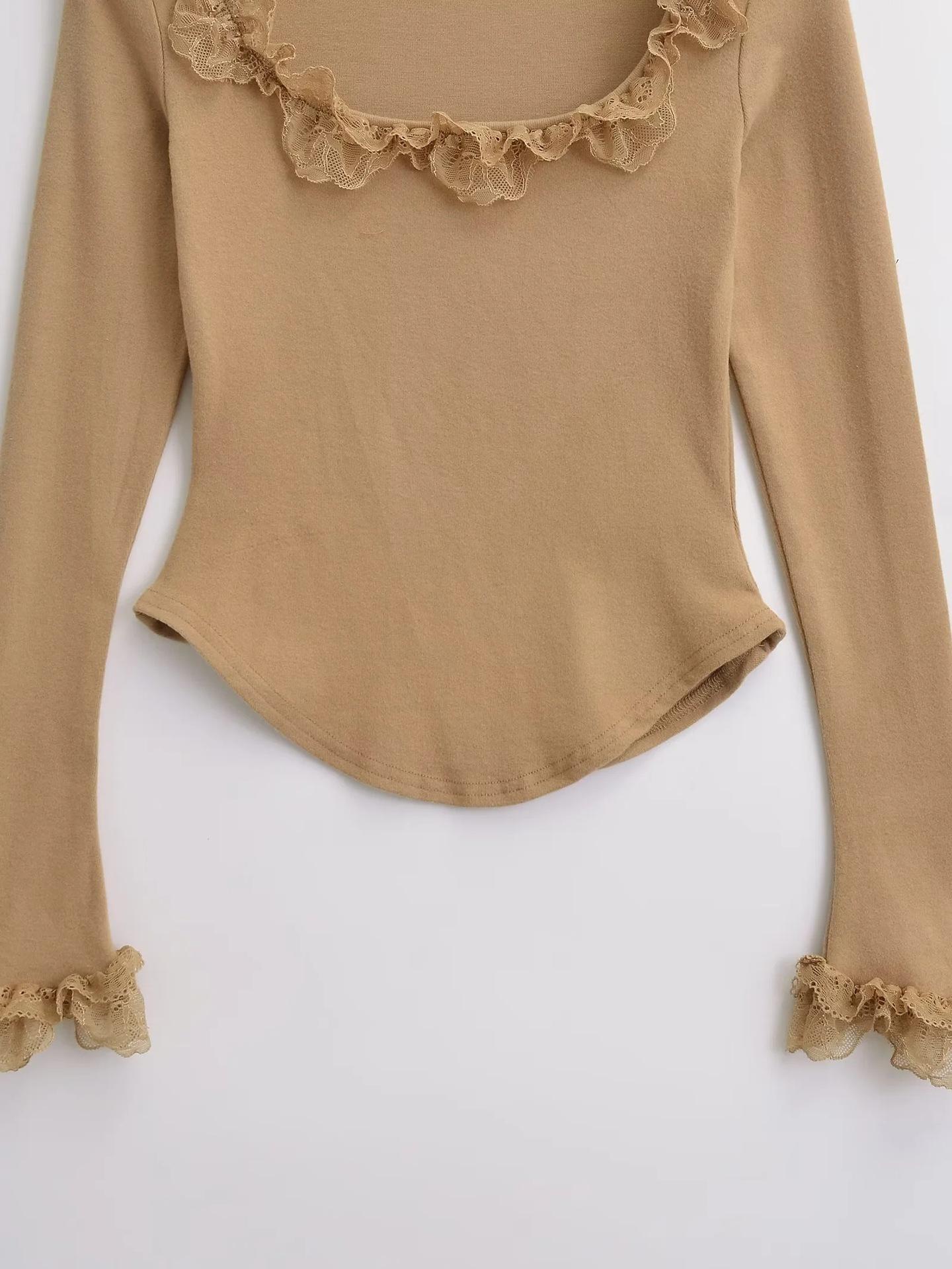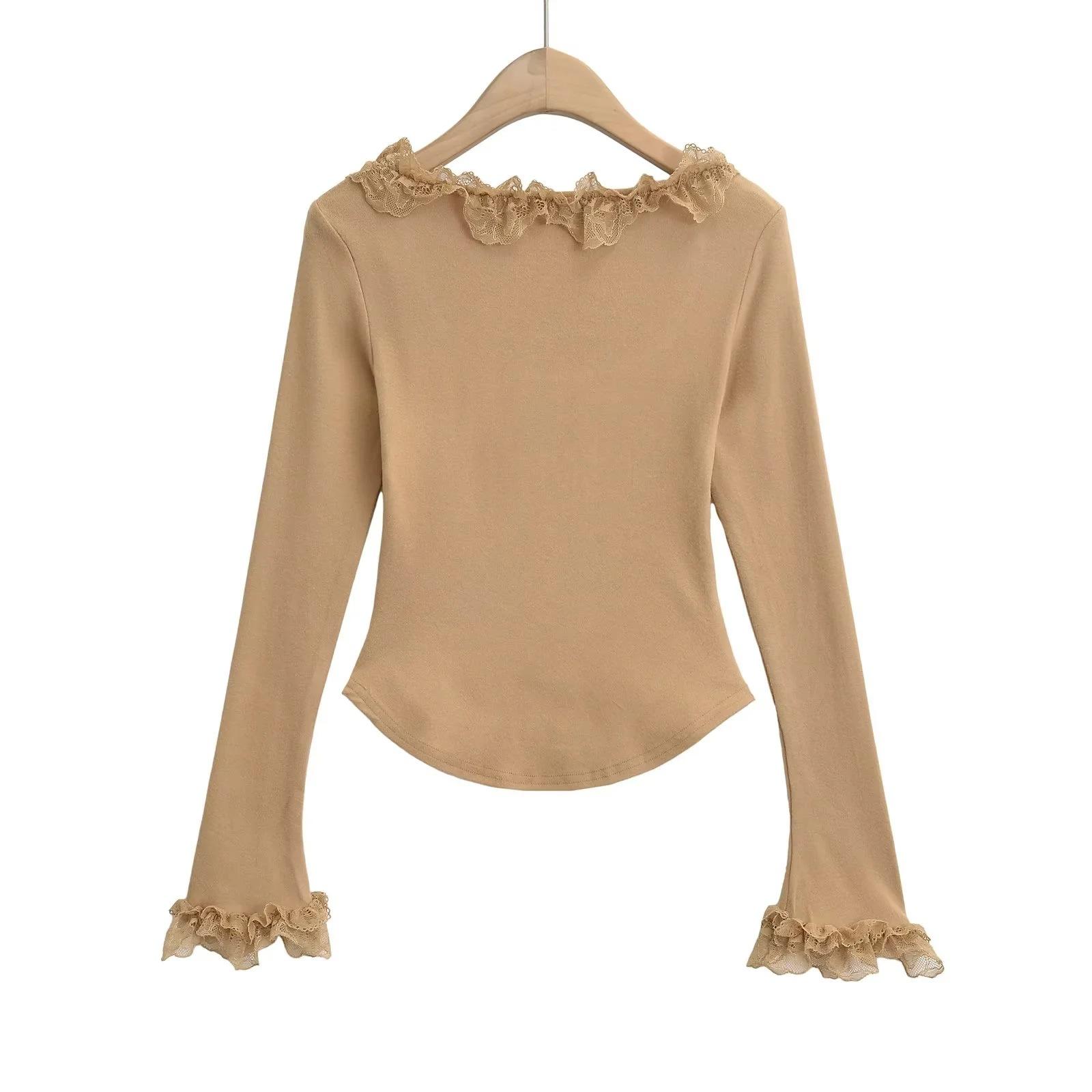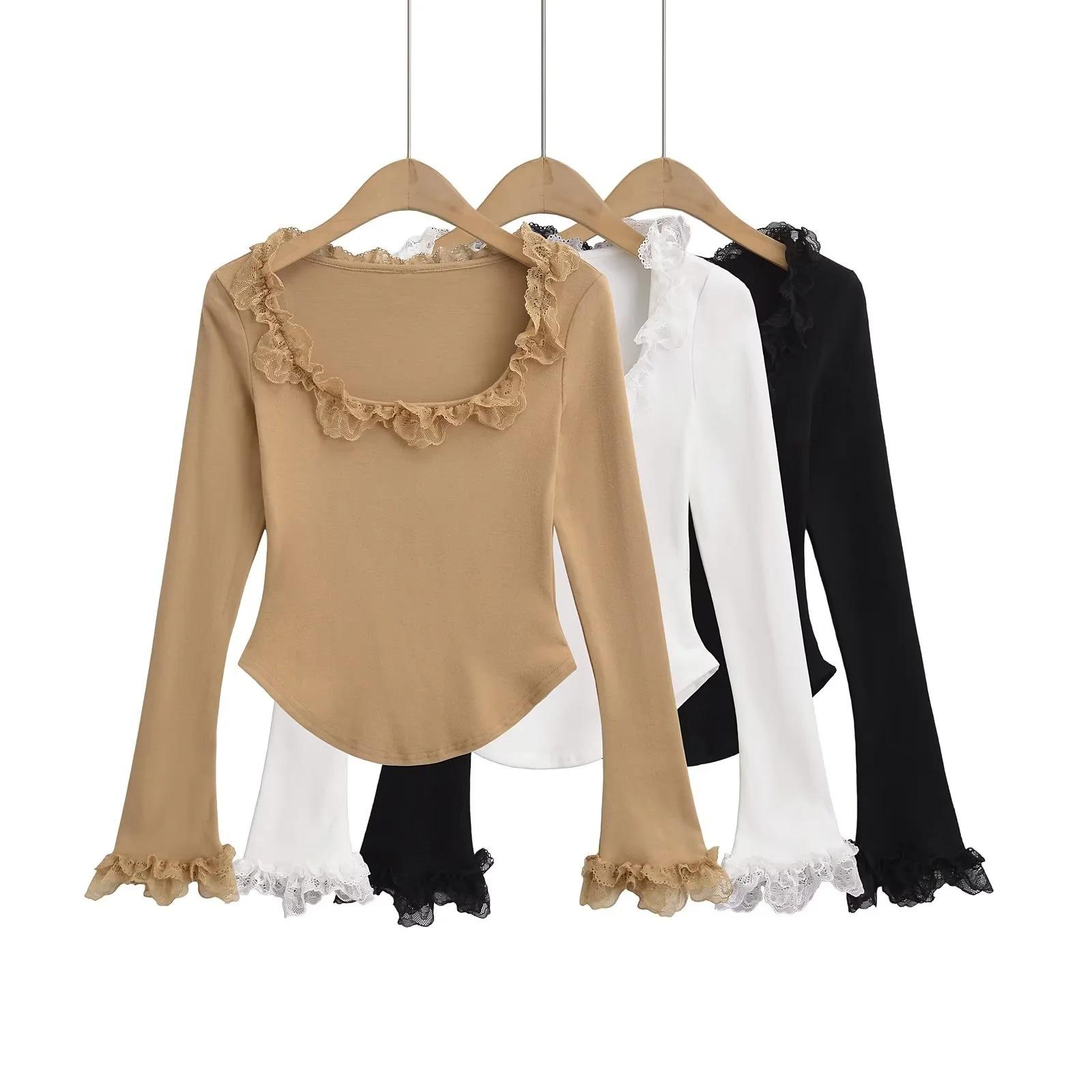 Camiseta de otoño con cuello redondo grande, ajustada, elástica, de manga larga y encaje con puños de encaje en la cintura.