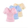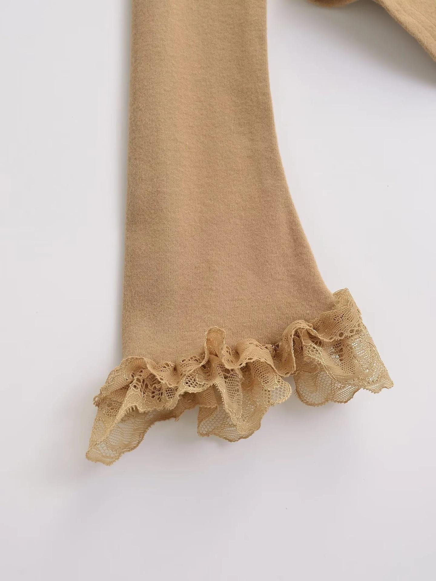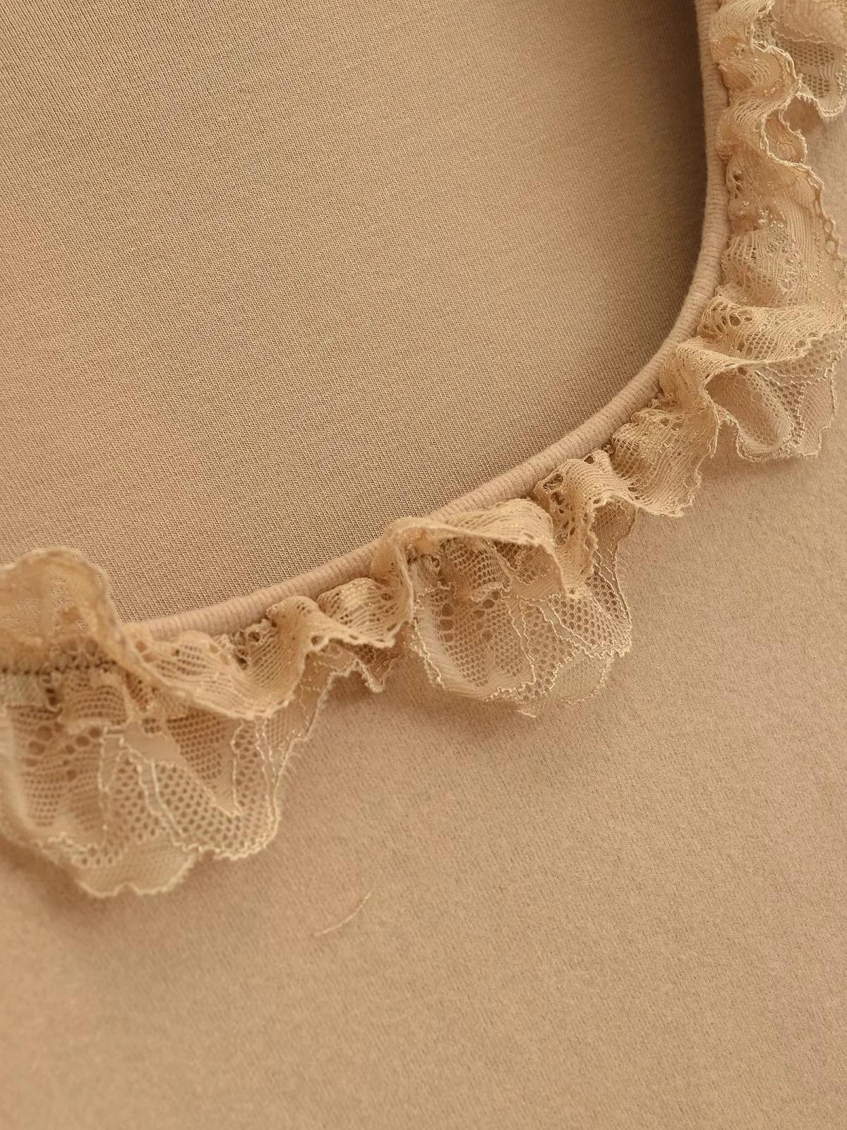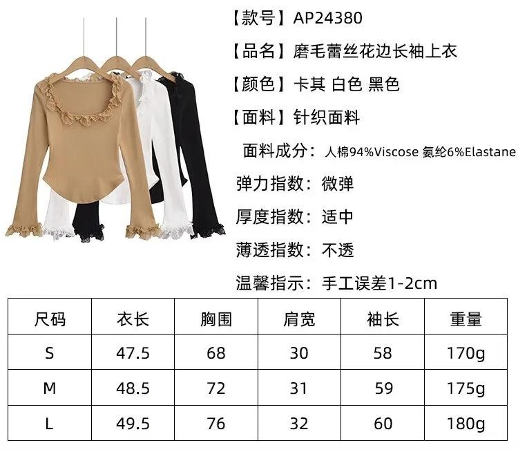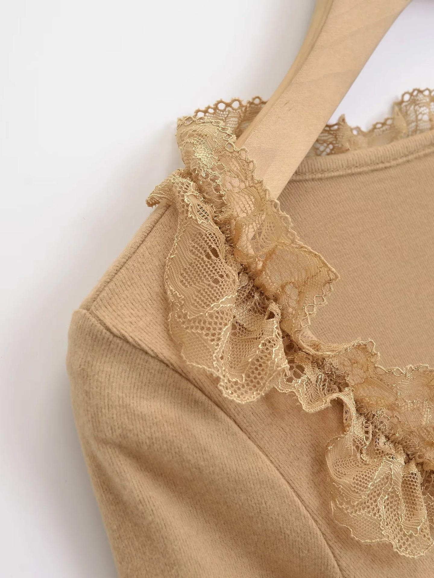 Camiseta de otoño con cuello redondo grande, ajustada, elástica, de manga larga y encaje con puños de encaje en la cintura.