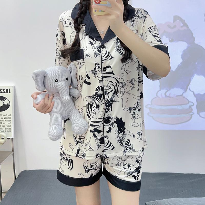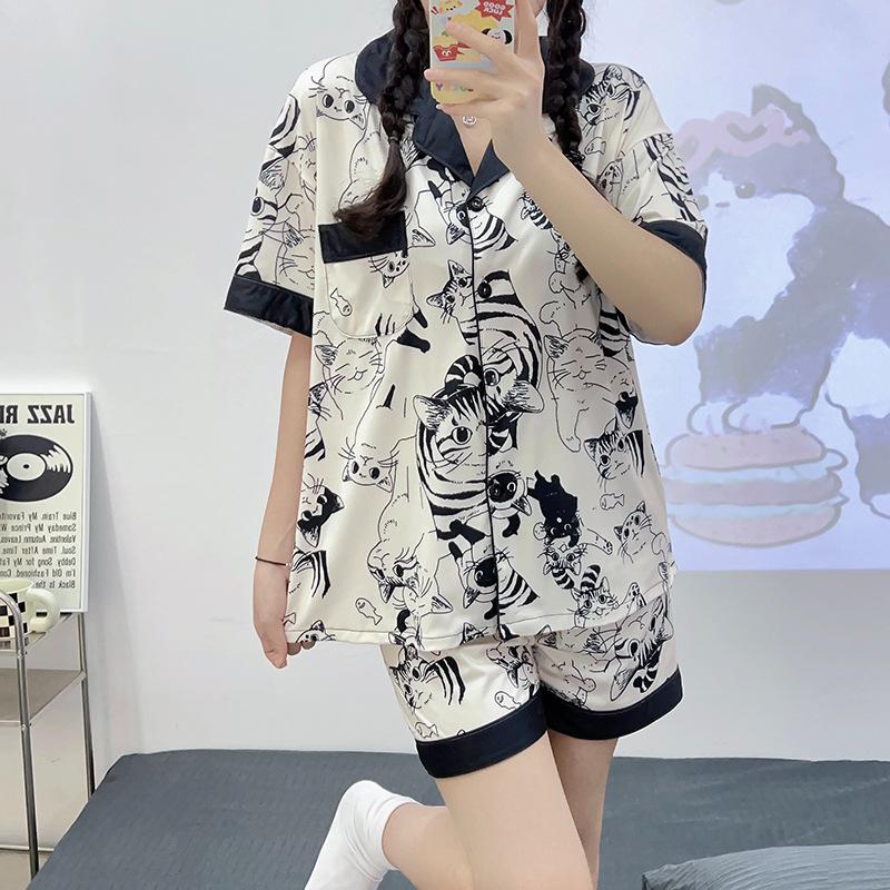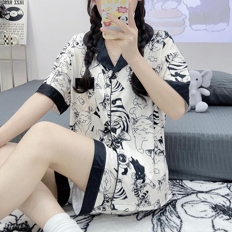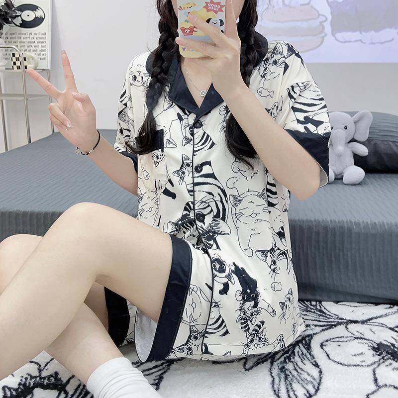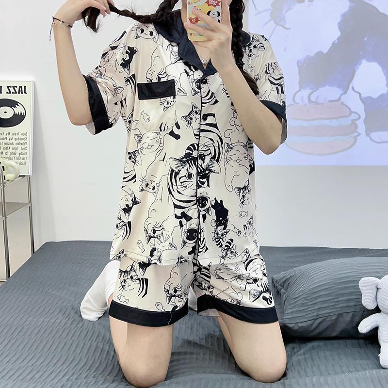 Pijama de Verano de Manga Corta de Imitación Seda Seda de Hielo para Mujer Nuevo Estilo Ins Lujo Ligero Pintura a Tinta Ropa de Casa para Mujer pijama