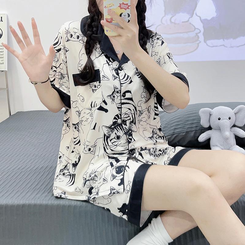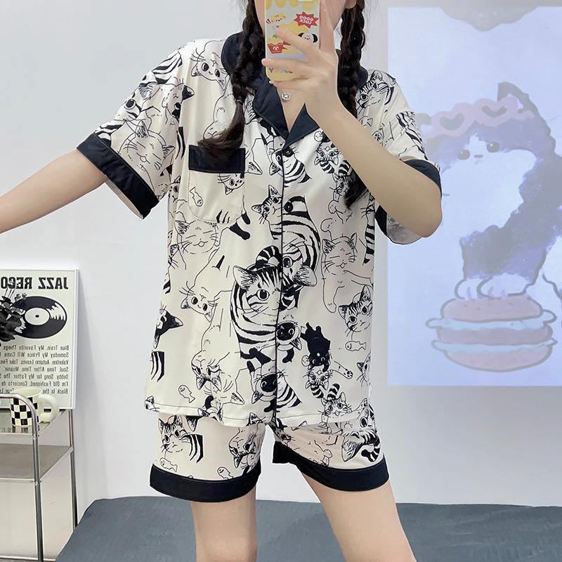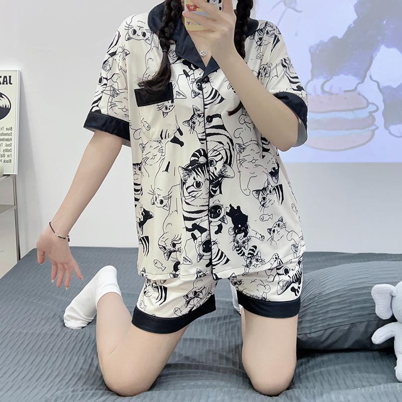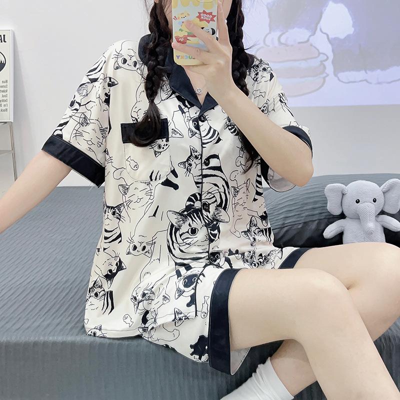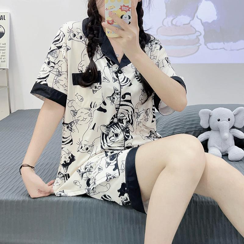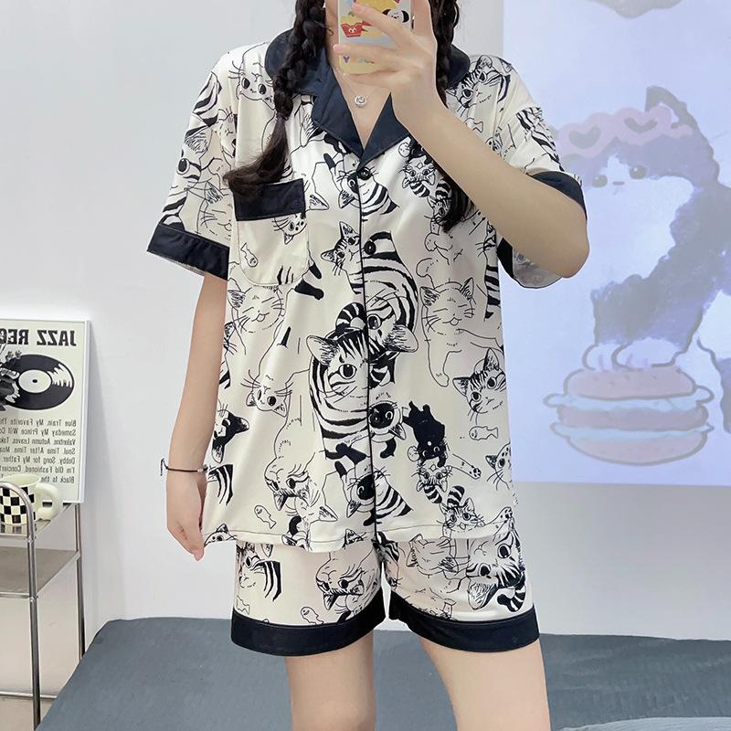 Pijama de Verano de Manga Corta de Imitación Seda Seda de Hielo para Mujer Nuevo Estilo Ins Lujo Ligero Pintura a Tinta Ropa de Casa para Mujer pijama