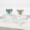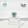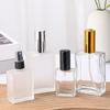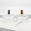 Botella de perfume cuadrada plana de 30 ml con pulverizador de prensa, de vidrio transparente, vacía, con tapa.