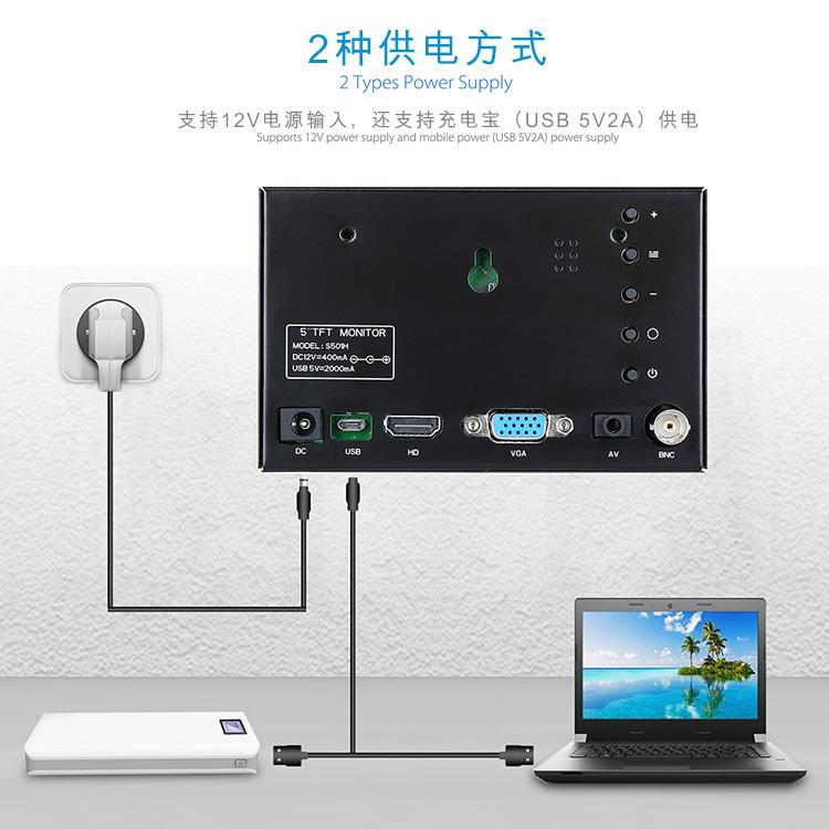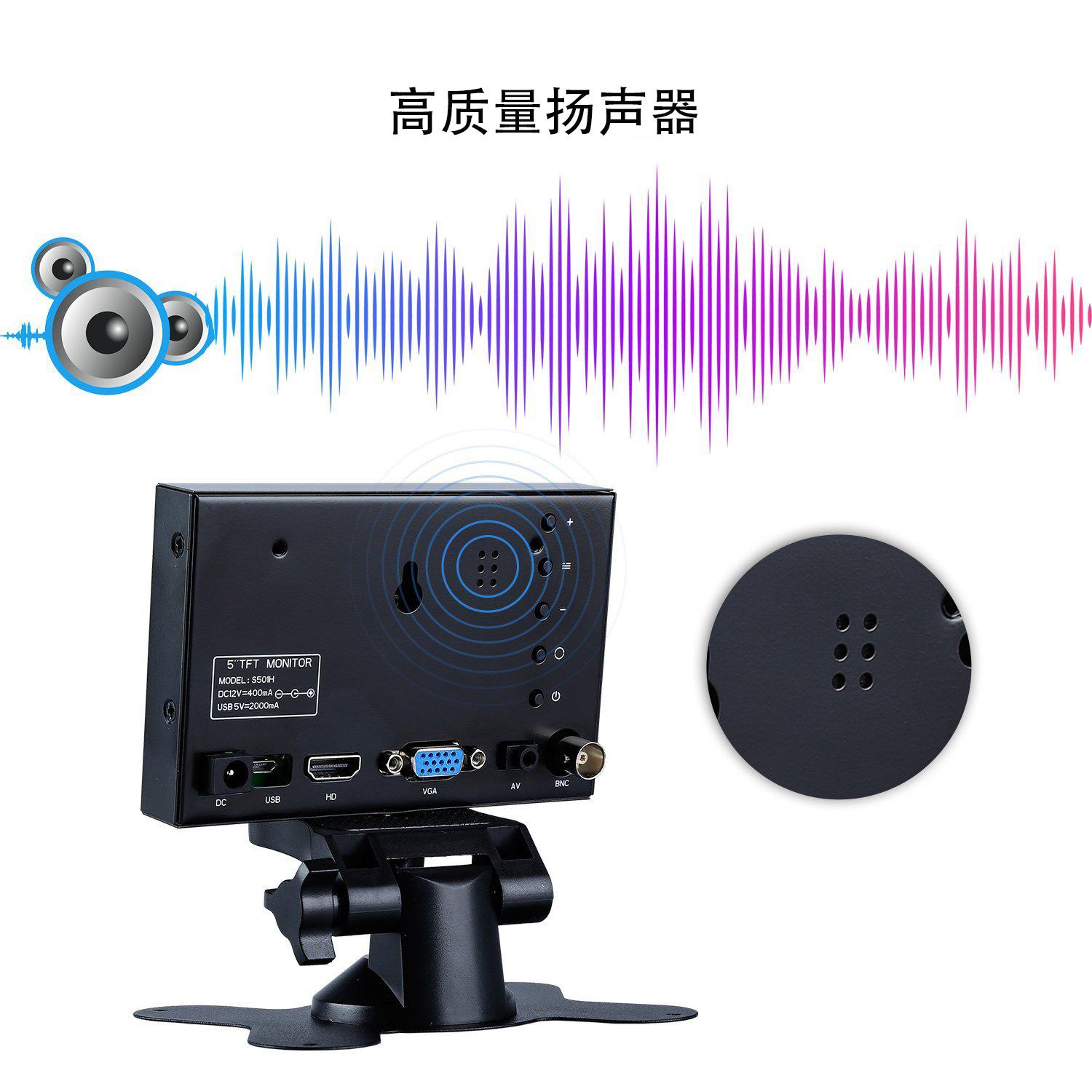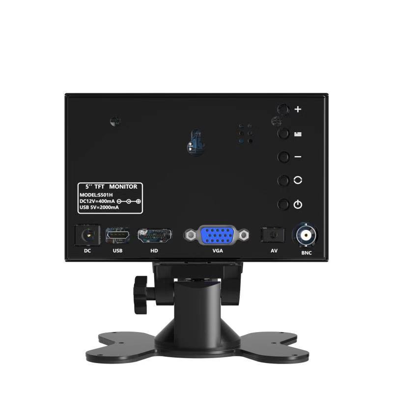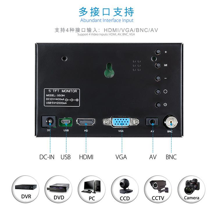 Mini pantalla metálica de 5 pulgadas 800*480, soporteHDMI、VGA、Entradas AV y BNC para satisfacer una variedad de entornos de aplicación.apoyo12 VFuente de alimentación y fuente de alimentación móvil (USB 5V2A)alimentado por, exquisito y compacto, conveniente para llevar al aire libre, ampliamenteAplicado en la industria óptica, industria médica, industria de seguridad, industria del video, fotografía y grabación, educación y capacitación,Promoción de producto,Industria militar, producción electrónica, fabricación industrial, etc.
