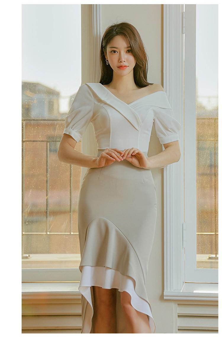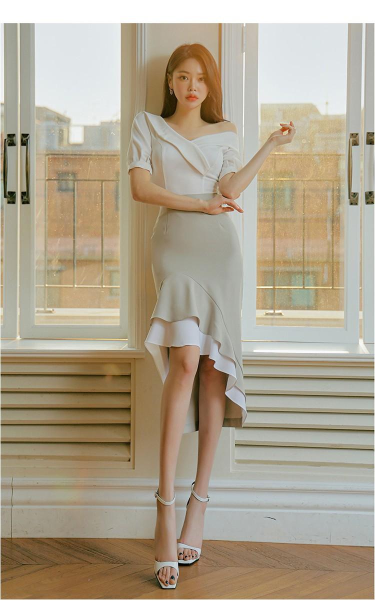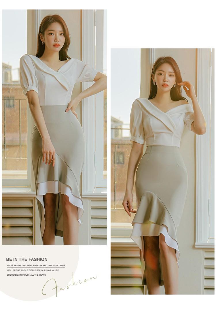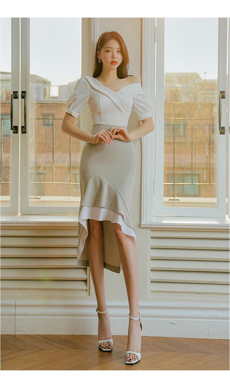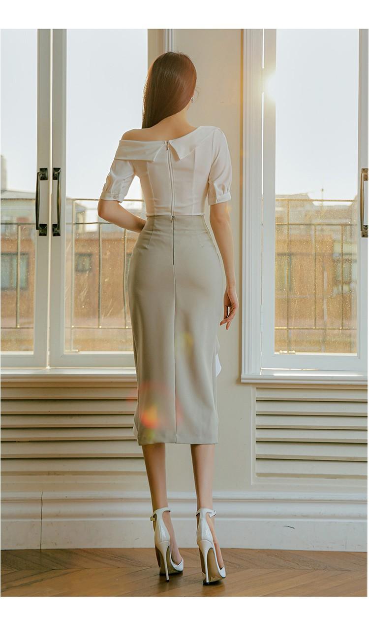 Traje profesional de falda con cuello asimétrico y manga abullonada para mujer, verano nuevo, falda de cola de pez de talle alto, conjunto de dos piezas