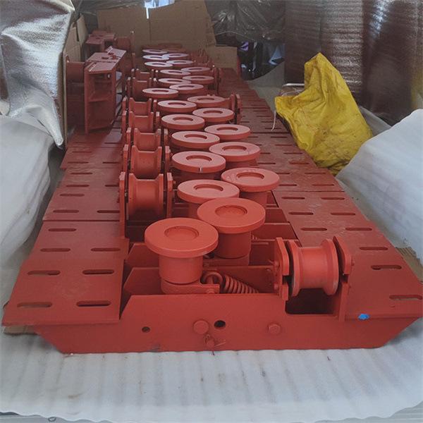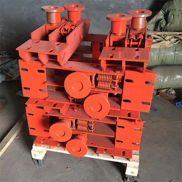 Función: Es adecuado para zonas bajas de los carriles de cabrestantes de cable sin fin, ya que sujeta el cable y evita que rebote. Al pasar el carro lanzadera, el cabezal de la lanzadera golpea la rueda para abrirla. Tras el paso del carro lanzadera, los cuatro resortes reajustan la rueda. Si la depresión es muy baja, aumente el número de grupos de ruedas de presión del cable según corresponda; de lo contrario, el cable podría rebotar o aumentar el desgaste de la rueda.