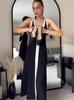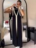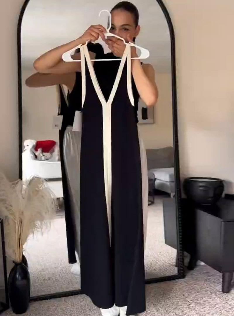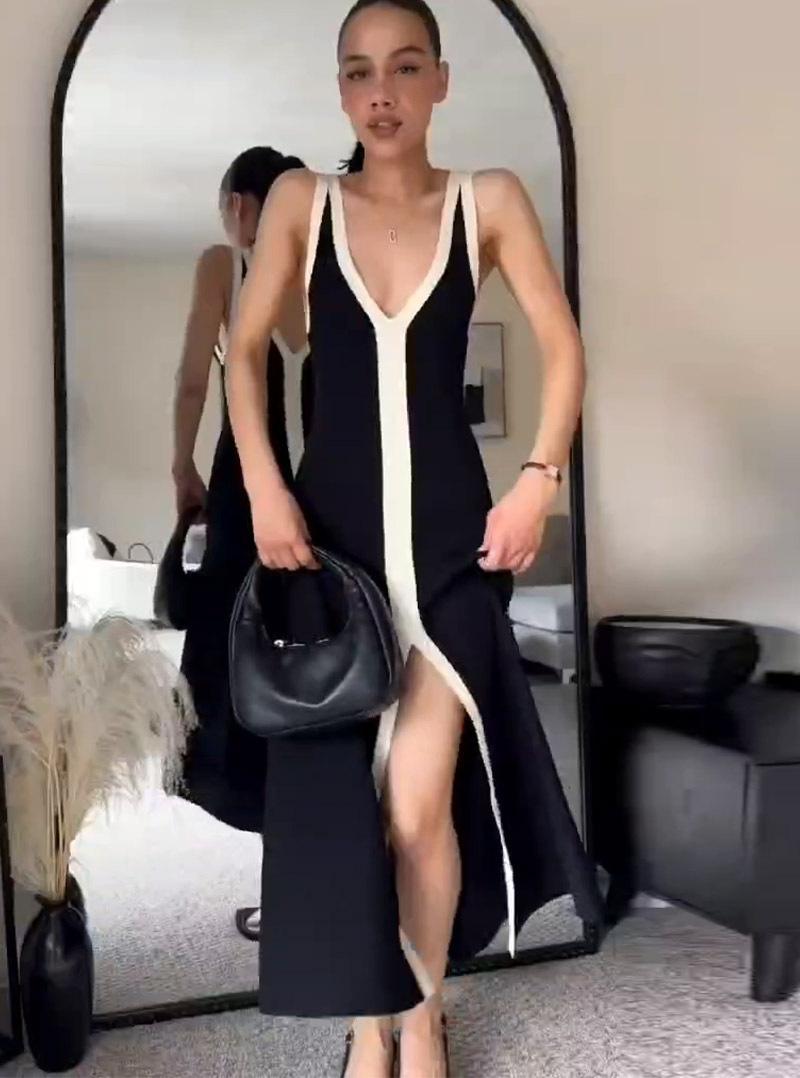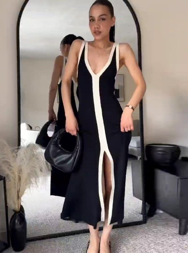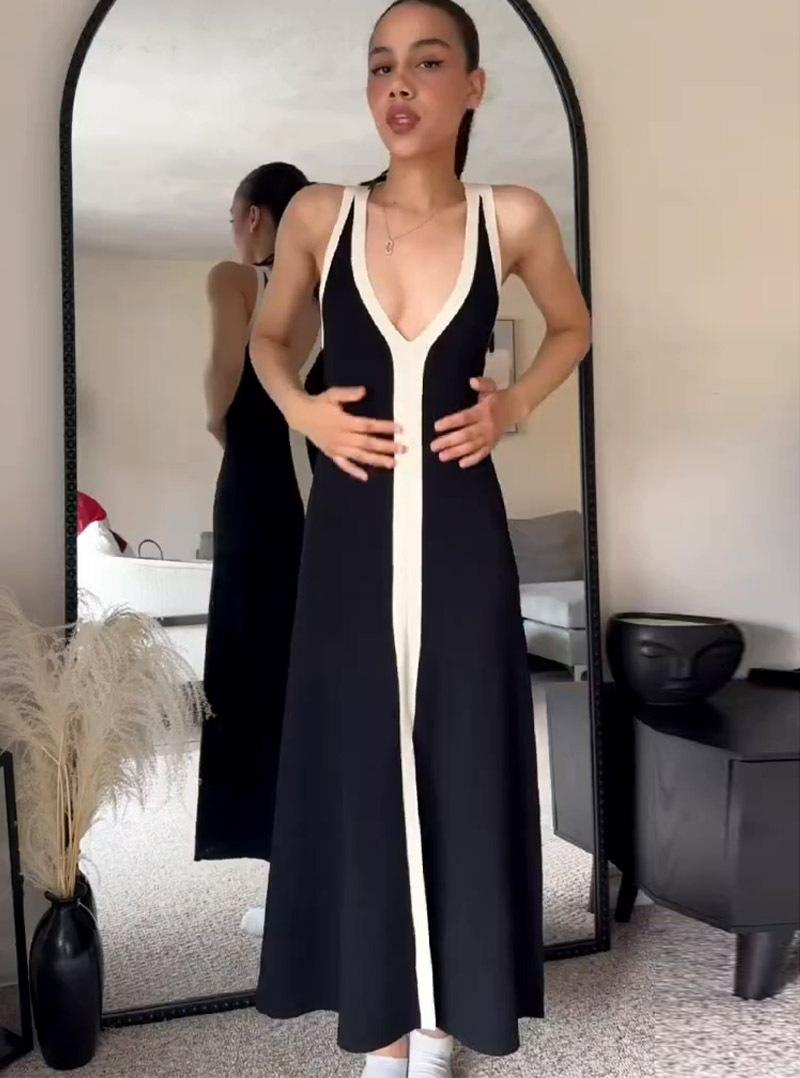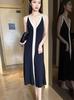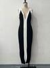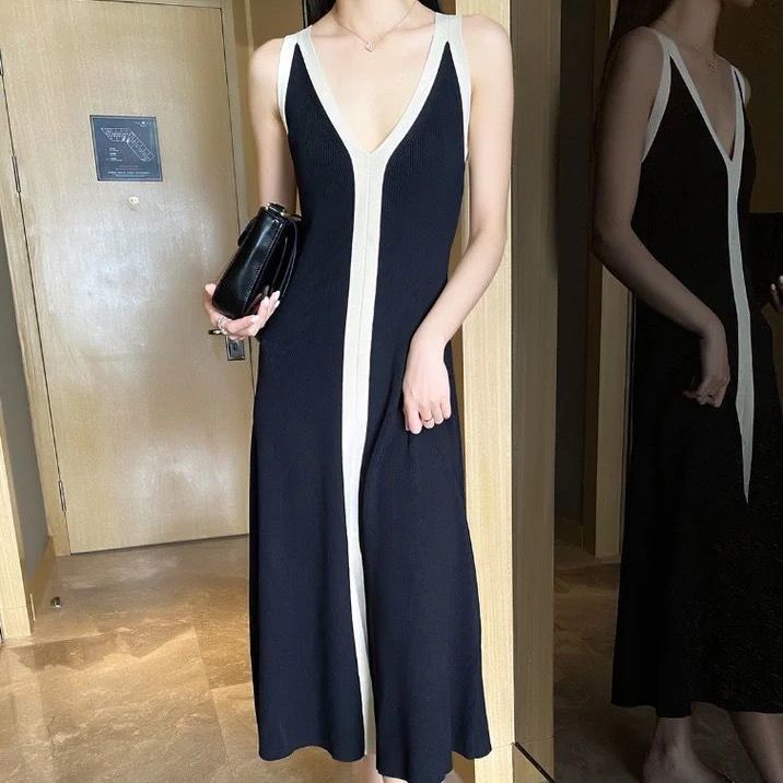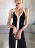 Primavera y verano 2024 Nuevo estilo Elegante Vestido de punto con escote en V largo y combinación de colores en la parte delantera y trasera Falda Hepburn para mujer Negra