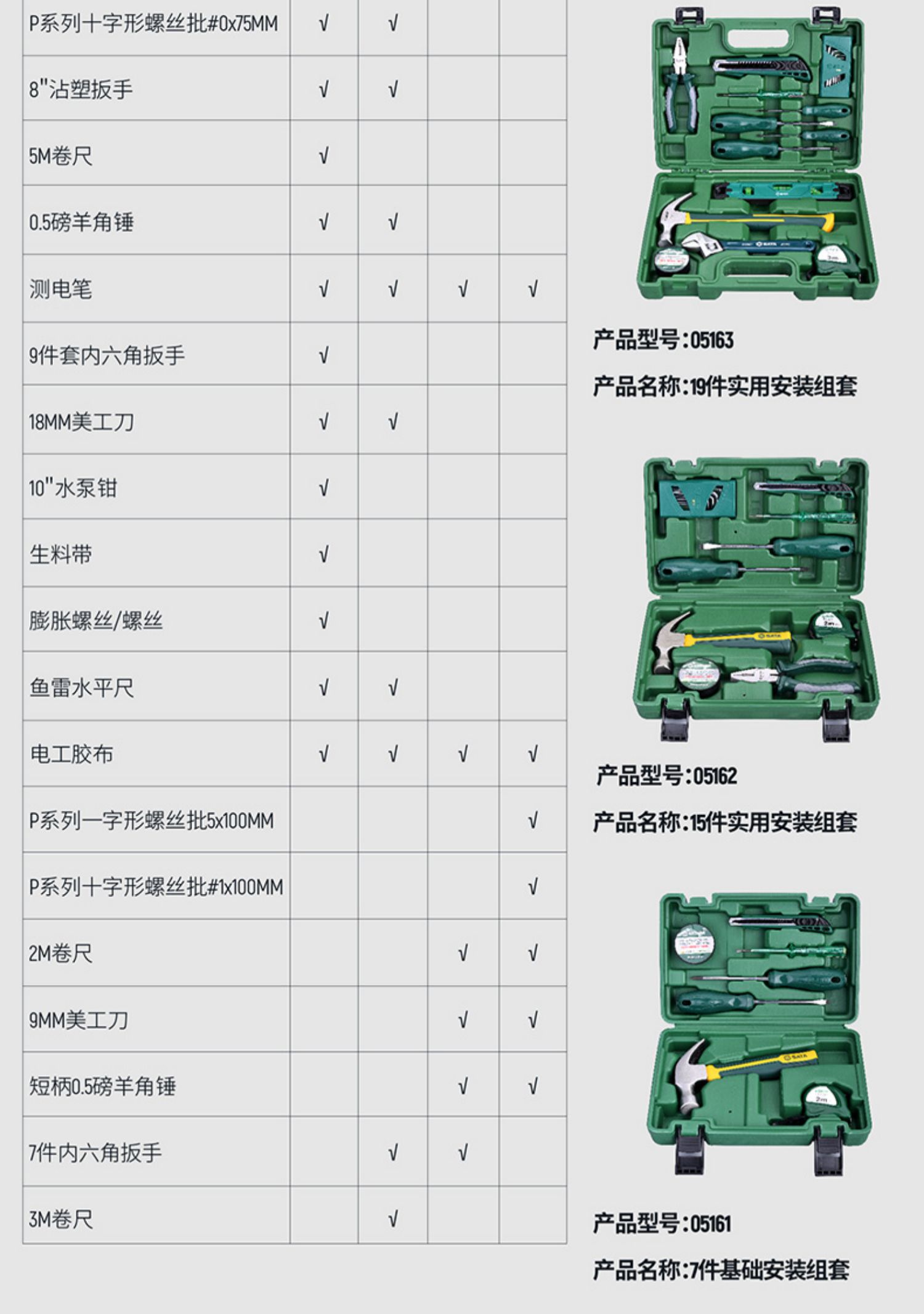 7-piece basic installation set/05161, 15-piece practical installation set/05162, 19-piece practical installati...