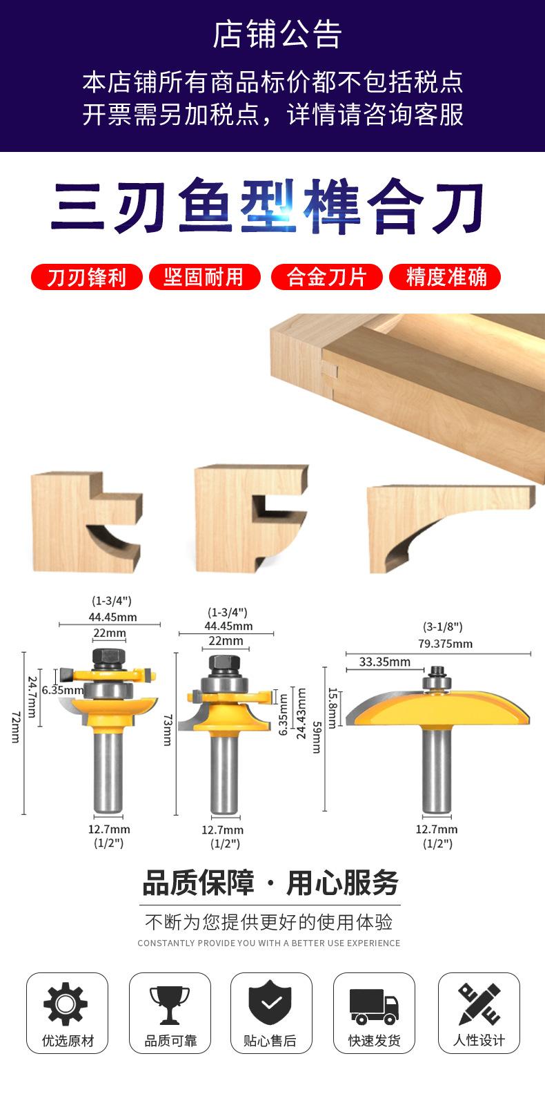 Fresa de mortaja y espiga de tres cuchillas con forma de pez vástago de 1/2 cortador de placa de puerta lateral r doméstico cortador de mortaja y espiga oeste juego de 3 piezas cortador de moldura de línea de marco de puerta fresa
