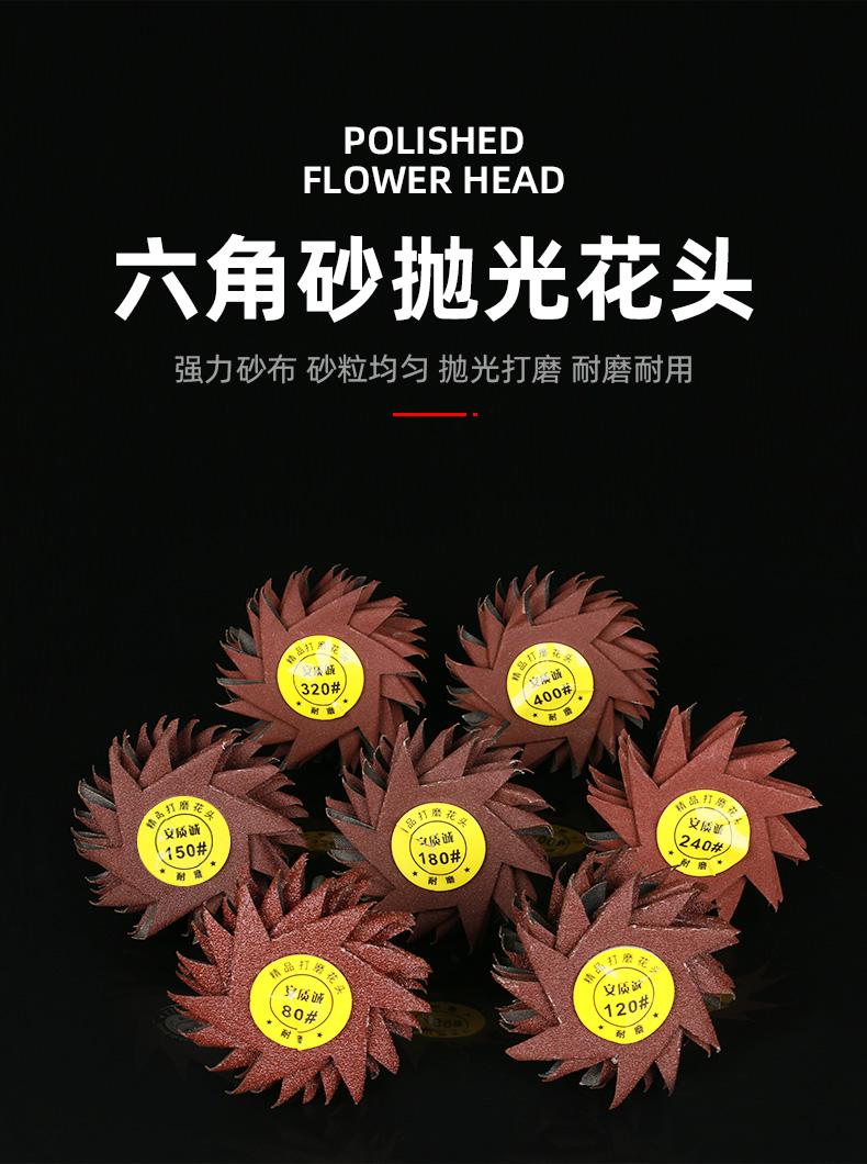 [Hexagon emery cloth flower head 180 eye handle 6MM]], [Hexagon emery cloth flower head 240 eye handle 6MM]], ...