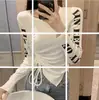 Top Delgado Elástico Plisado Estampado con Letras para Mujer Manga Larga Primavera Cordón Ajustable Moda Camiseta Base S1161 Estampada de Dos Mangas T
