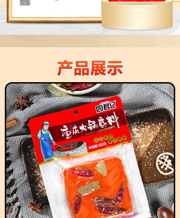 Zhou Junji Chongqing Hot Pot Material base 500g Aceite de res auténtico comercial Olla picante Perfume picante Condimento para pescado Hogar