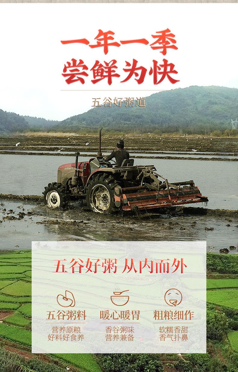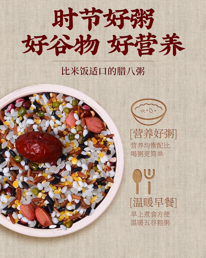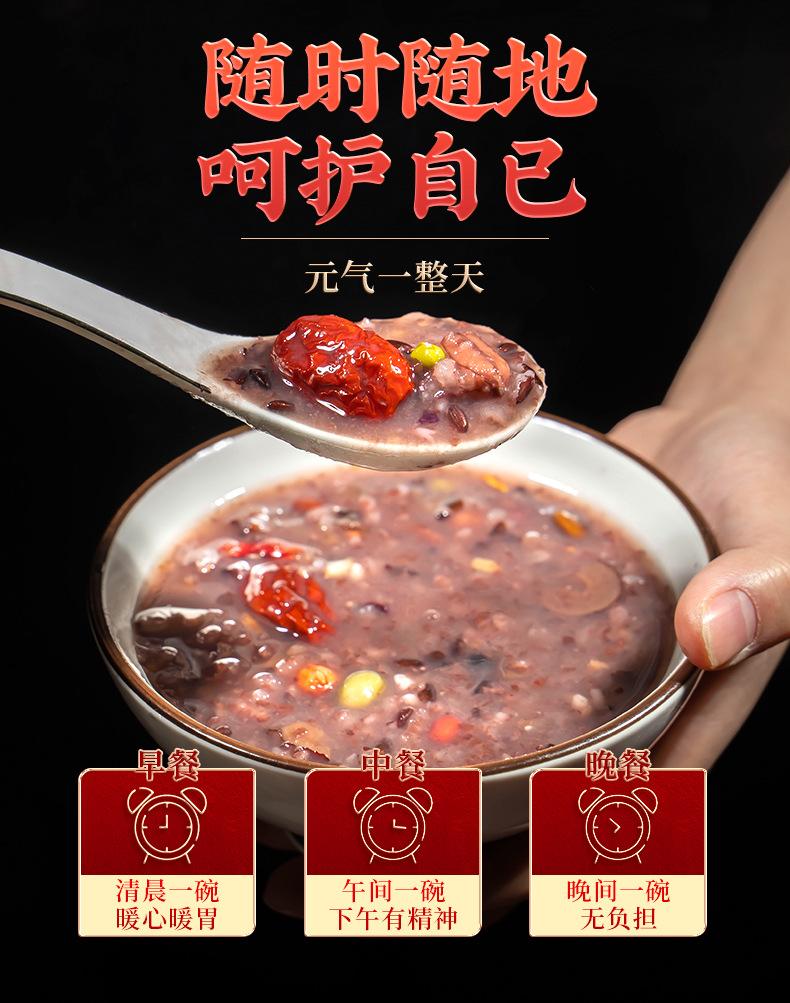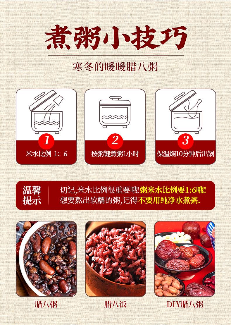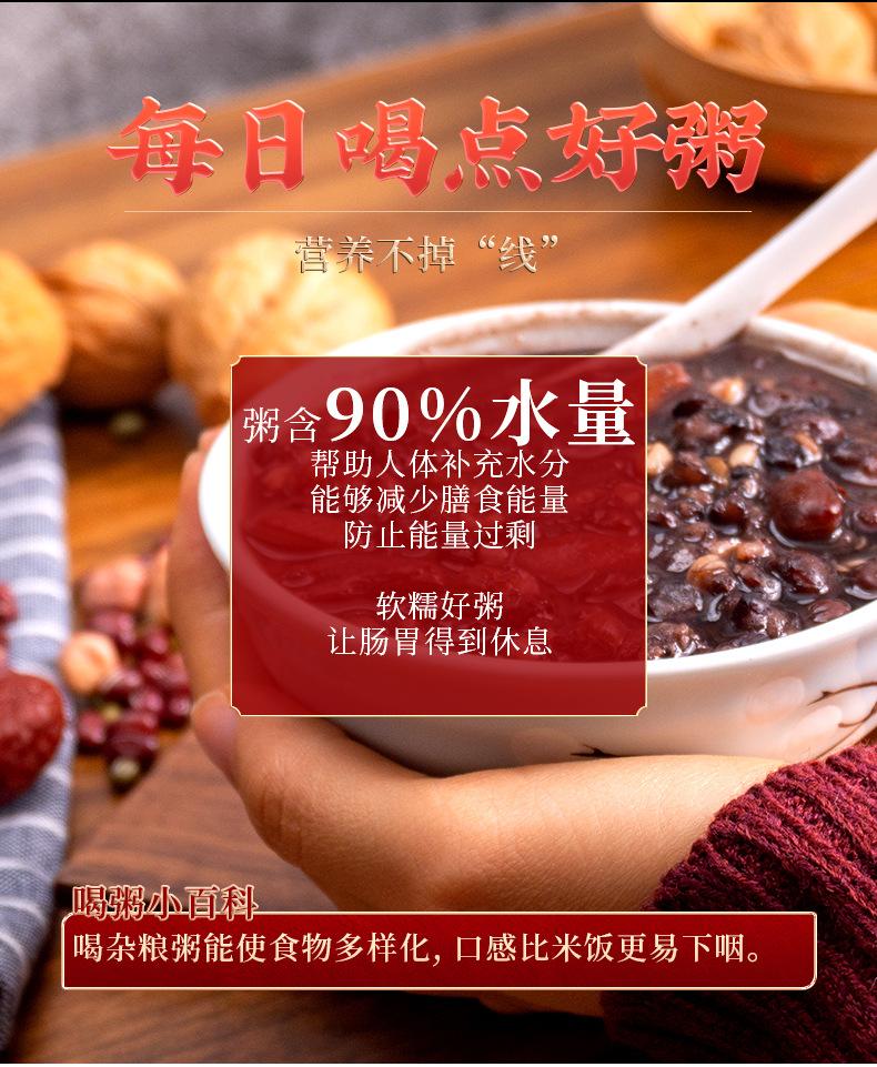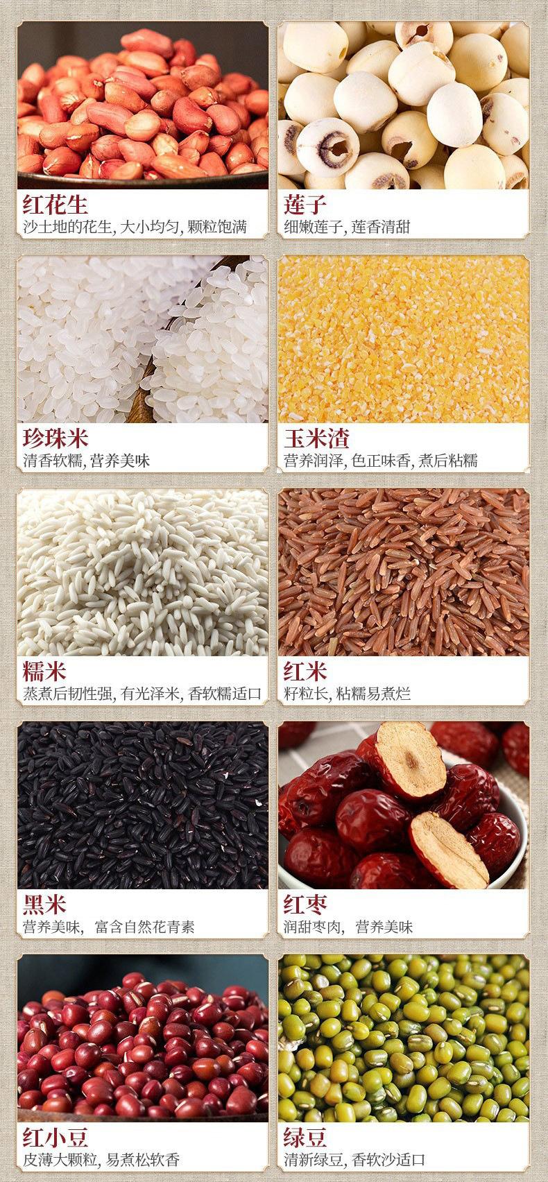 Pearl rice, corn flakes, glutinous rice, black rice, red rice, red dates, red bean, mung beans, red peanuts, lotus seeds