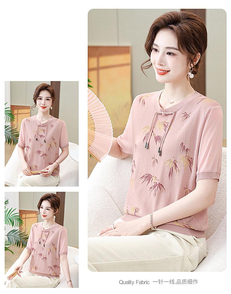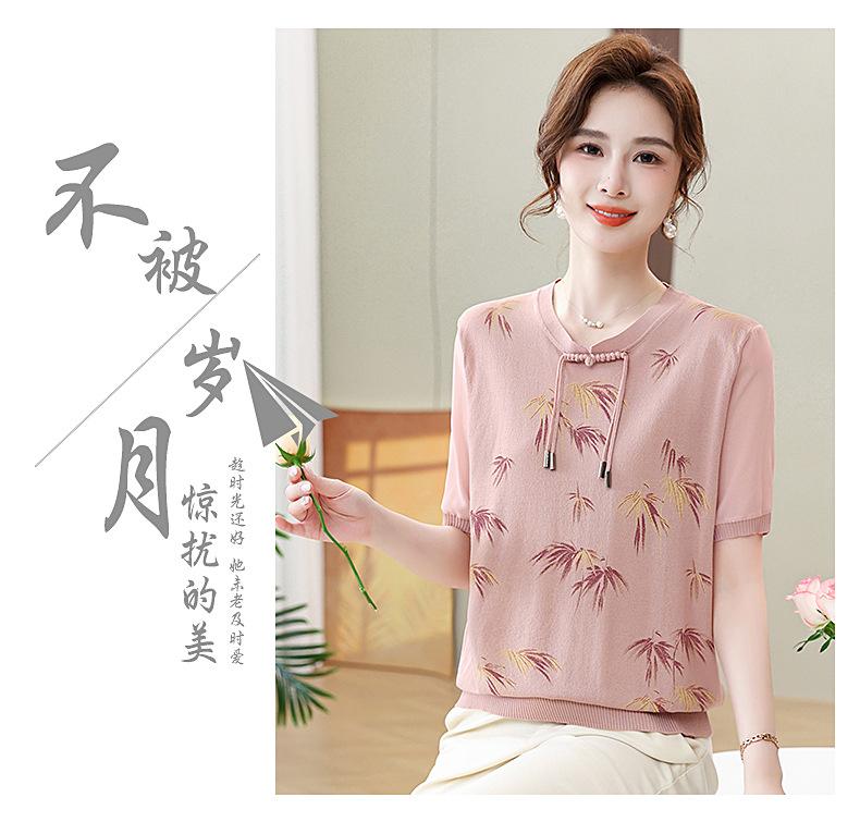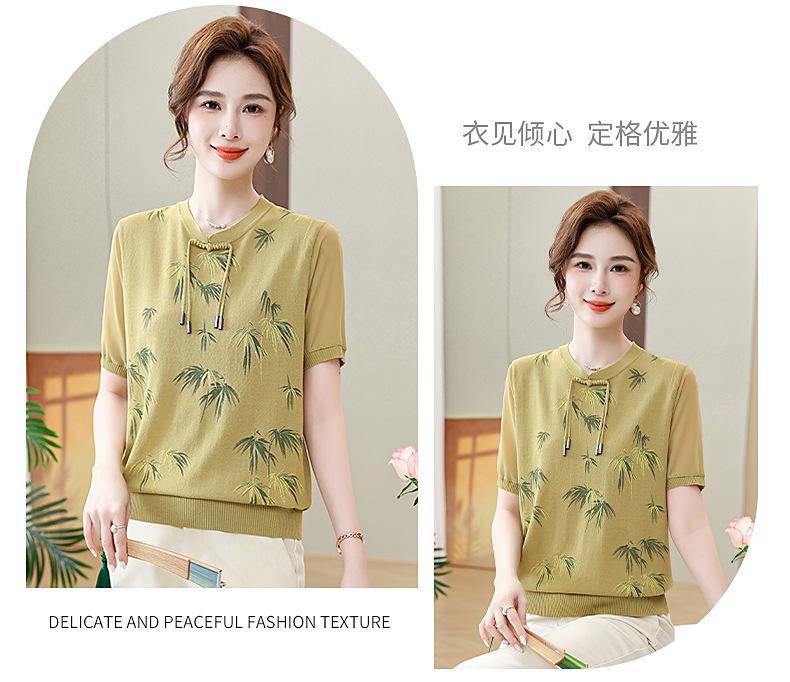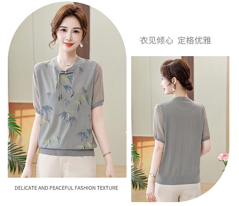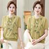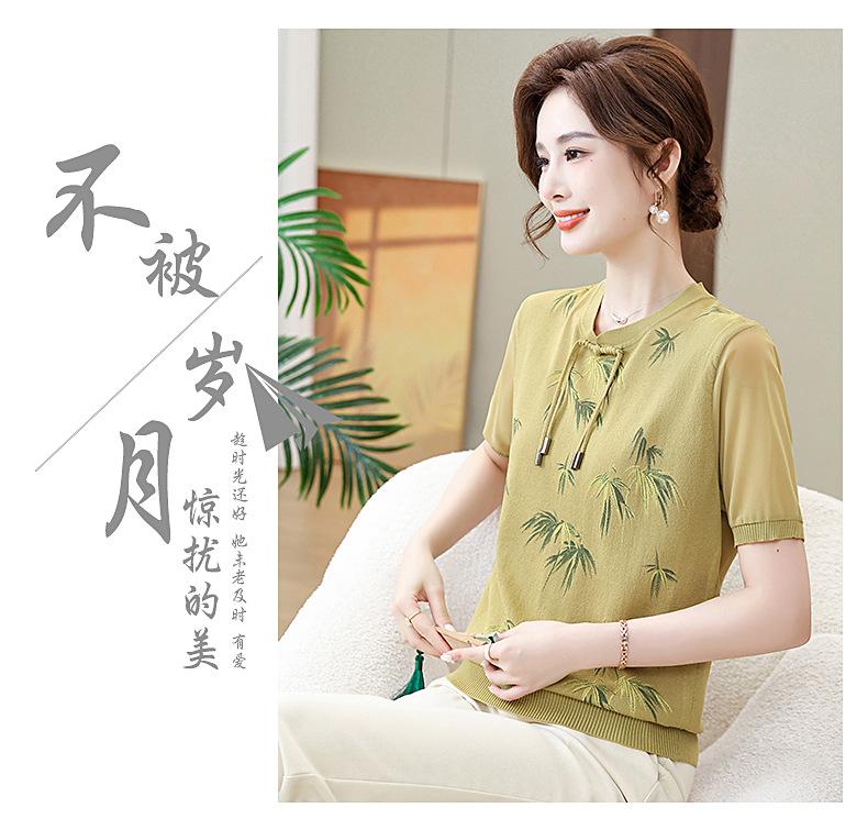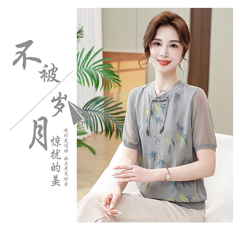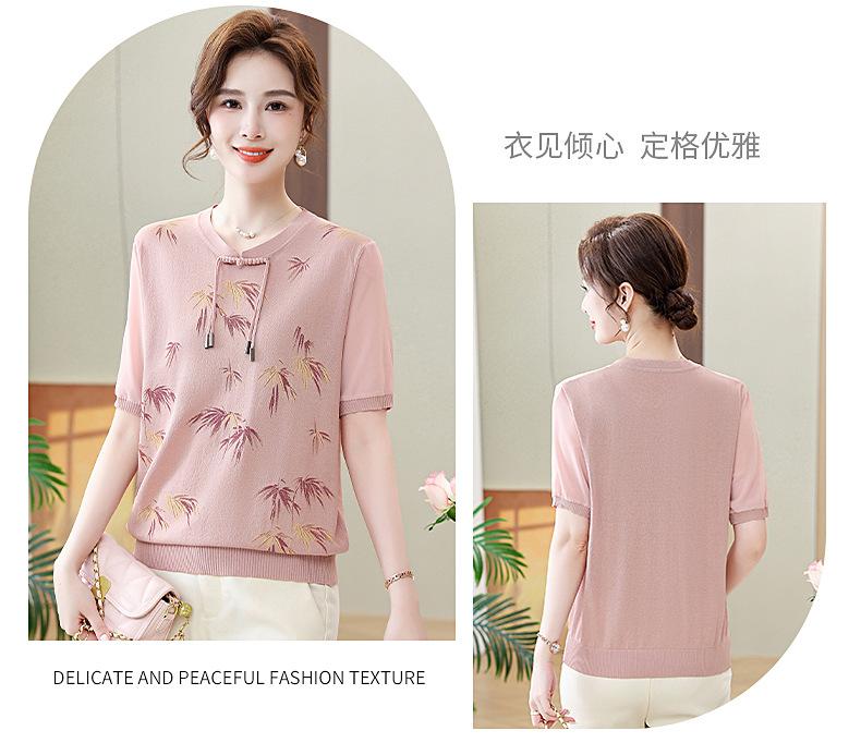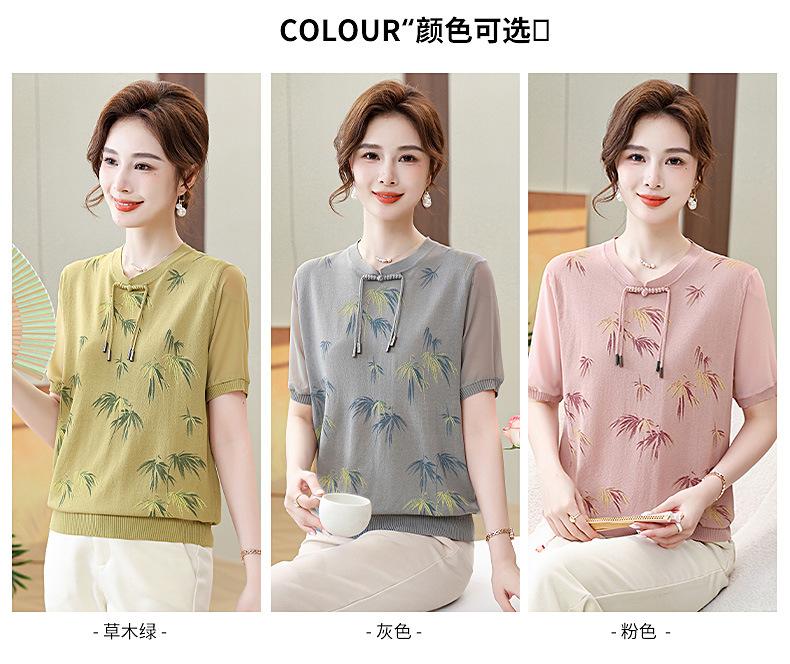 2024 Nuevo Verano Estilo Nacional para Madres Camisa Tejida de Seda Helada Moda para Mujeres de Mediana Edad y Mayores Camiseta de Manga Corta Top de Verano