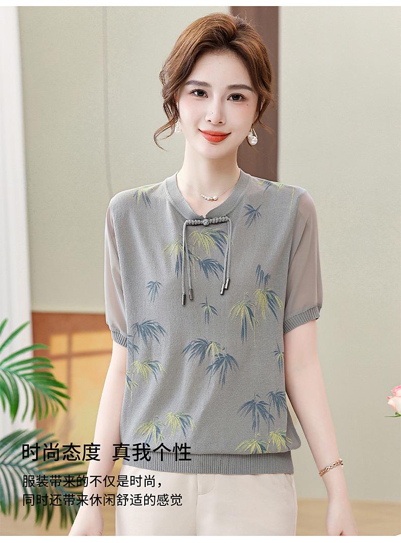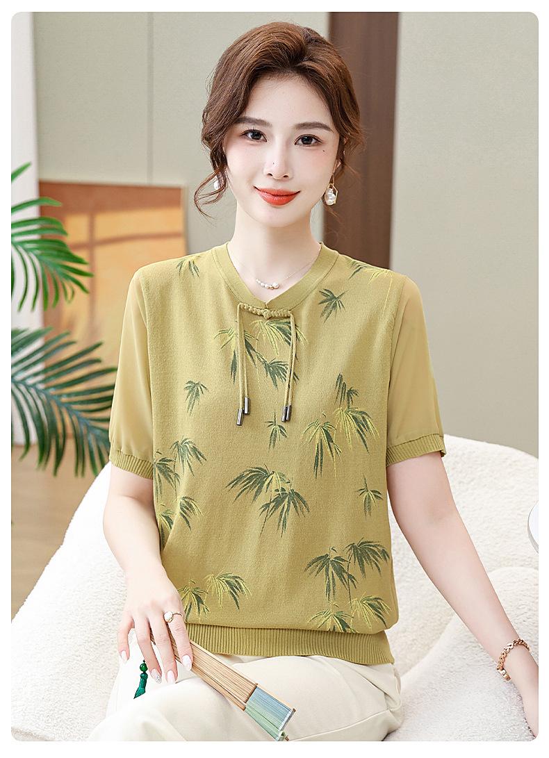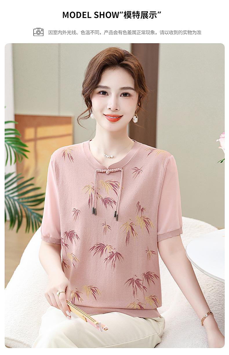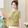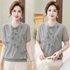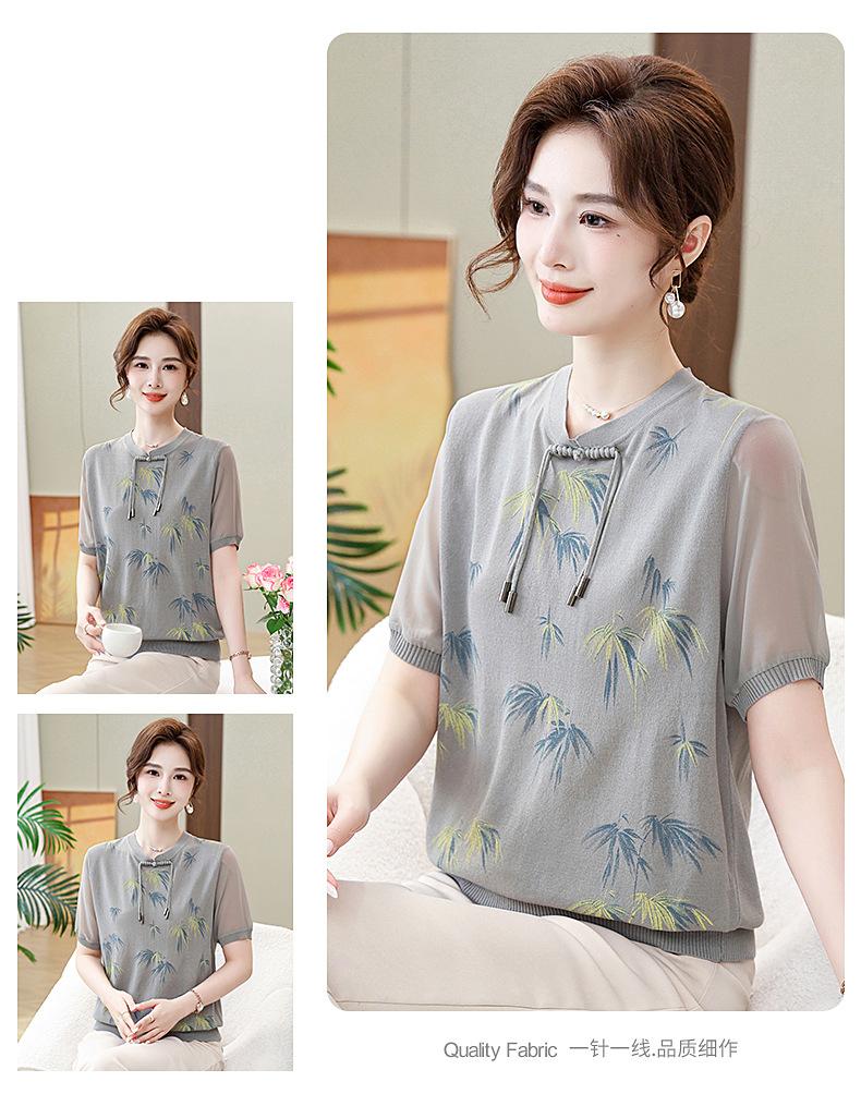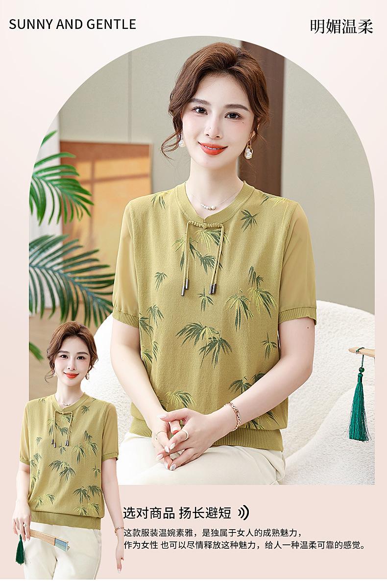2024 Nuevo Verano Estilo Nacional para Madres Camisa Tejida de Seda Helada Moda para Mujeres de Mediana Edad y Mayores Camiseta de Manga Corta Top de Verano