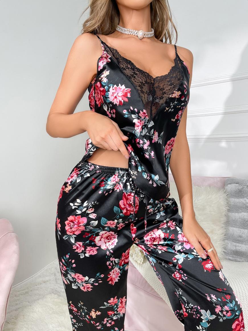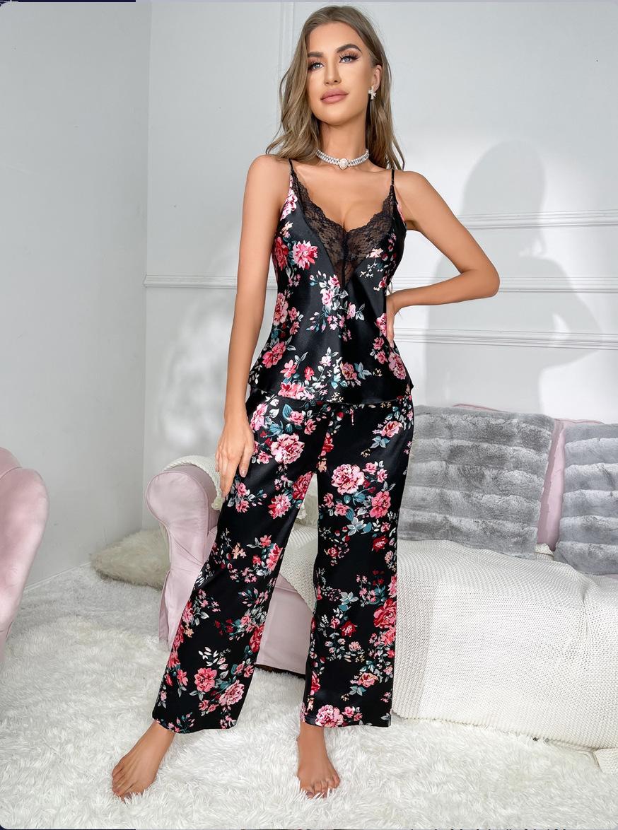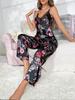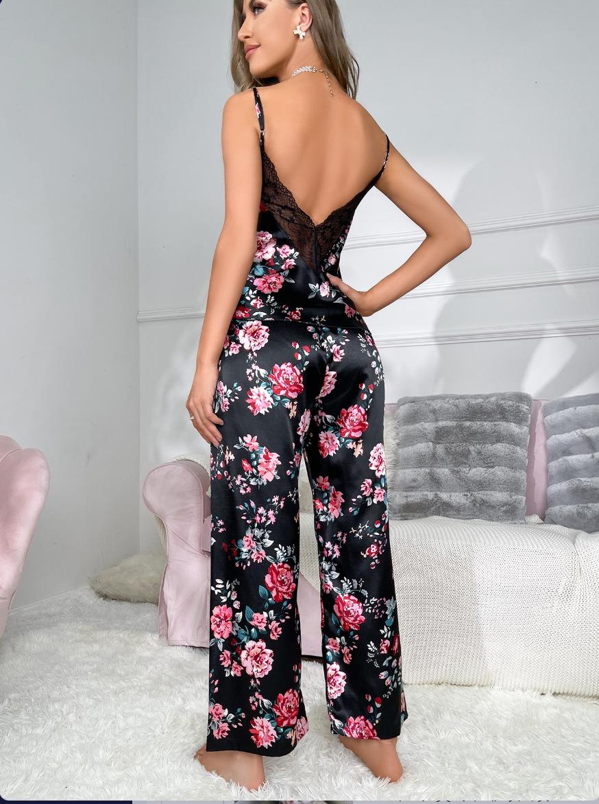 Traje de pantalón negro estampado con cuello en V, espalda grande descubierta de encaje, tirantes, traje de pijama cómodo