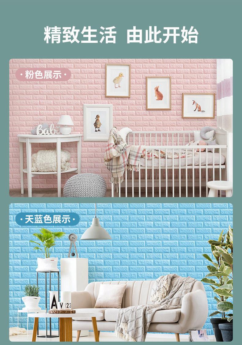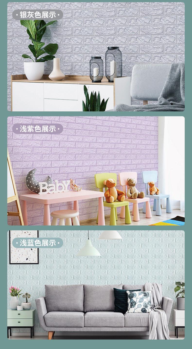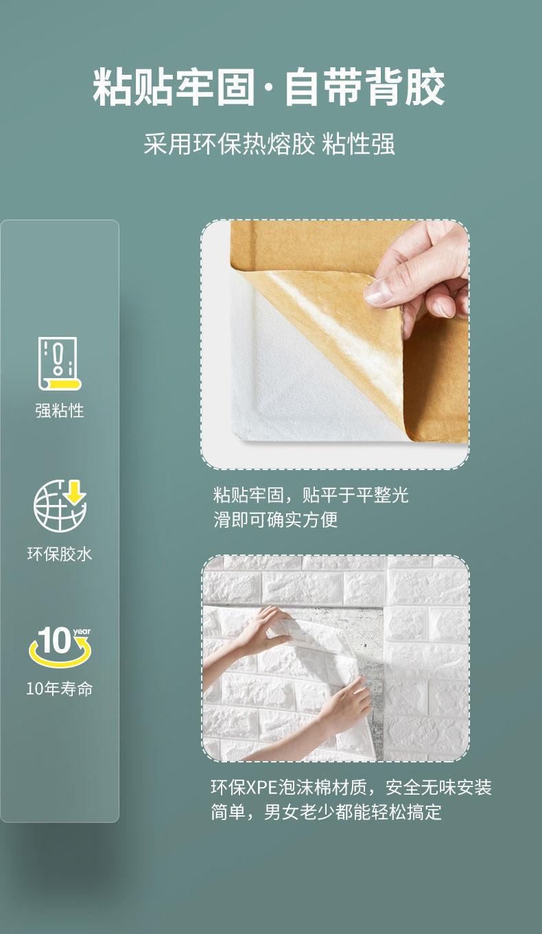2: Los adhesivos de pared están hechos de material xpe de paquete blando de espuma de alta densidad, que es insonorizado, aislante térmico, anticolisión, impermeable y el frente se puede fregar