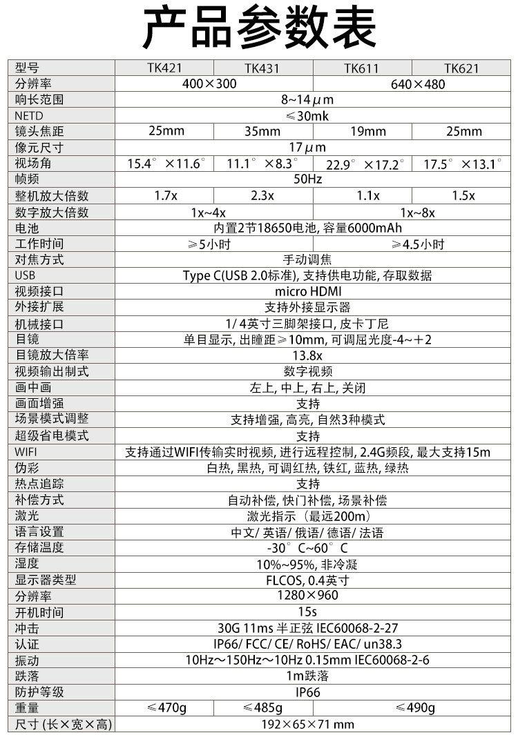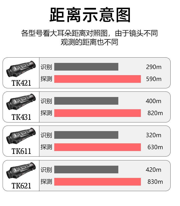 Tk421 detection distance (person) 700m, Tk431 detection distance (people) 1000m, Tk611 detection distance (per...