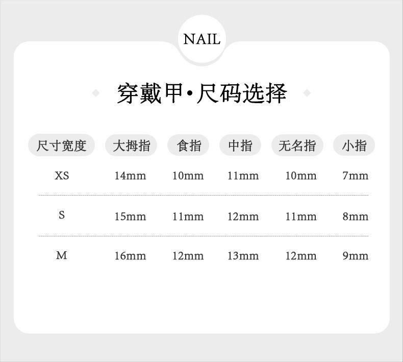 S (fits 70% of people to choose), M (meat hand|The choice for tall people), Xs (the nail bed is too small|Petites choose)