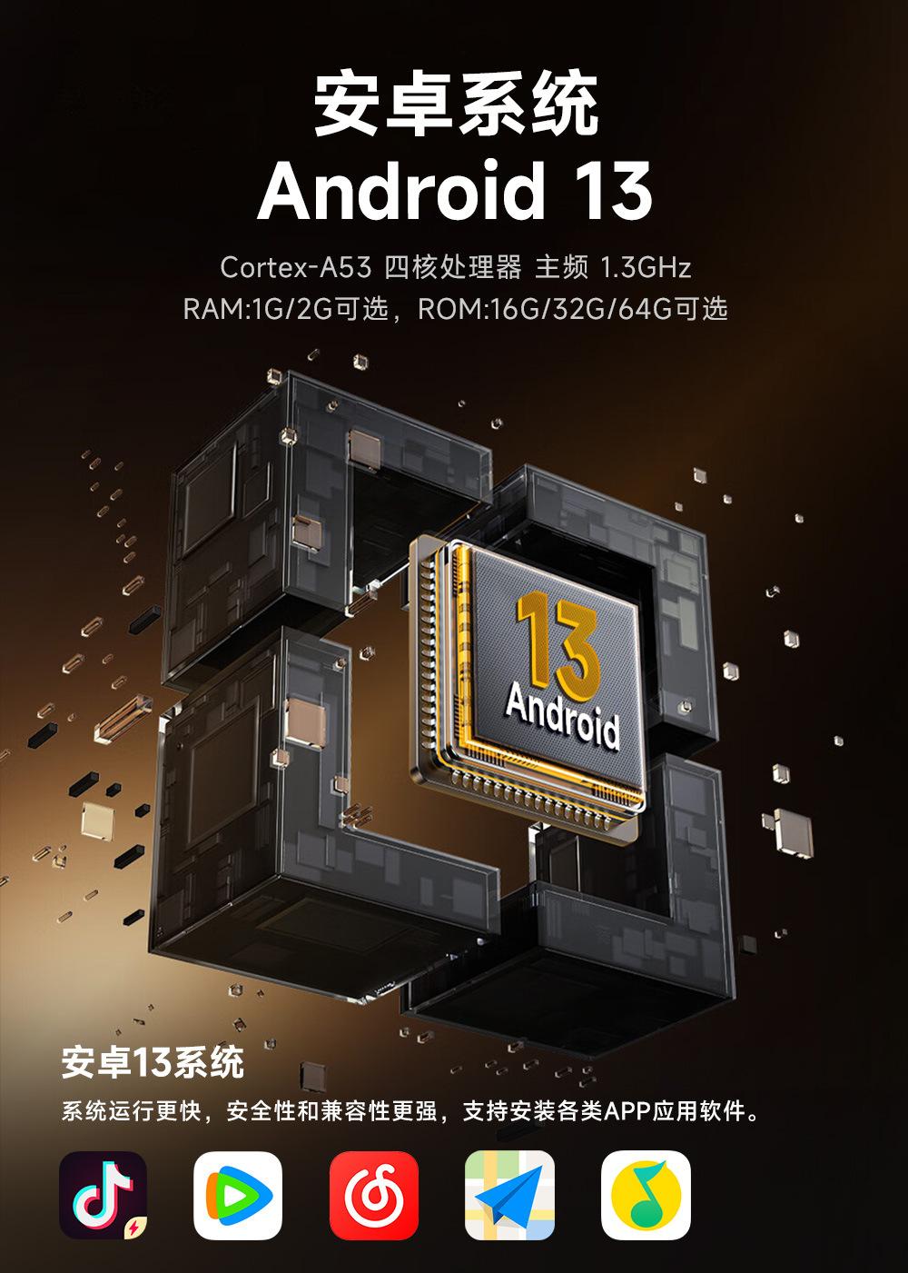 •Android 13, procesador de cuatro núcleos Cortex-A53 1G+32G (opcional 1+64G, 2+32G, 2+64G)