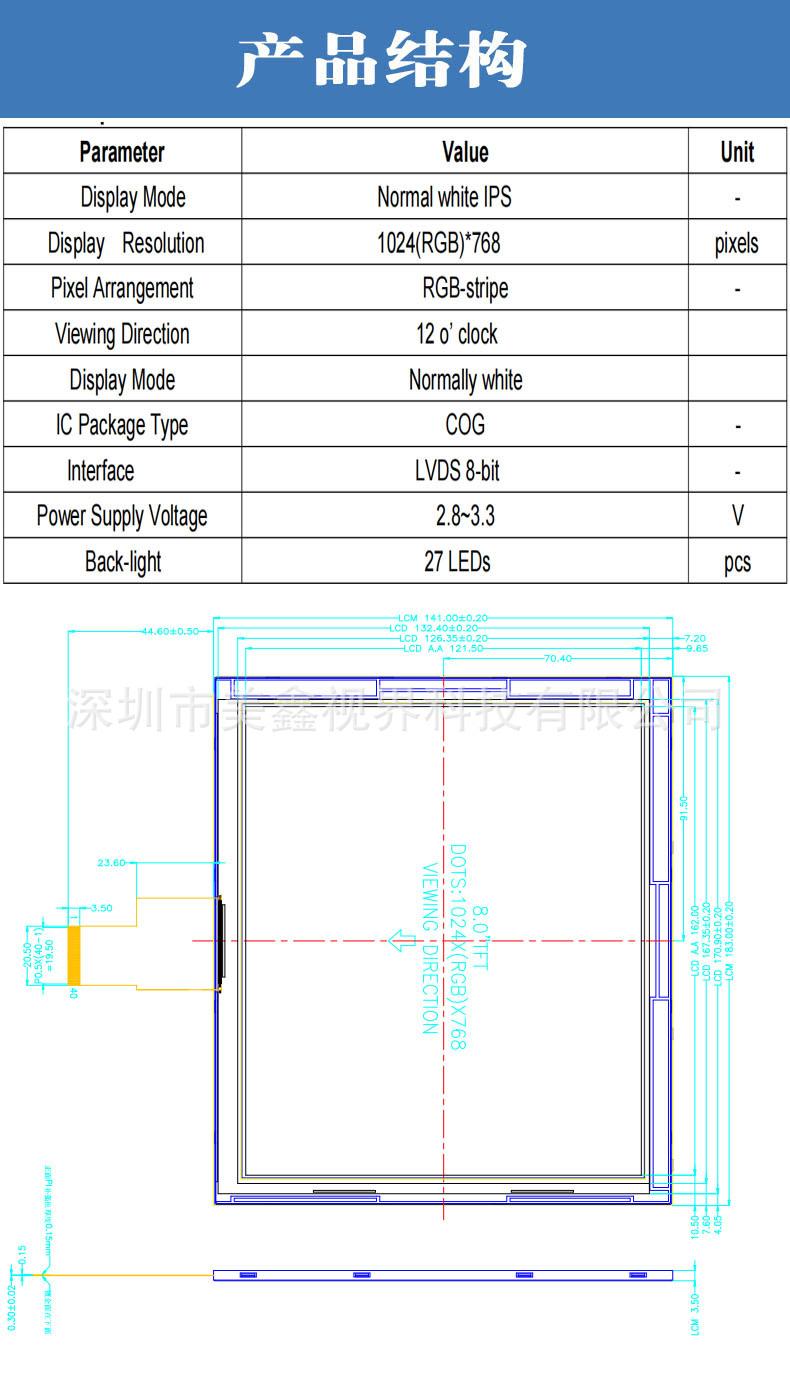 Pantalla LCD TFT de 8 pulgadas 1024*768 interfaz LVDS 40PIN alto brillo temperatura amplia pantalla médica de control industrial