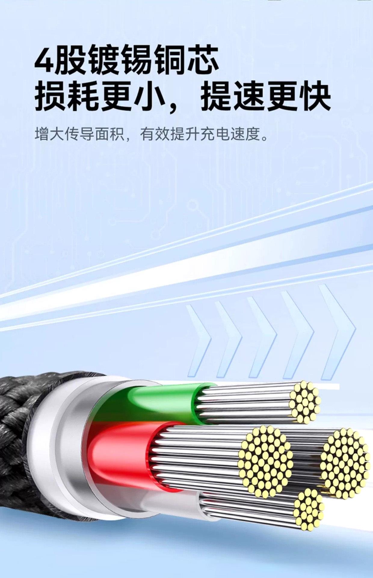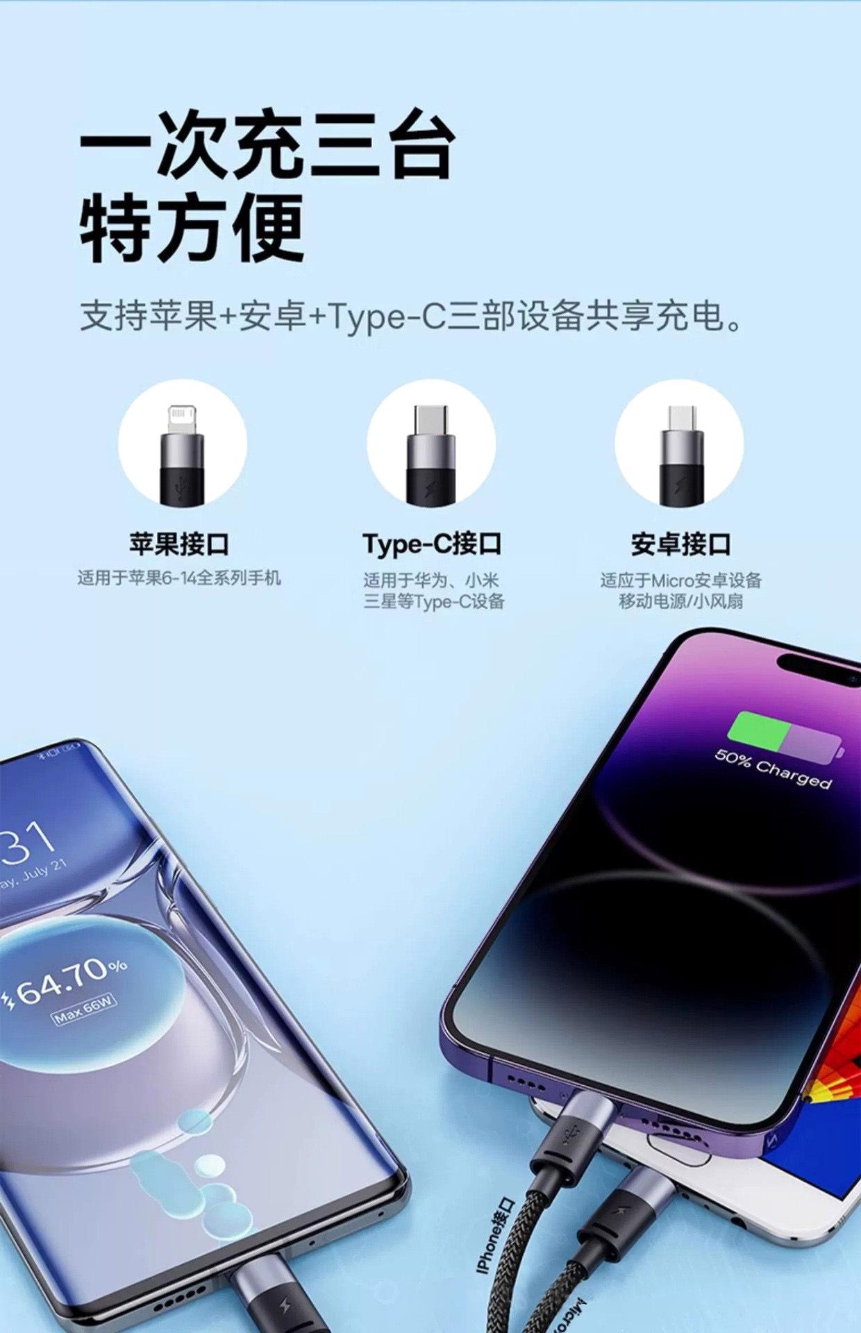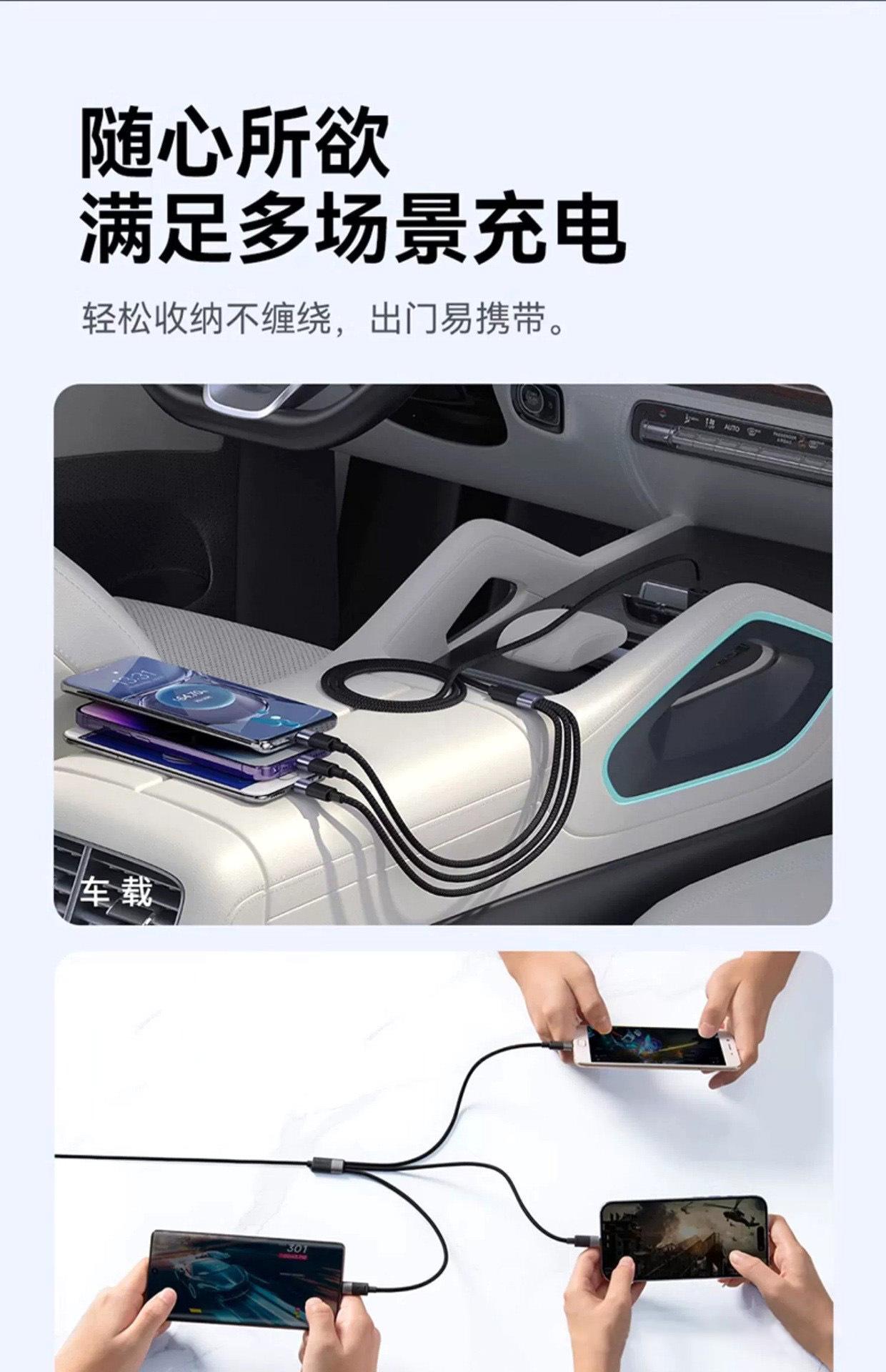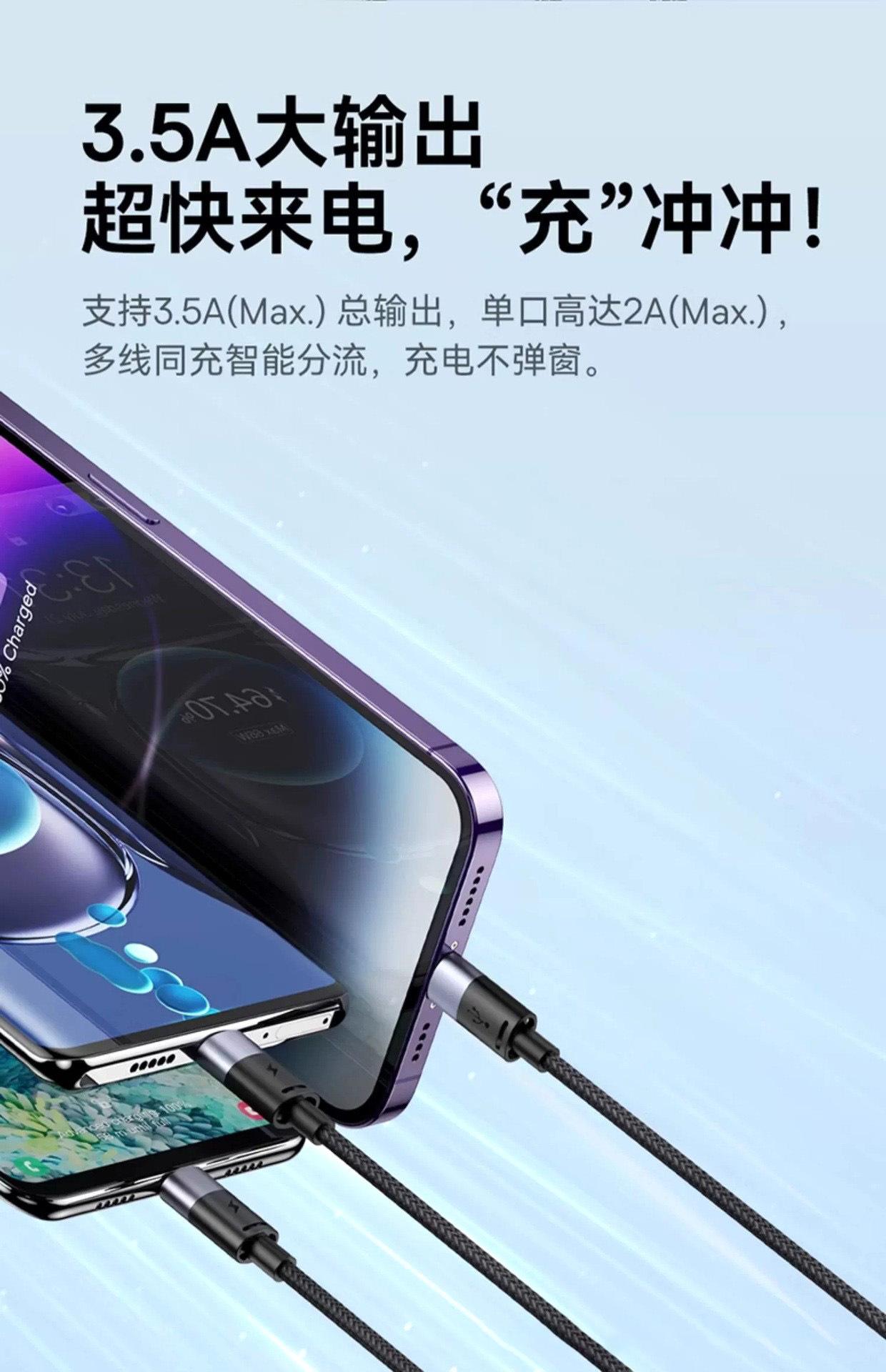 Línea de datos tres en uno de carga súper rápida de 5 A, línea de carga flash de 120 W para línea de carga de teléfono móvil Apple Huawei Tipo-C