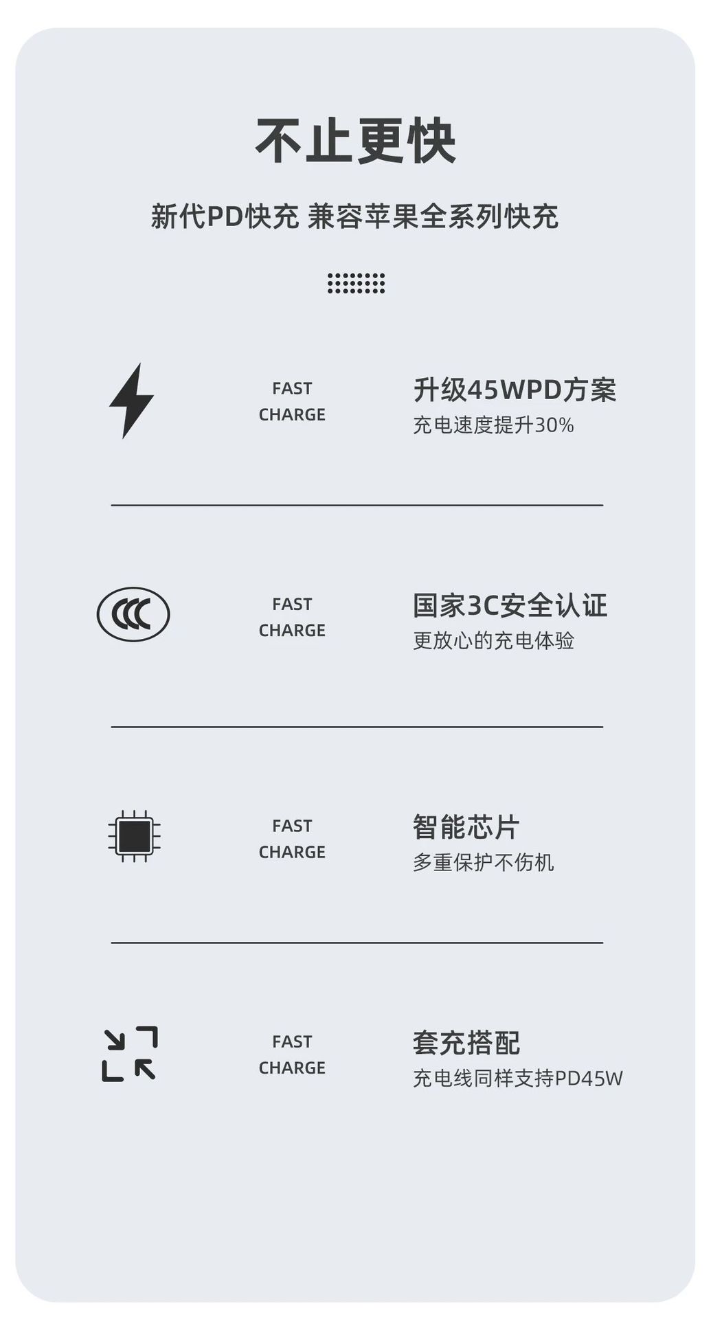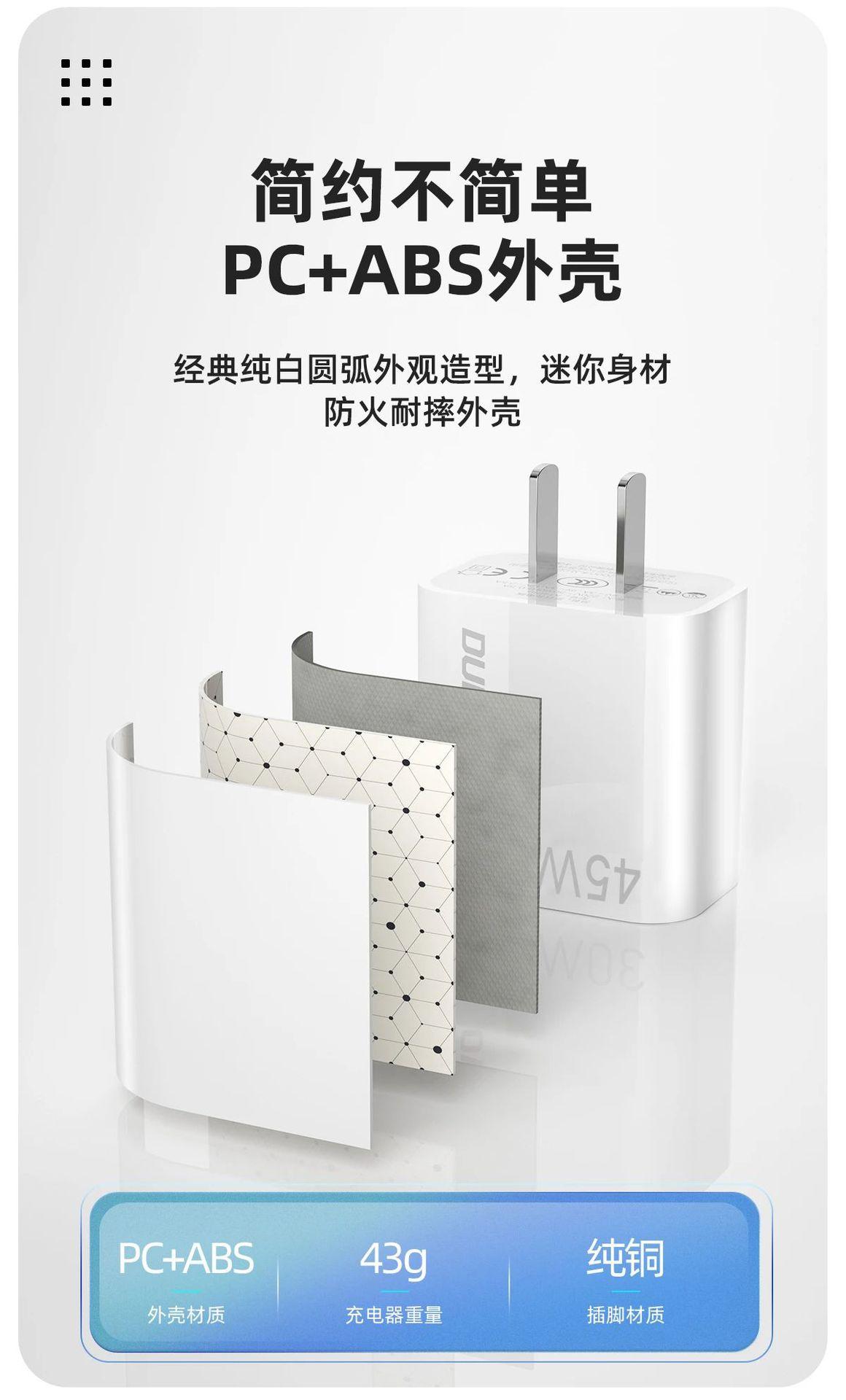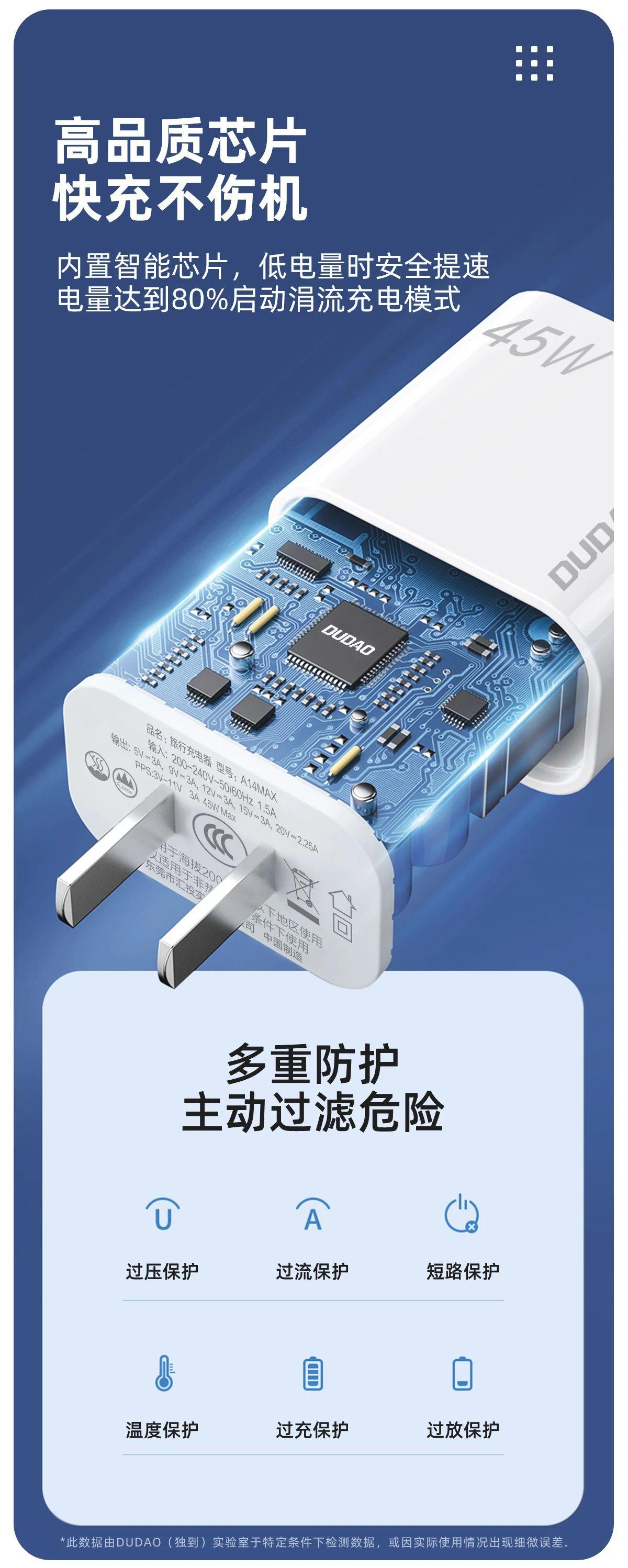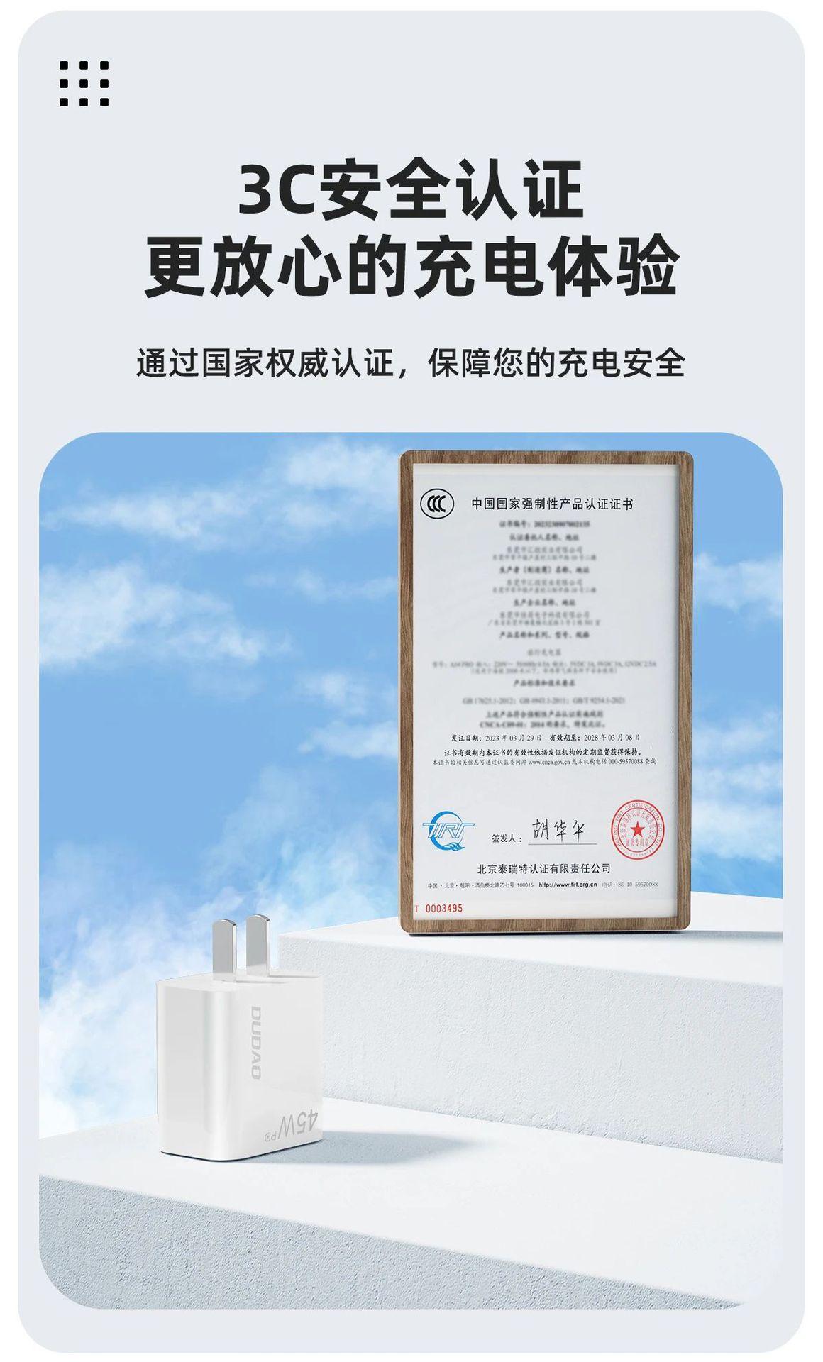 ·Certificación de seguridad 3C, experiencia de carga más segura; chip inteligente incorporado, acelera de forma segura cuando la batería está baja, inicia el modo de carga lenta cuando la batería alcanza el 80%, protección contra sobrecarga, cortocircuito y sobretensión.