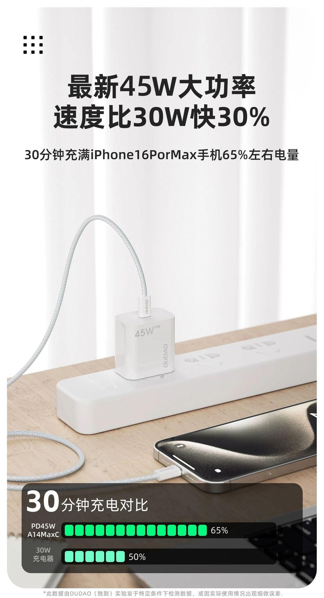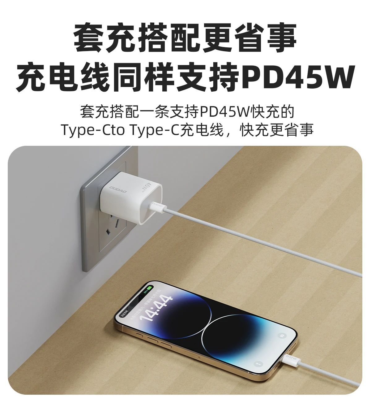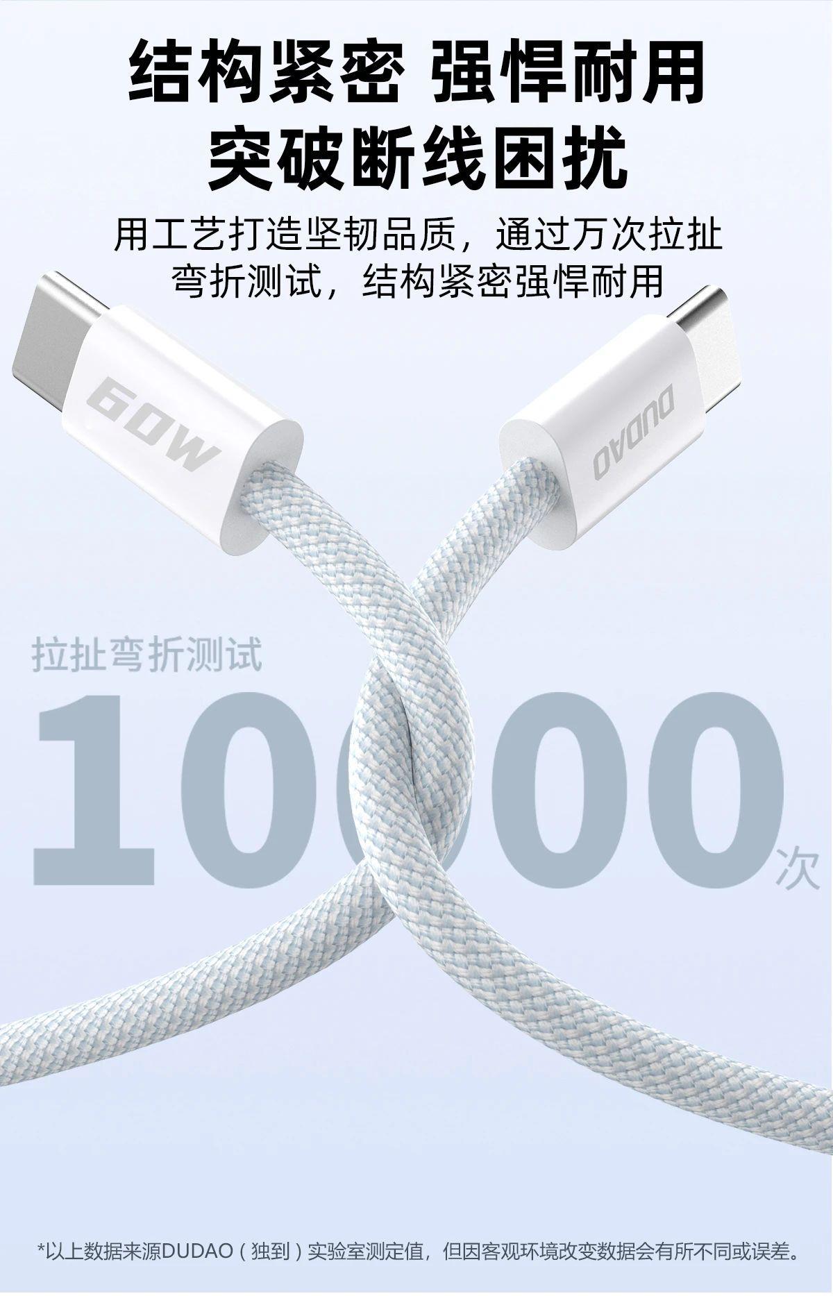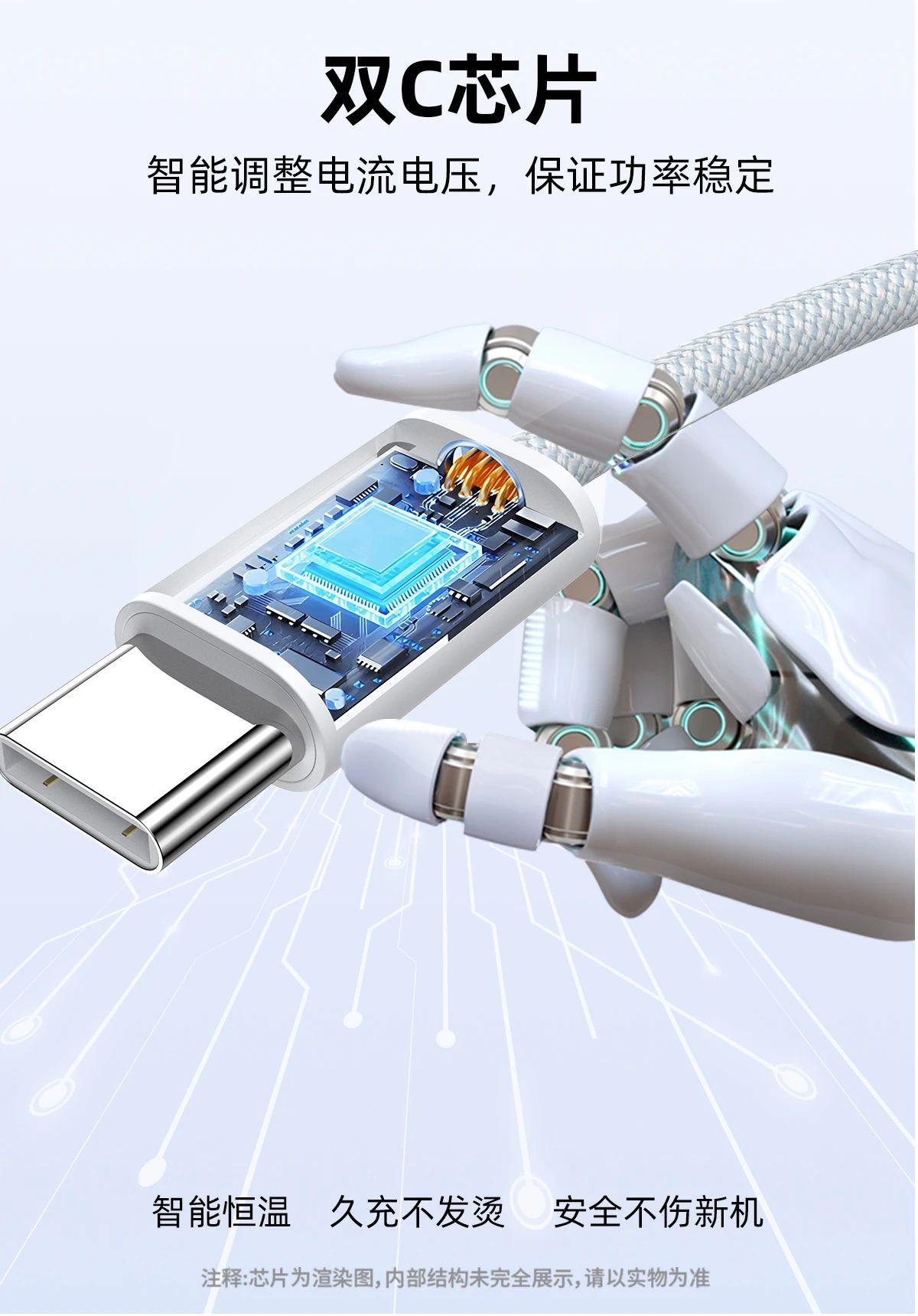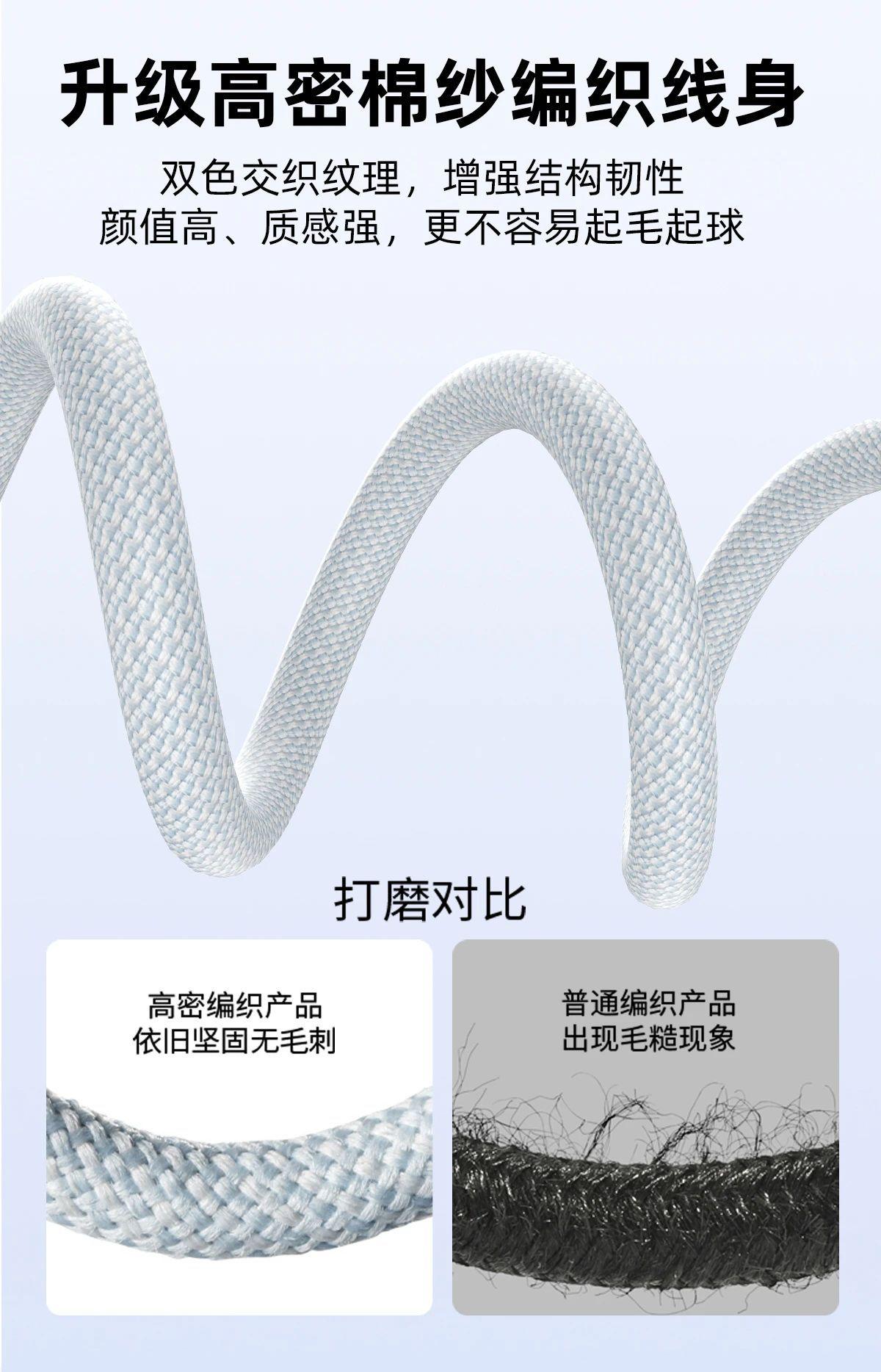 El cable de carga está hecho de alambre trenzado de hilo de algodón de alta densidad mejorado, que no se romperá después de miles de dobleces y admite carga rápida PD45W.