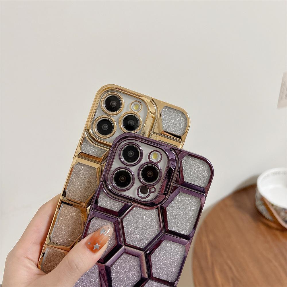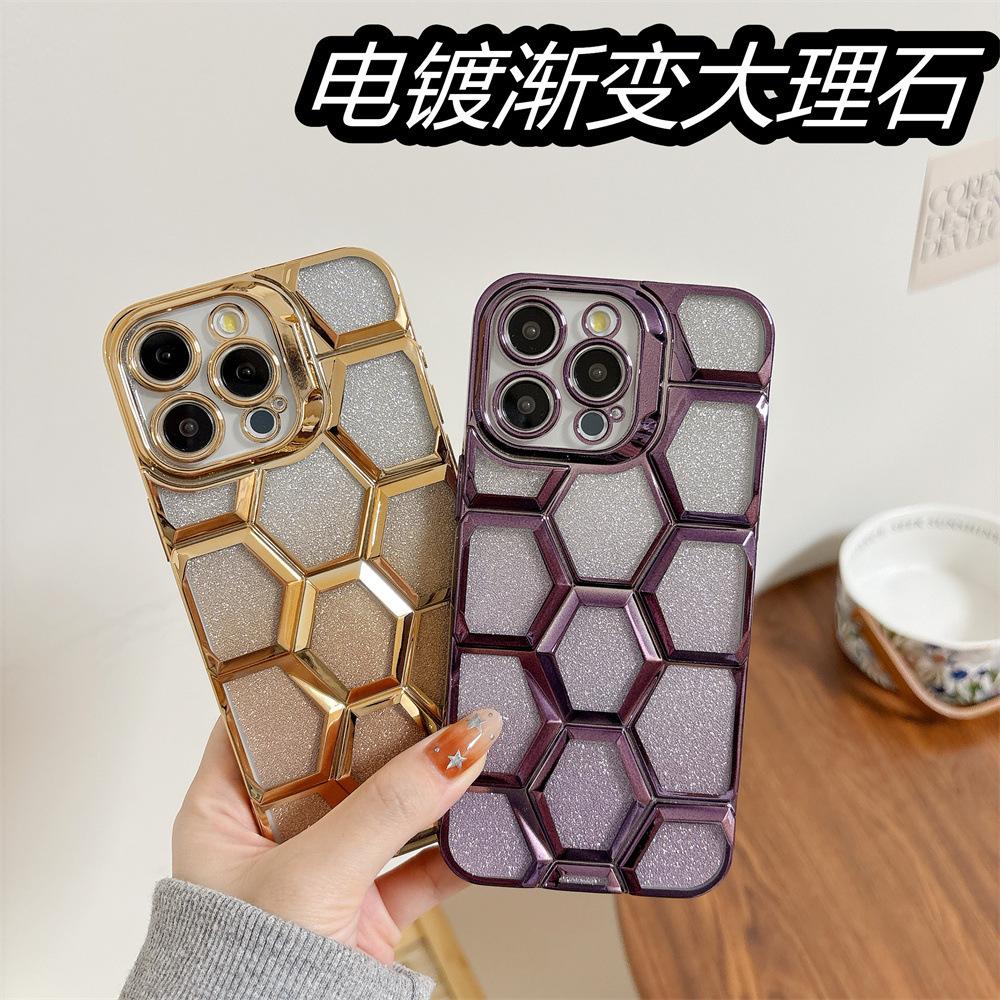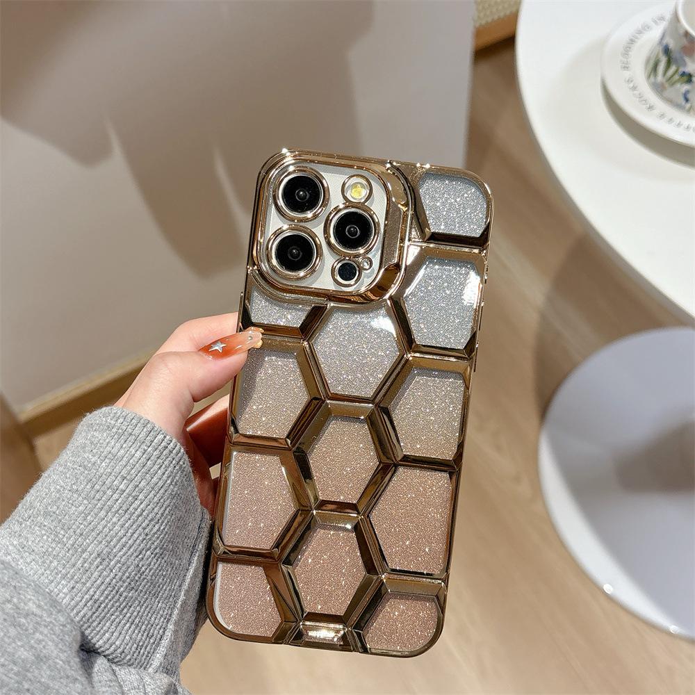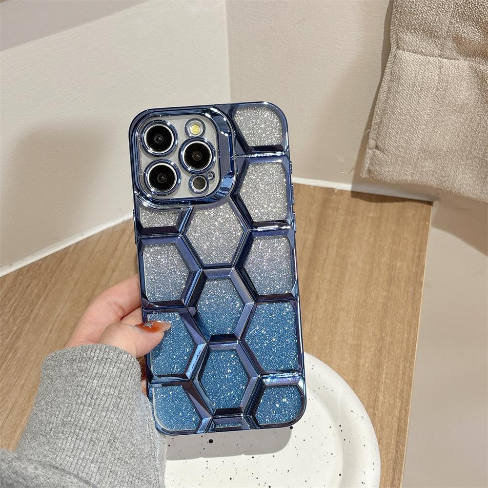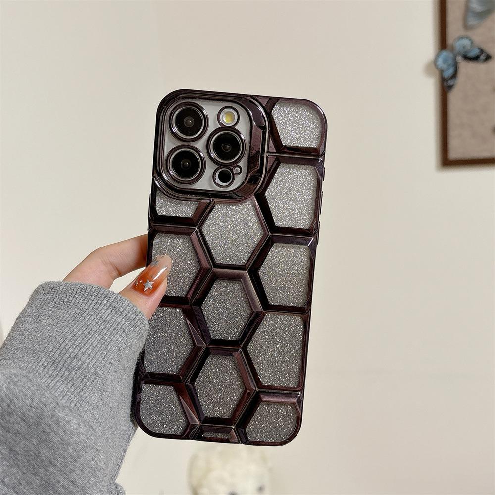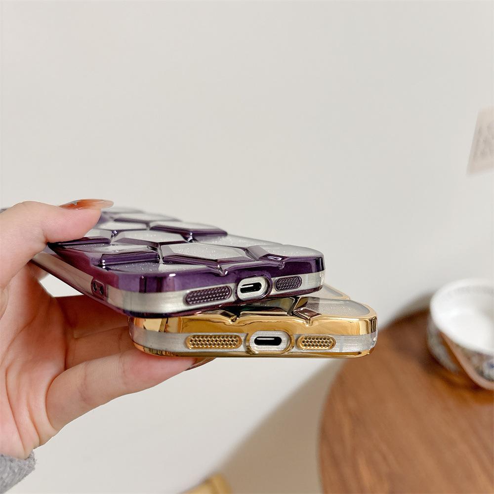 Funda de teléfono electrochapada romboidal tridimensional simple para iPhone 16/15 Pro Max, funda protectora de cartón con purpurina degradada