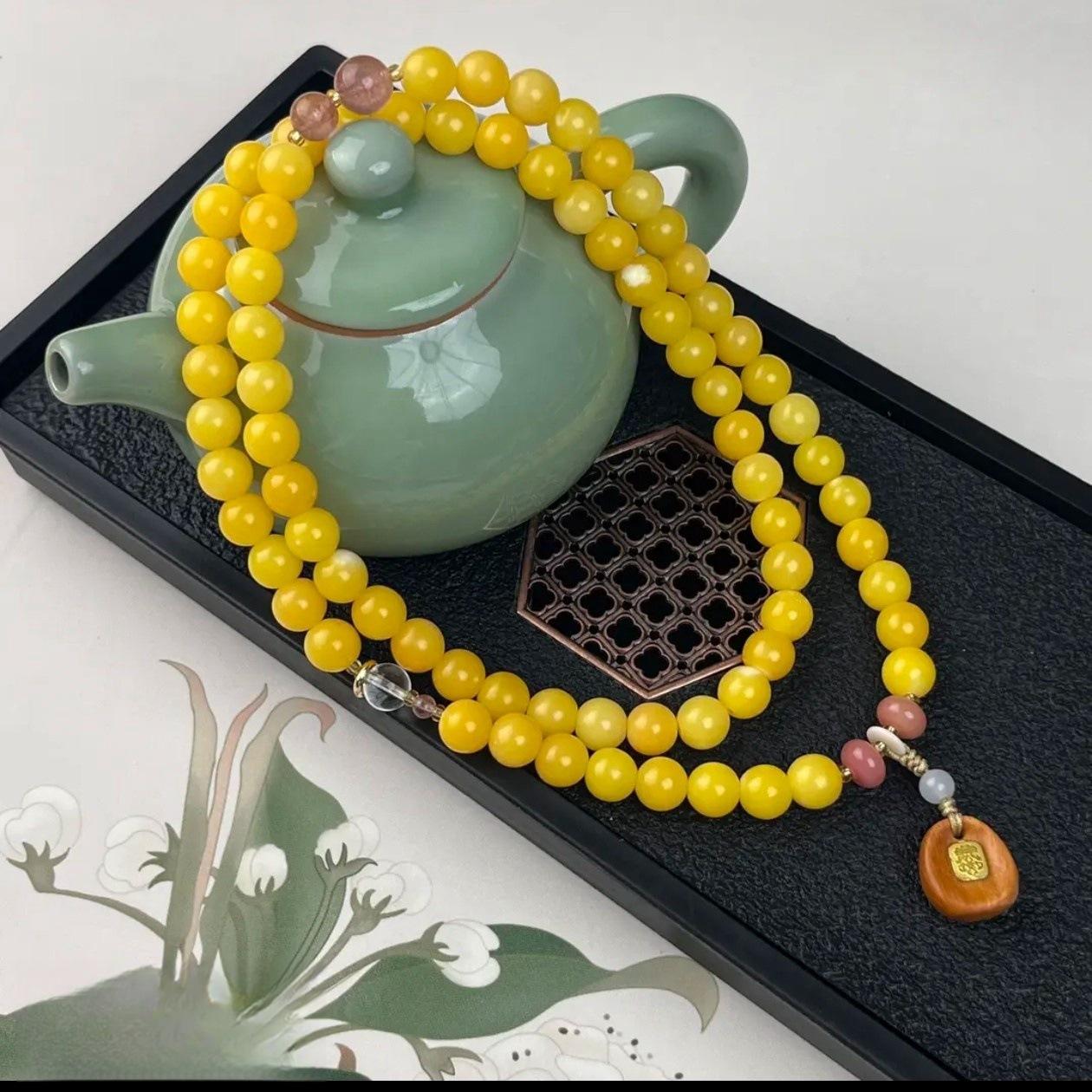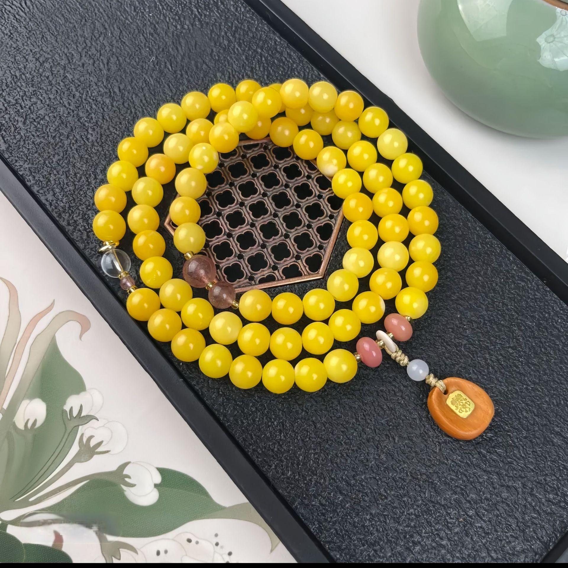 Collar de cuentas de Buda con 108 cuentas redondas de cera de abejas, raíz de bodhi amarilla, multianillo, para hombres y mujeres.