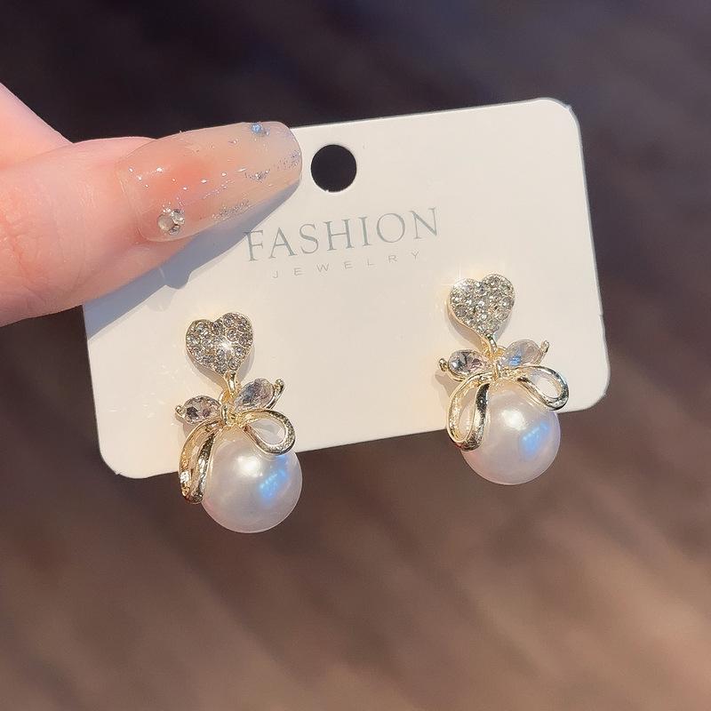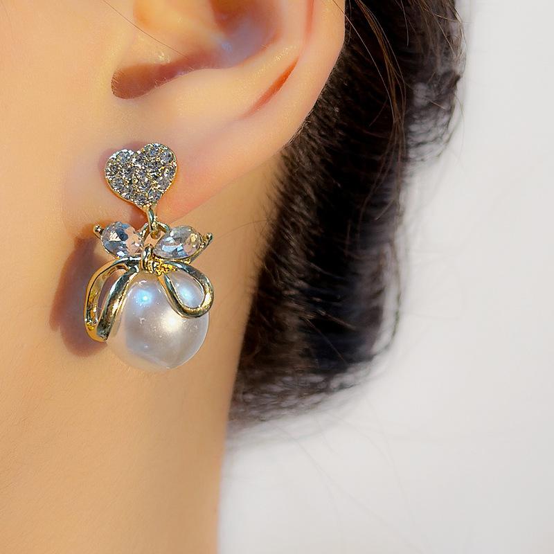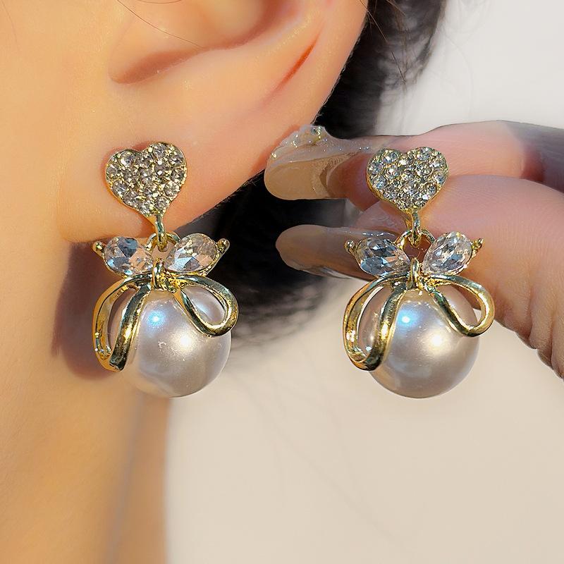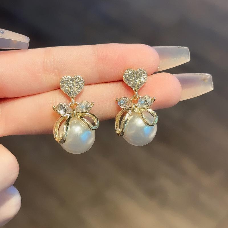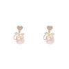 Moda Coreana Versátil Zirconia Micro-Incrustada Corazón Lazo Perla Aretes Elegantes Primavera