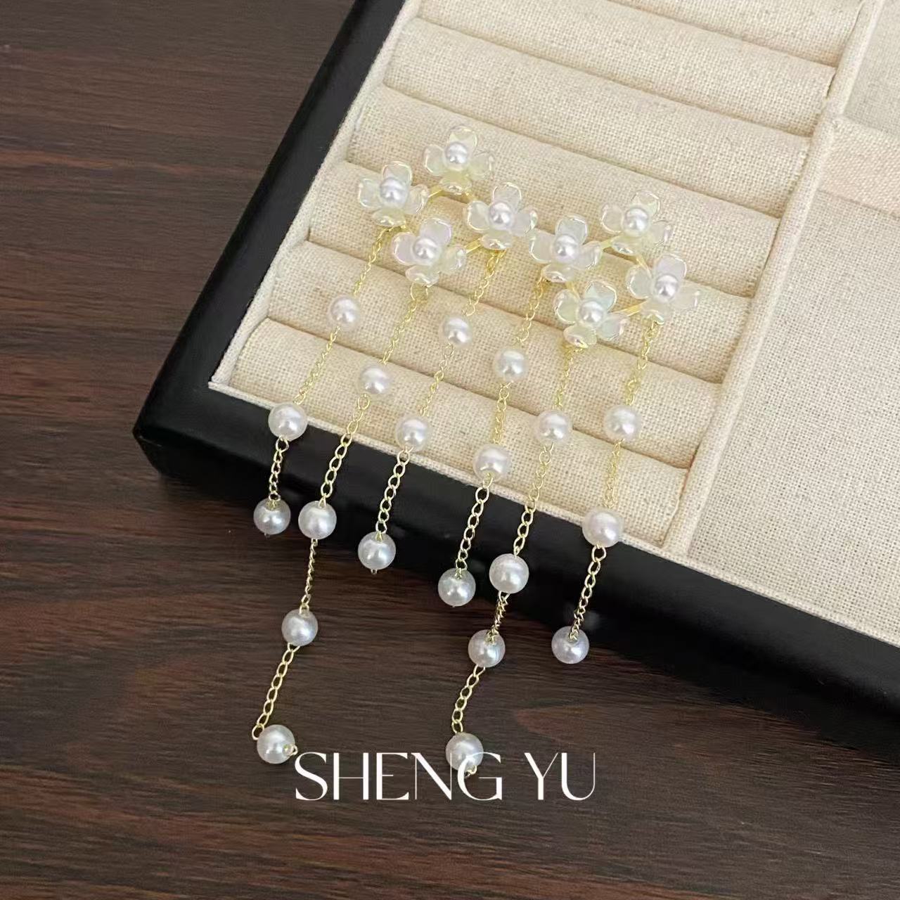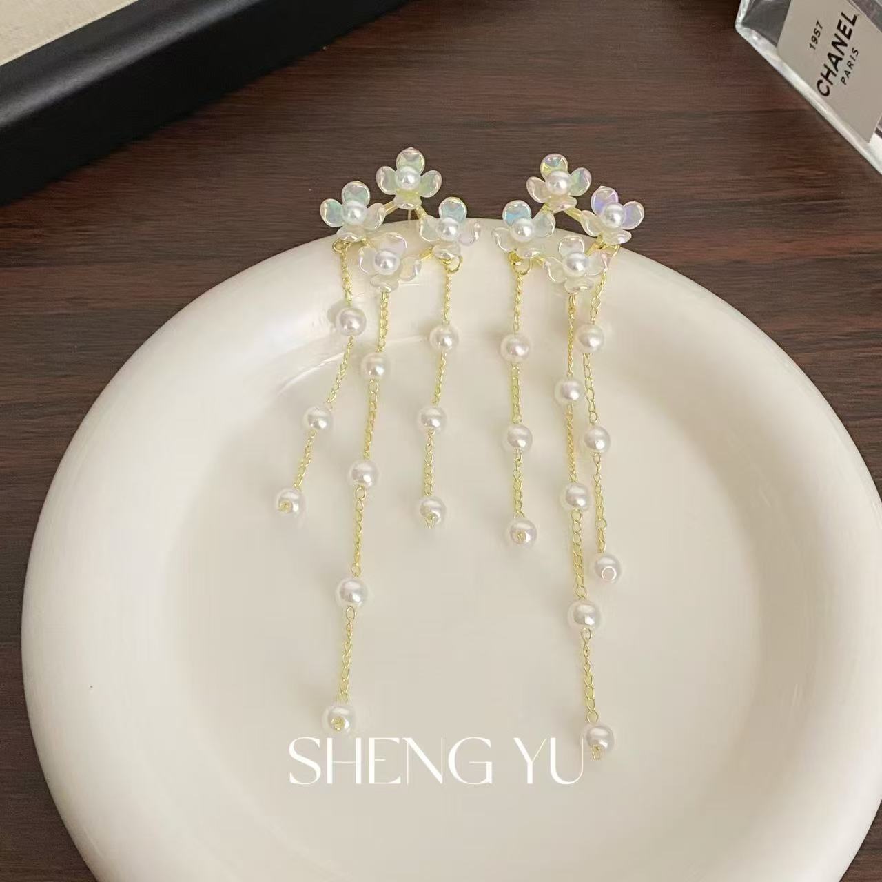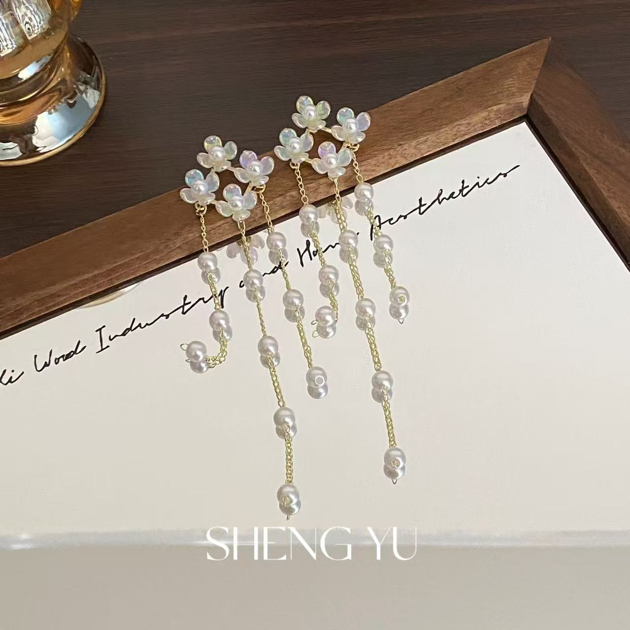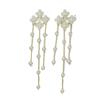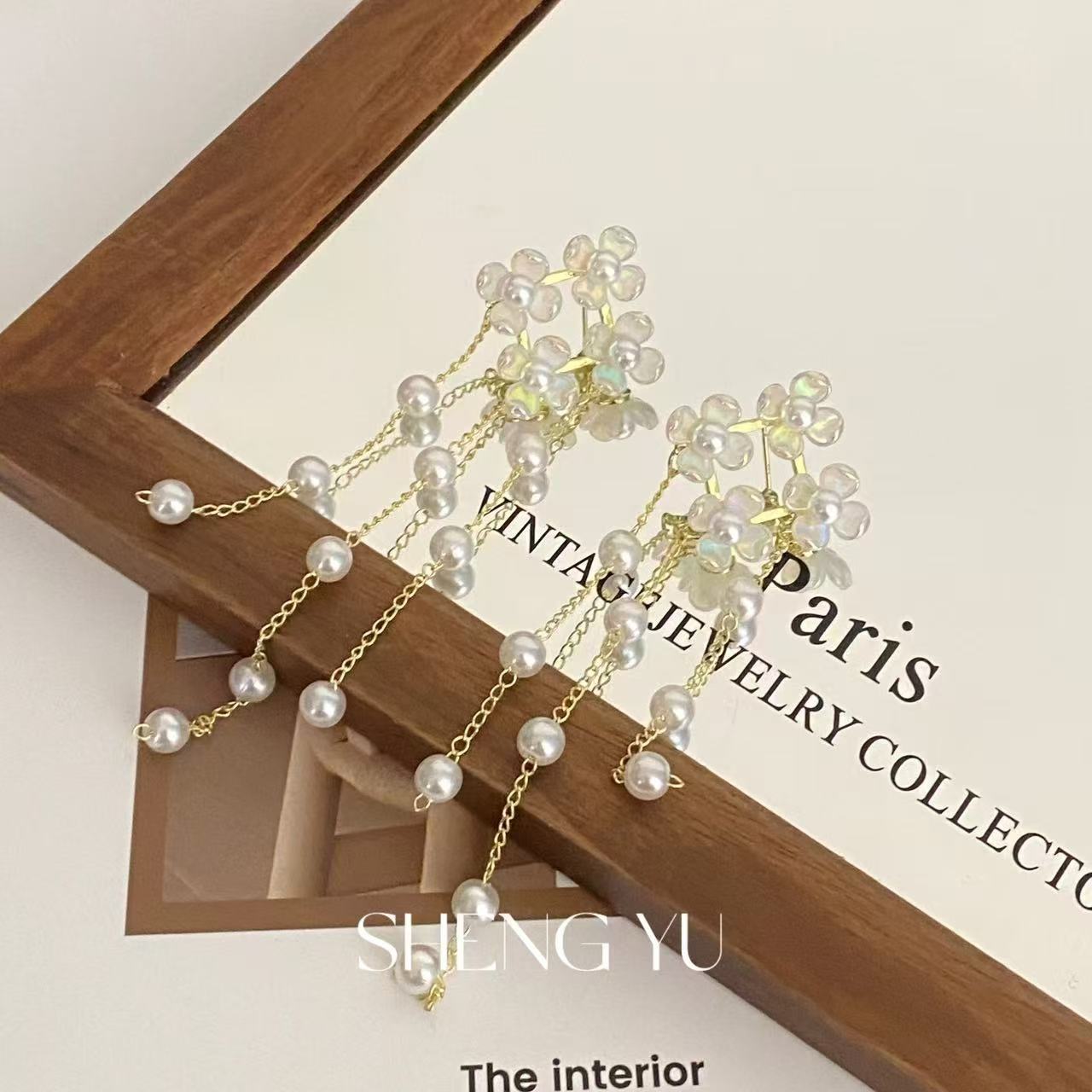 Pendientes de borlas de perlas y flores frescas de estilo francés, exquisitos, ligeros, de lujo, de gran valor estético, pendientes largos y sencillos y accesorios para las orejas.