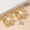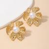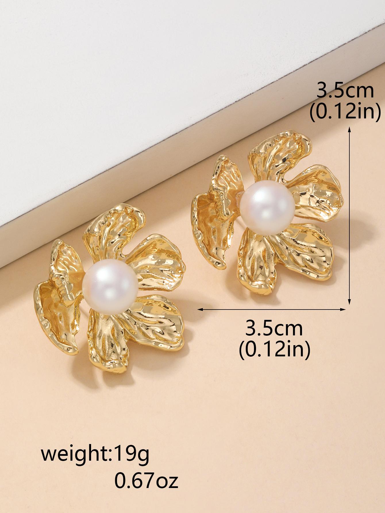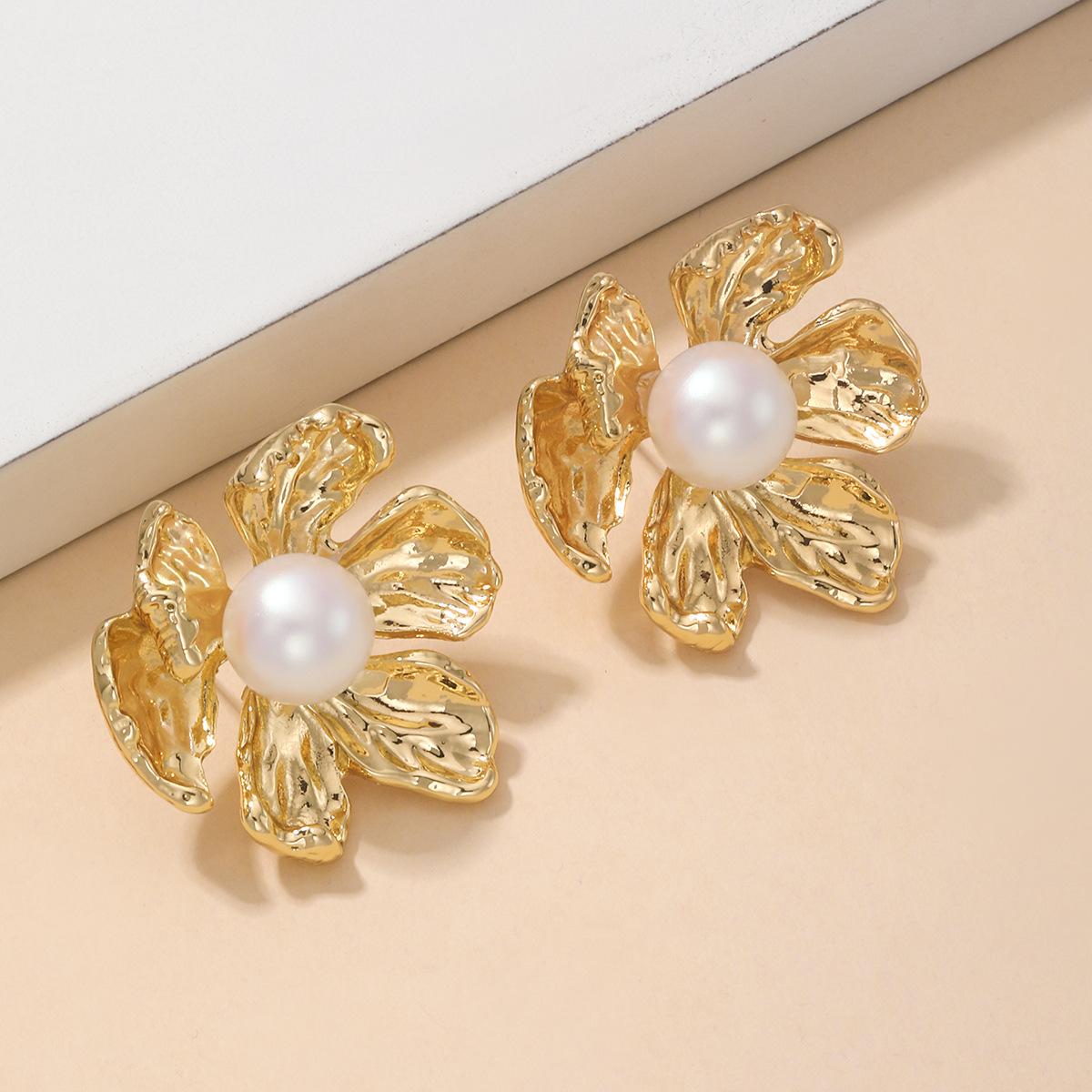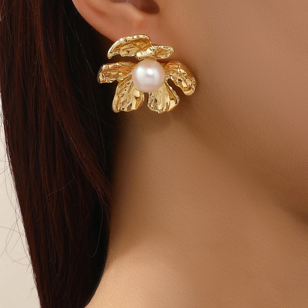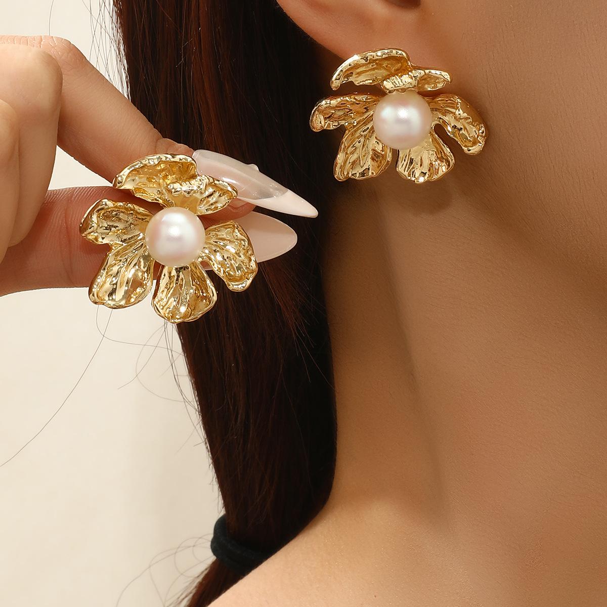 Aretes de Flores de Metal con Perlas de Estilo Frío Ins, Distintivos, Exagerados, de Alta Gama, Modernos, Versátiles, Elegantes