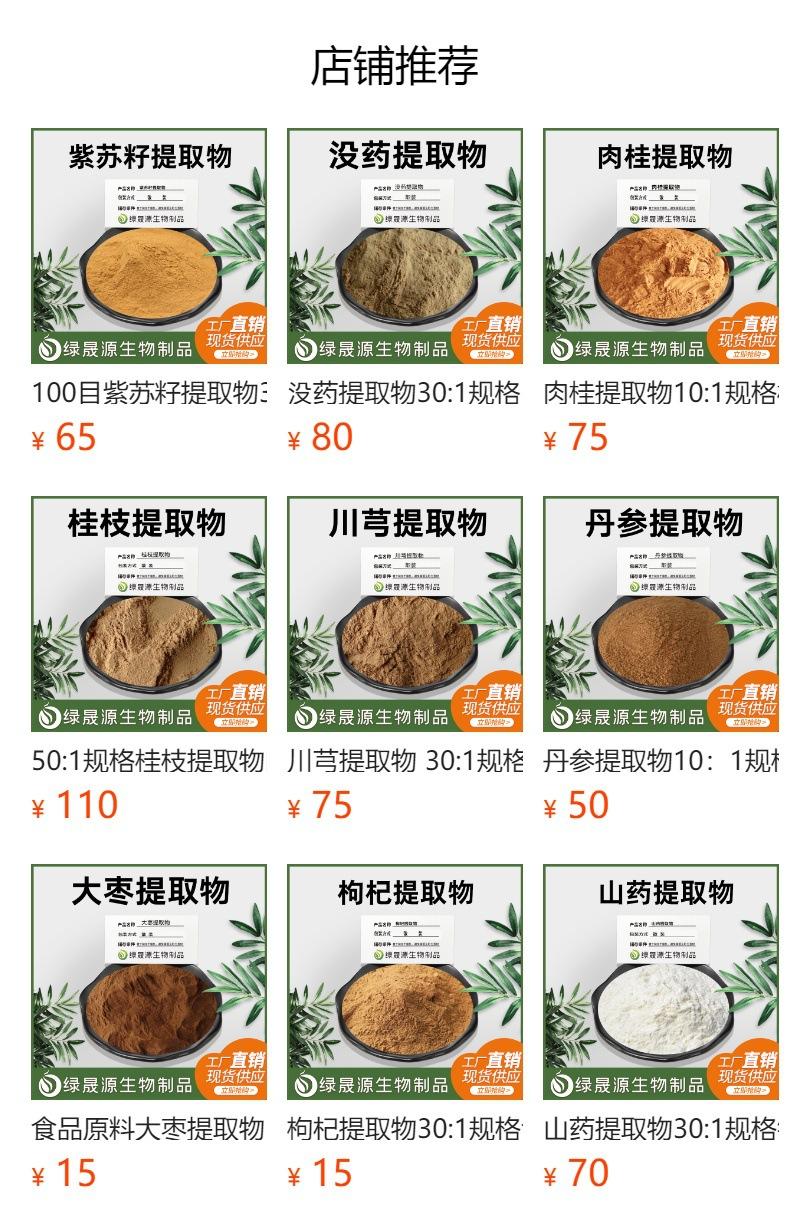[Proceso de producción]: cribado de materias primas, limpieza de materias primas, 3 veces de extracción, concentración, secado por aspersión en polvo, tamizado y esterilización, y envasado.