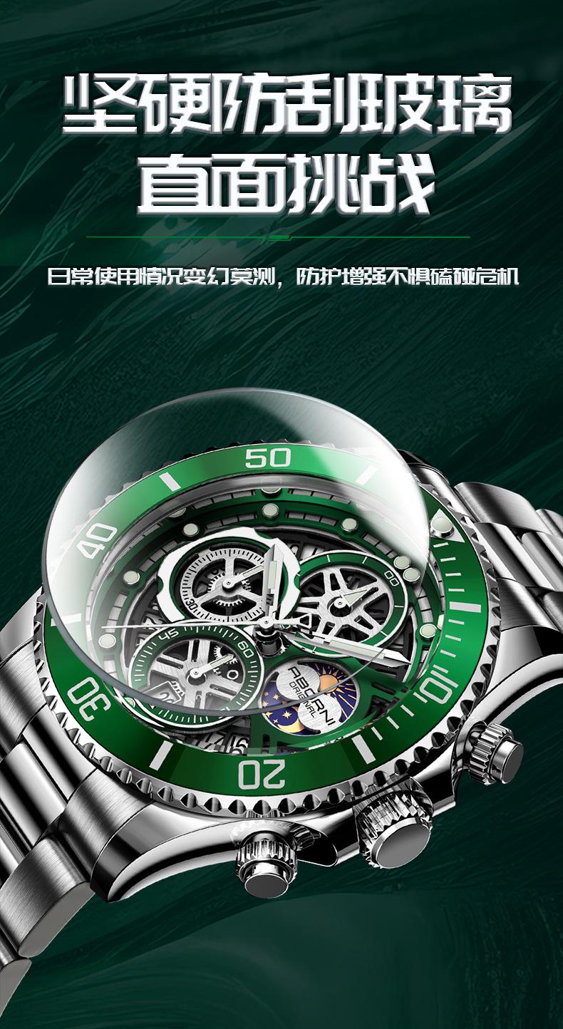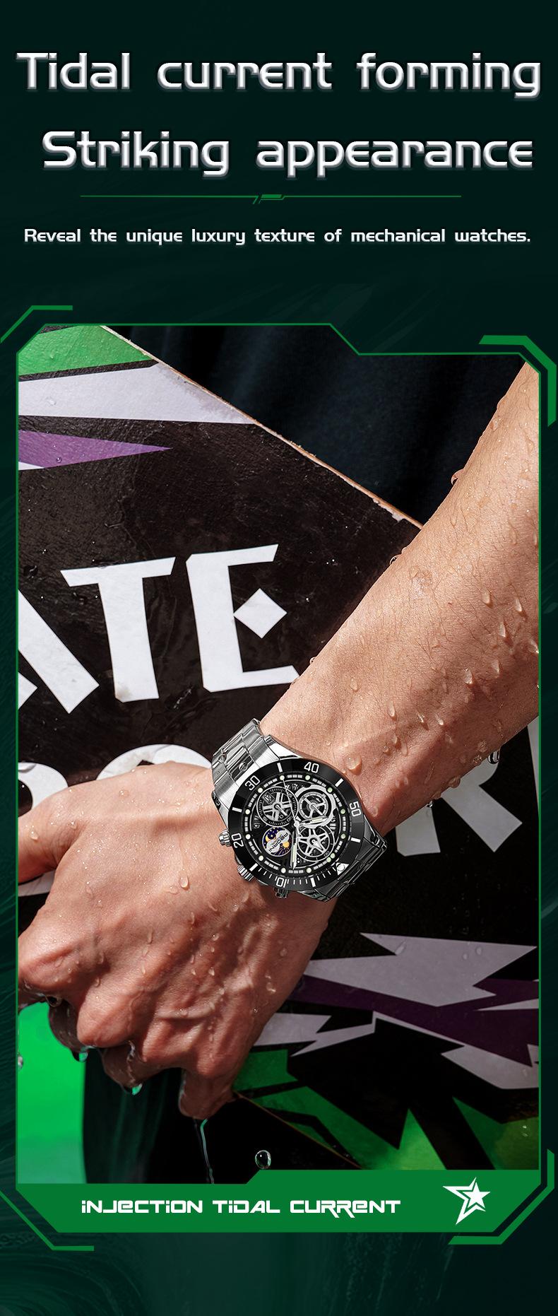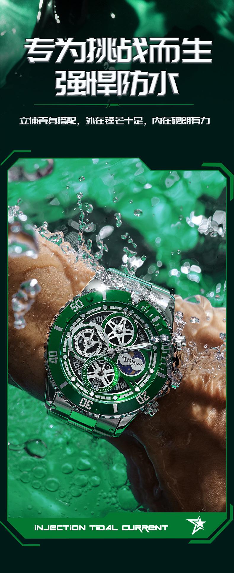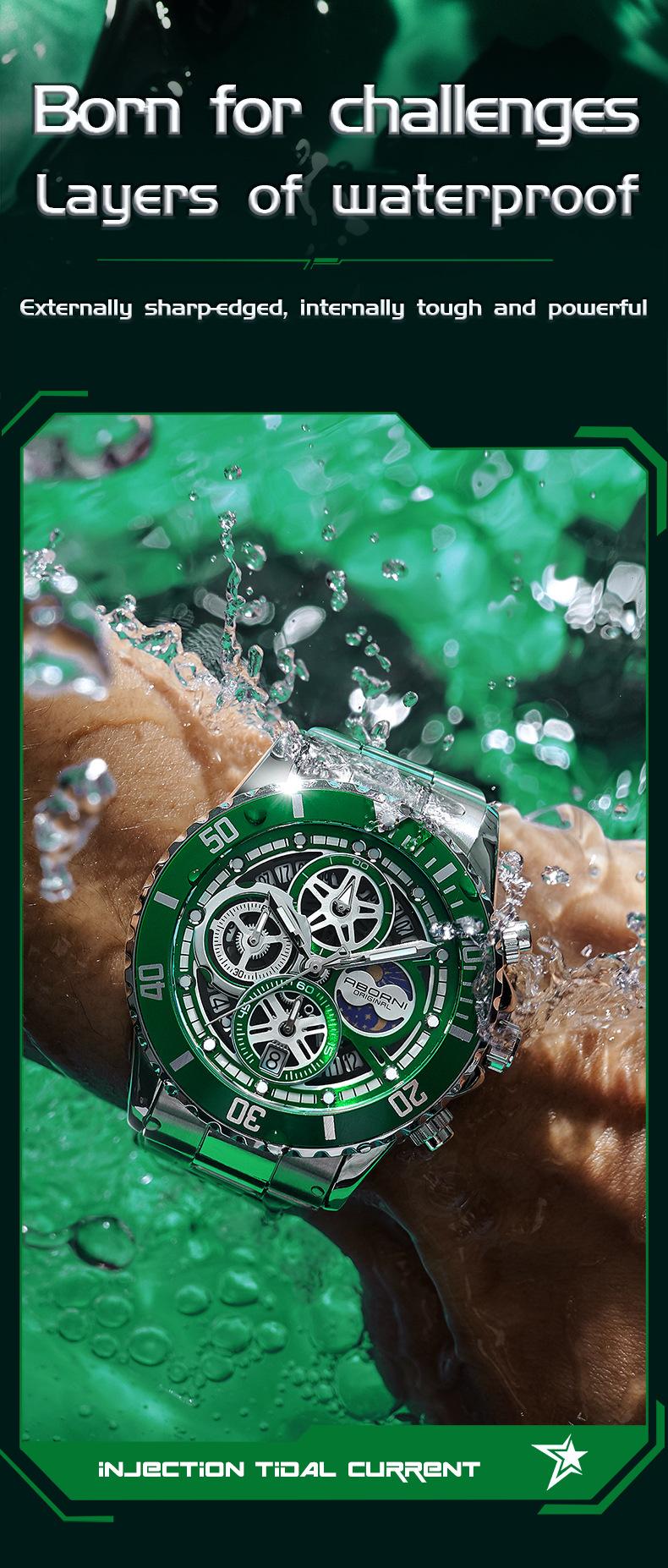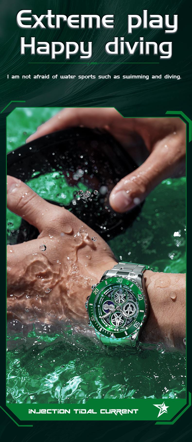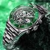 Reloj mecánico hueco de platino con diseño de fantasma de agua verde, calendario luminoso, resistente al agua, multifuncional, de cuarzo, para hombre.